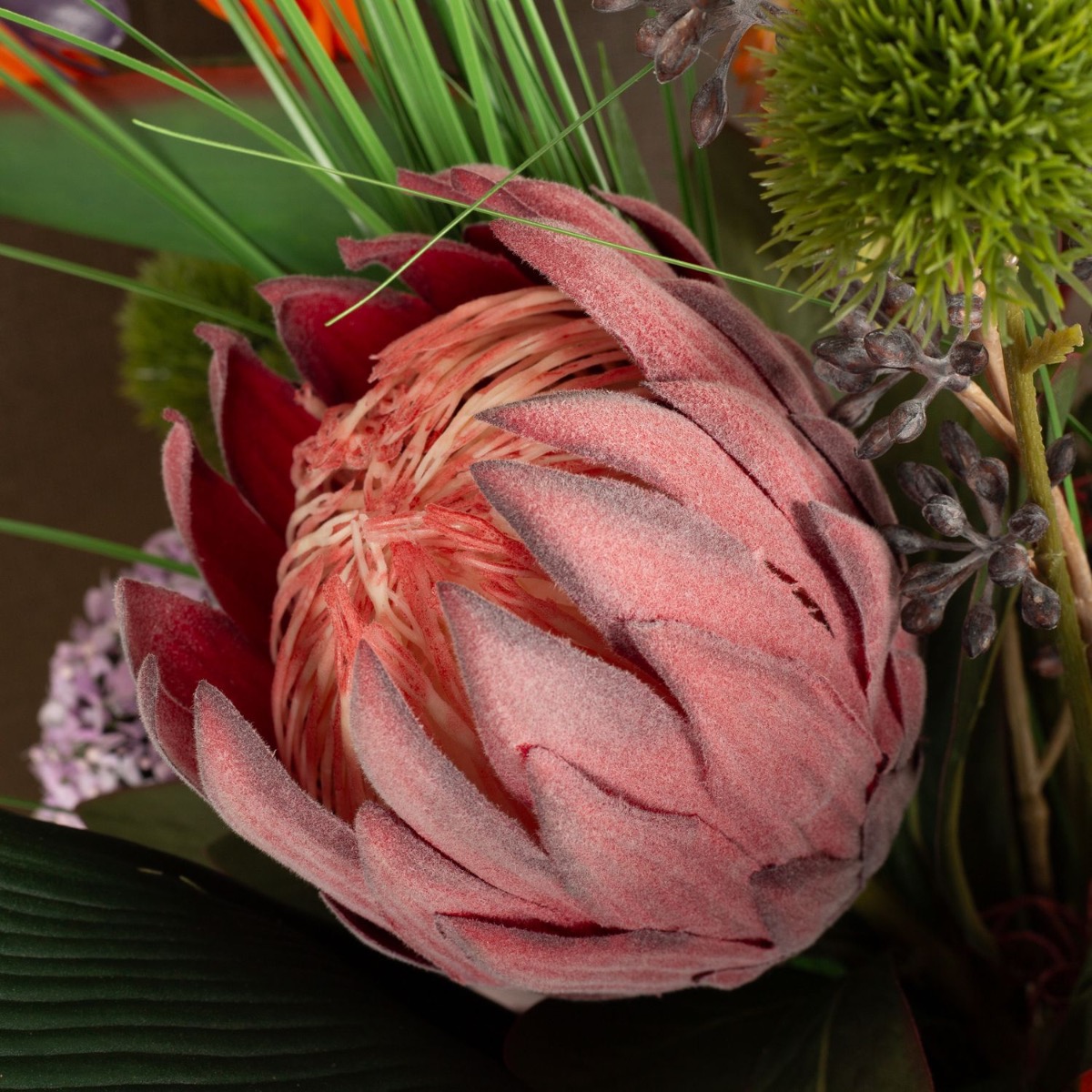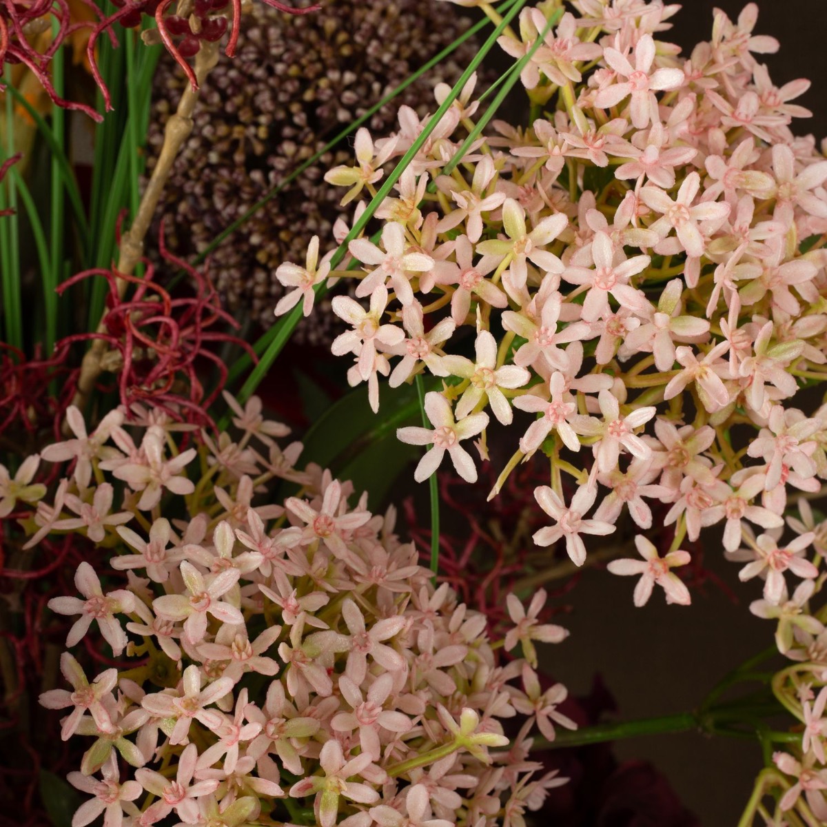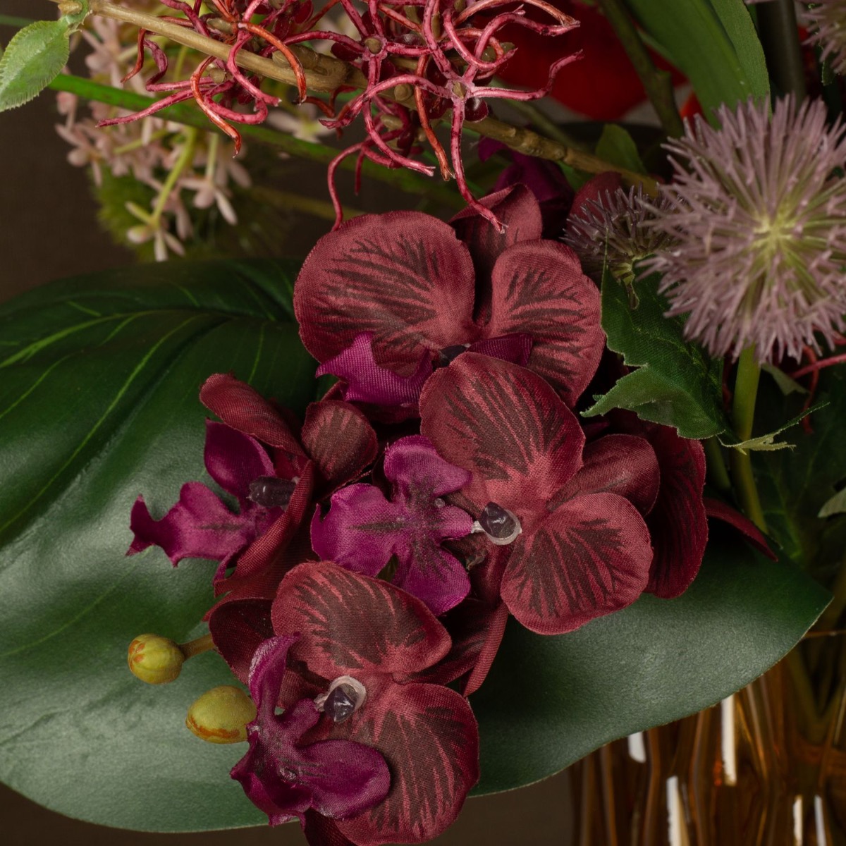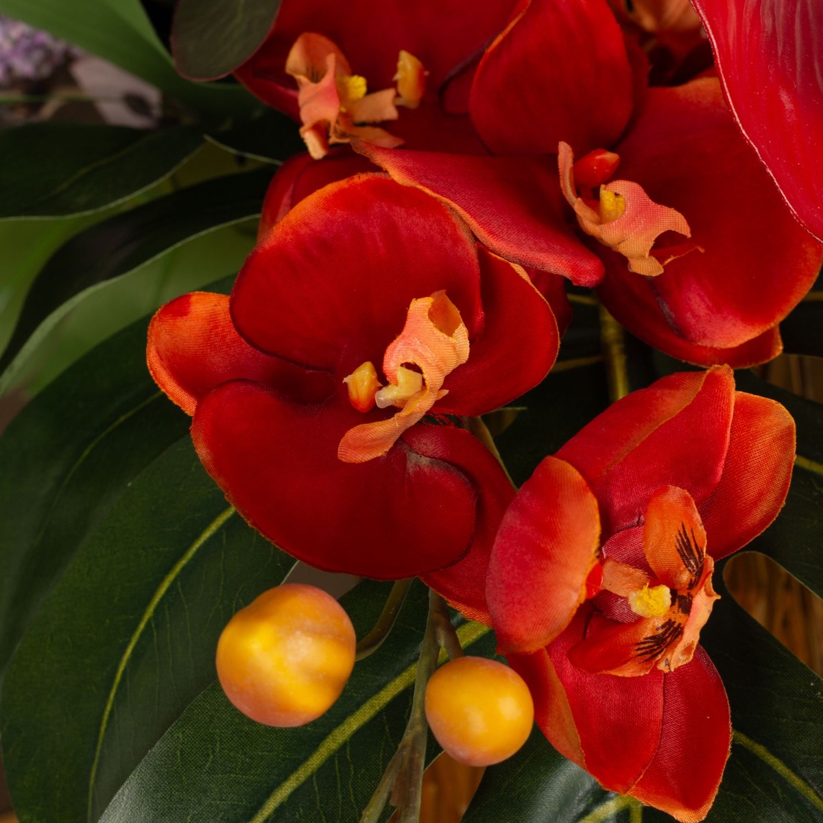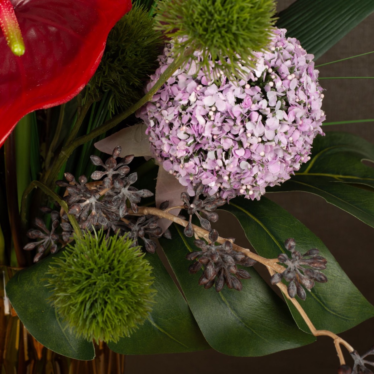 Strelitzia and monstera! A combination that makes every bouquet look exotic. Anthurium, orchids and a red-hot poker shine in vibrant shades of red and orange and bring colour to life. The yellow-orange coloured vase creates an extraordinary play of light with its structure and makes the bouquet shine. Shop the look!