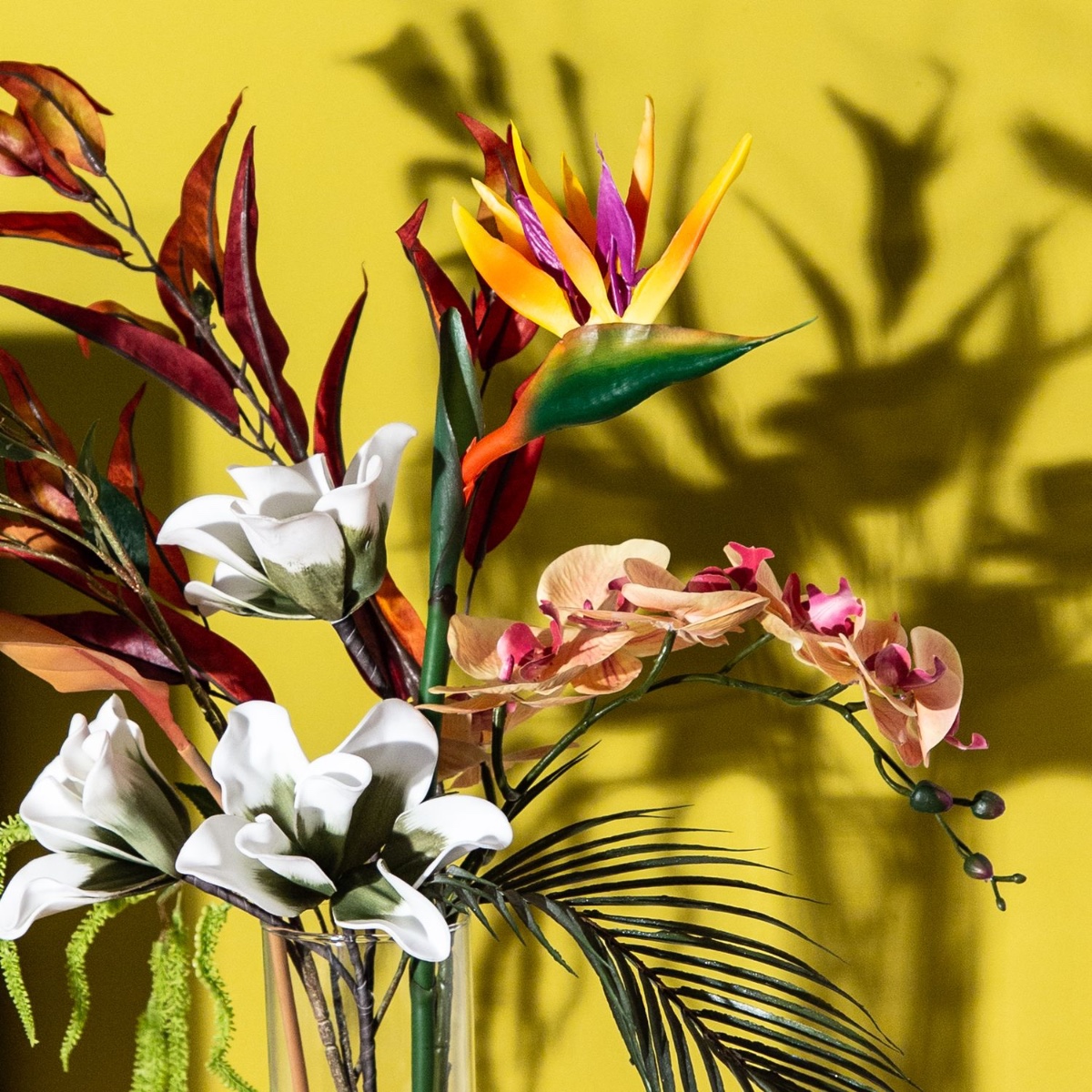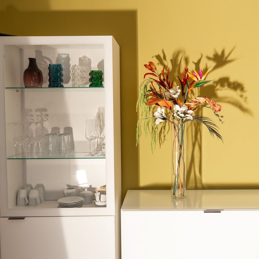 Tropical, colourful and magically beautiful! This arrangement of a few primary flowers creates an enchanting ensemble, especially when placed in a location where the sunlight shining in throws shadows onto the wall. The strelitzia is the centrepiece of the bouquet and protrudes above the other beauties, such as the apricot-coloured orchid and the white magnolia. The fiery red eucalyptus, amaranth and strelitzia leaf complement the bouquet and are just as beautiful as the blooming elements. Shop the Look!