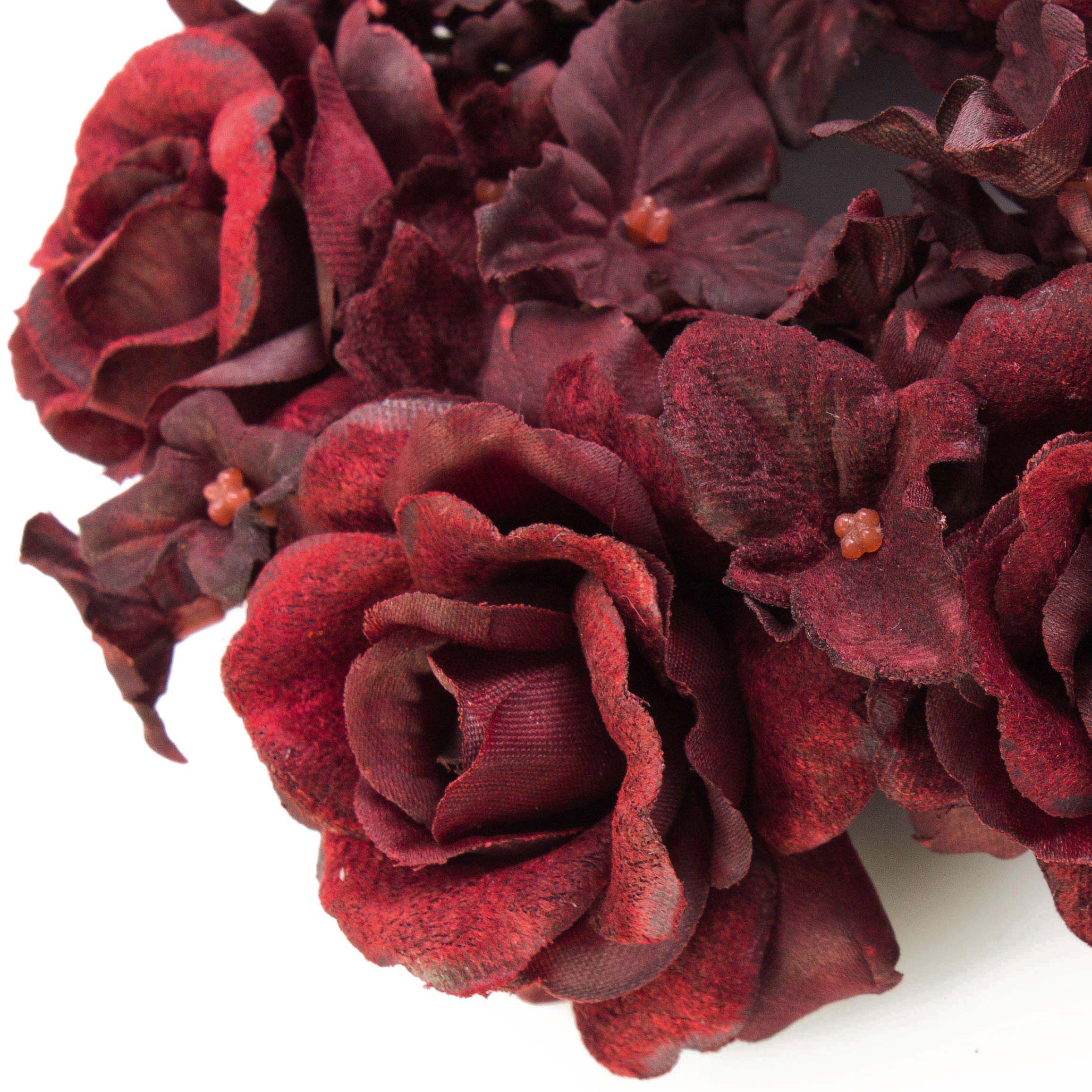 Large artificial candle ring INGA with rose heads and hydrangea flowers in colour dark red with an outer diameter of approx. 15 cm. Ideal for a romantic decoration experience.