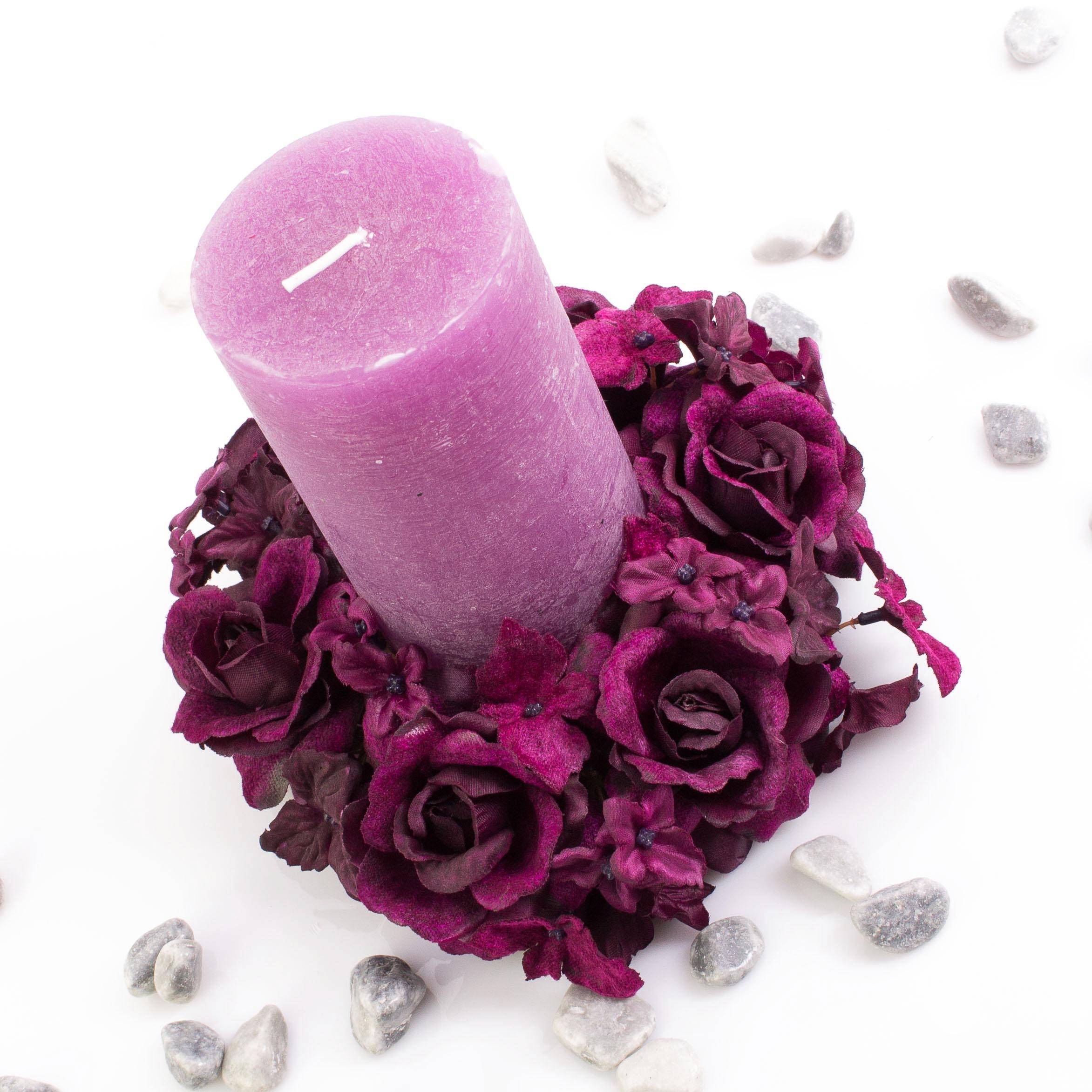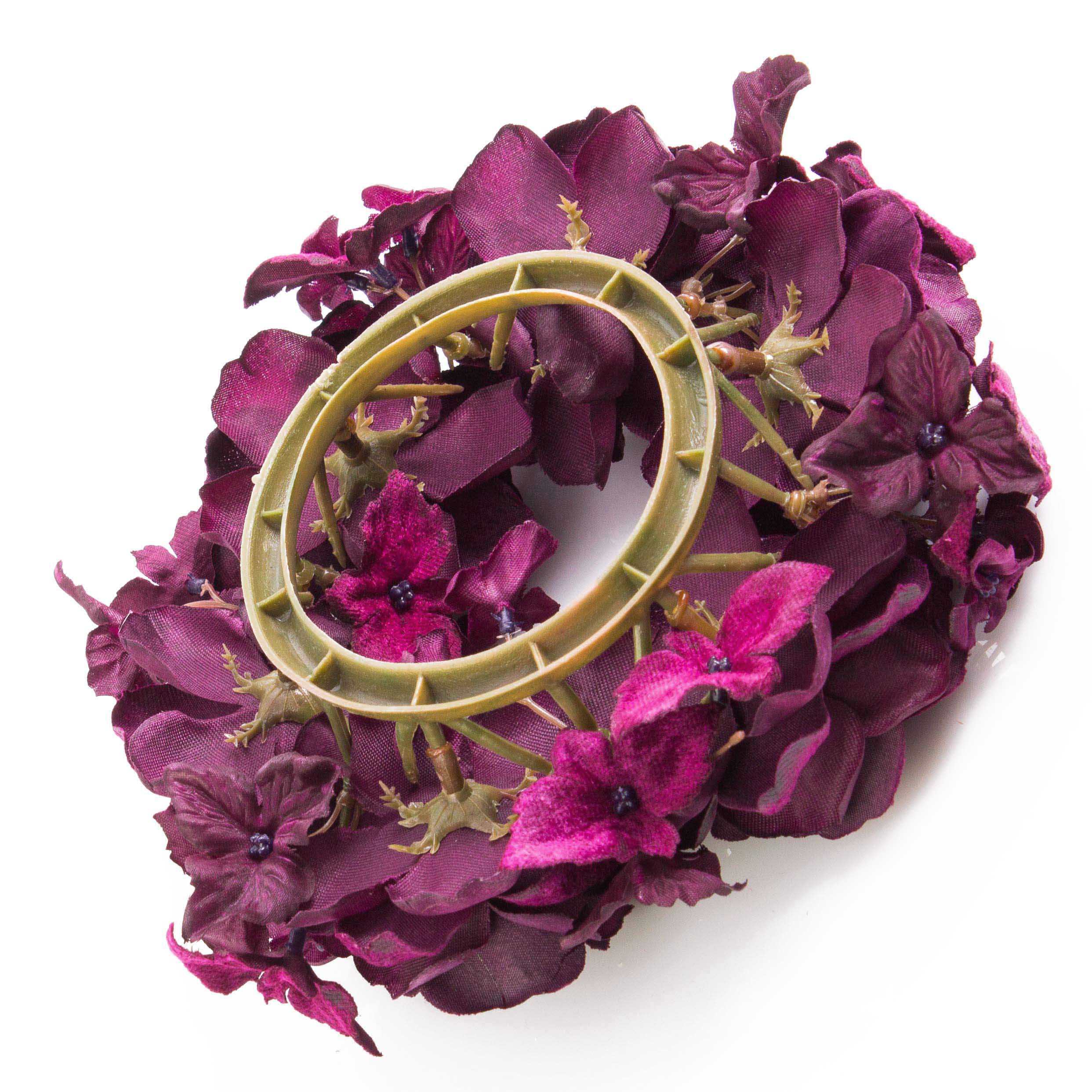 Large candle ring INGA with artificial rose heads and hydrangea blossoms in purple with an outer diameter of approx. 15 cm. Ideal for a festive table decoration.