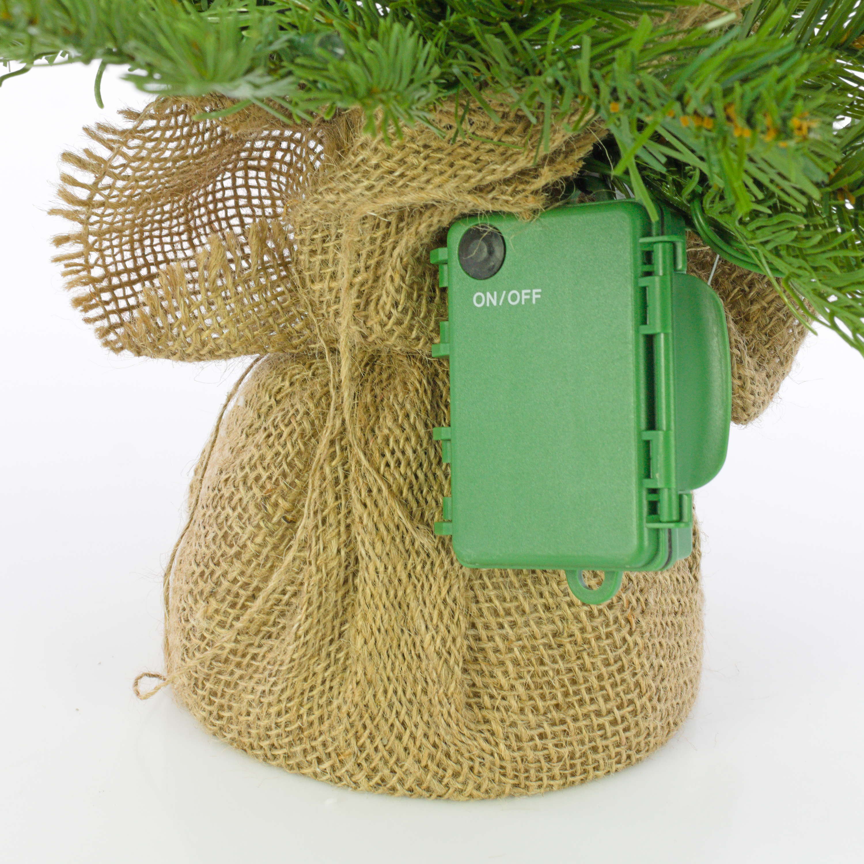 The artificial Christmas tree WELLINGTON with the height of approx. 24"/60 cm and the diameter of approx. 20"/50 cm is delivered in a brown jute bag. Approx. 35 lights are attached to the numerous green artificial coniferous branches. The green coniferous branches are bendable, so that the arranging of the fir branches into the desired position can be carried out easily.