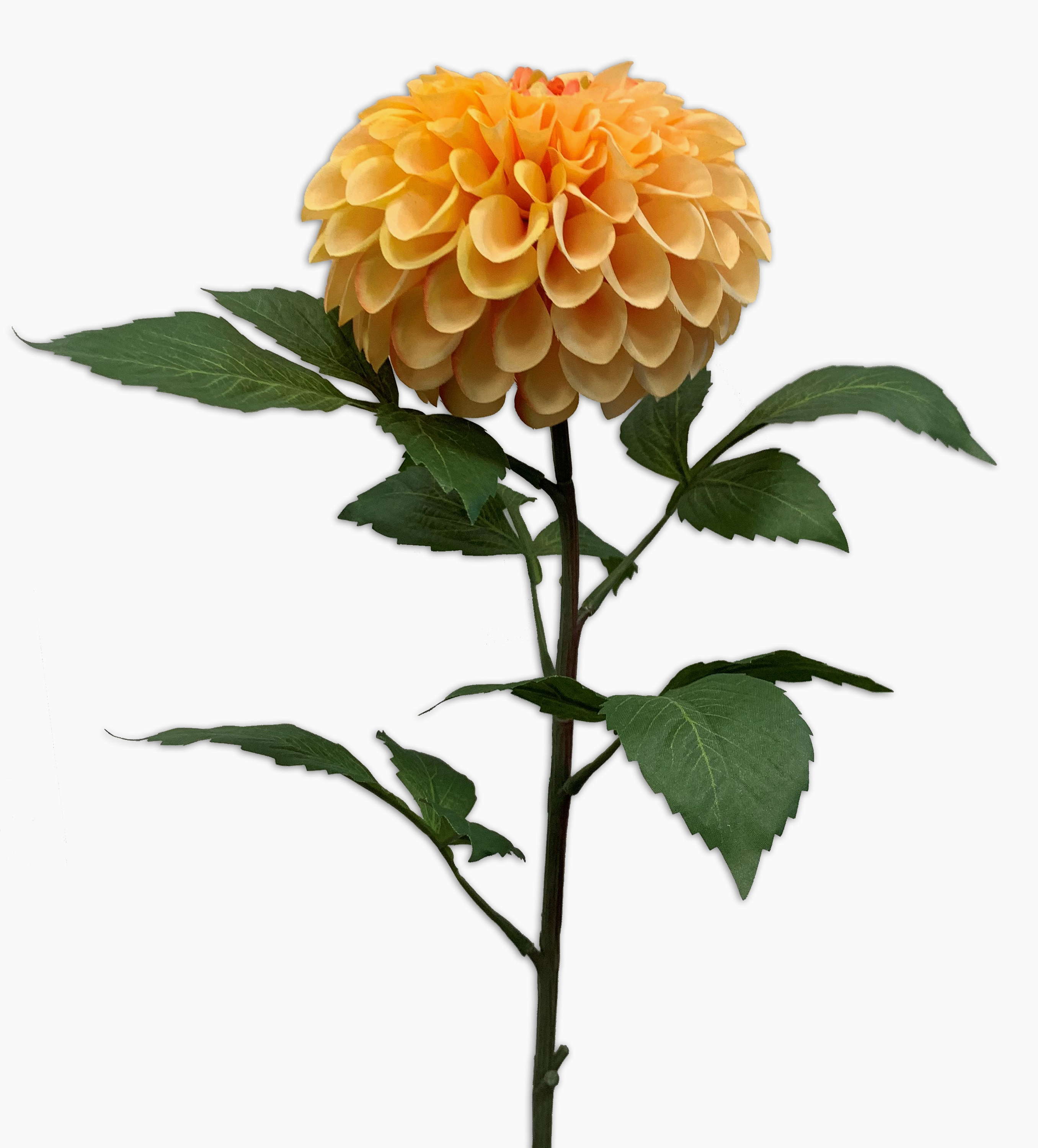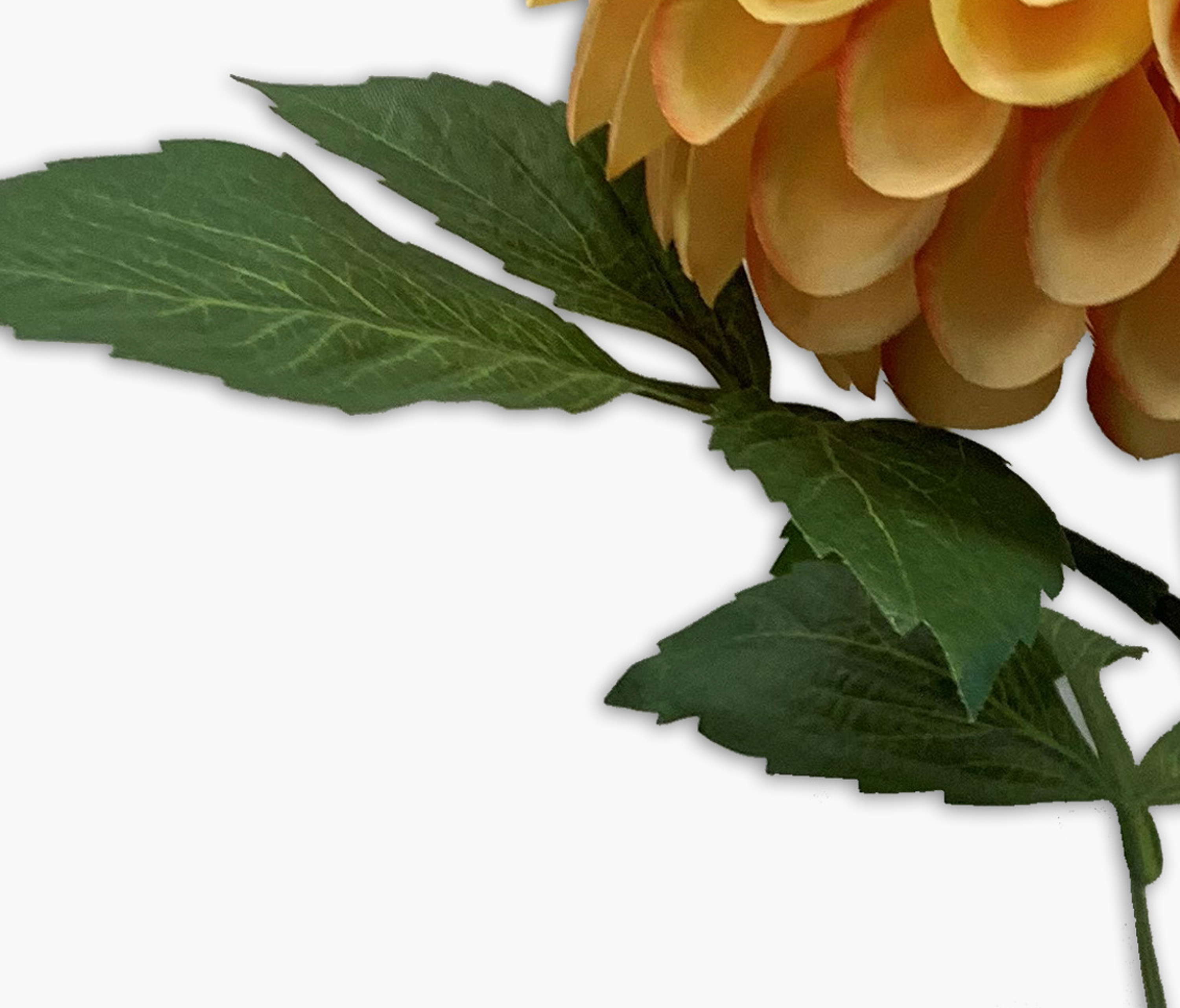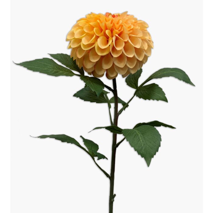 The artificial dahlia MILEYA in colour yellow is attached to a stem and has a length of approx. 75 cm.