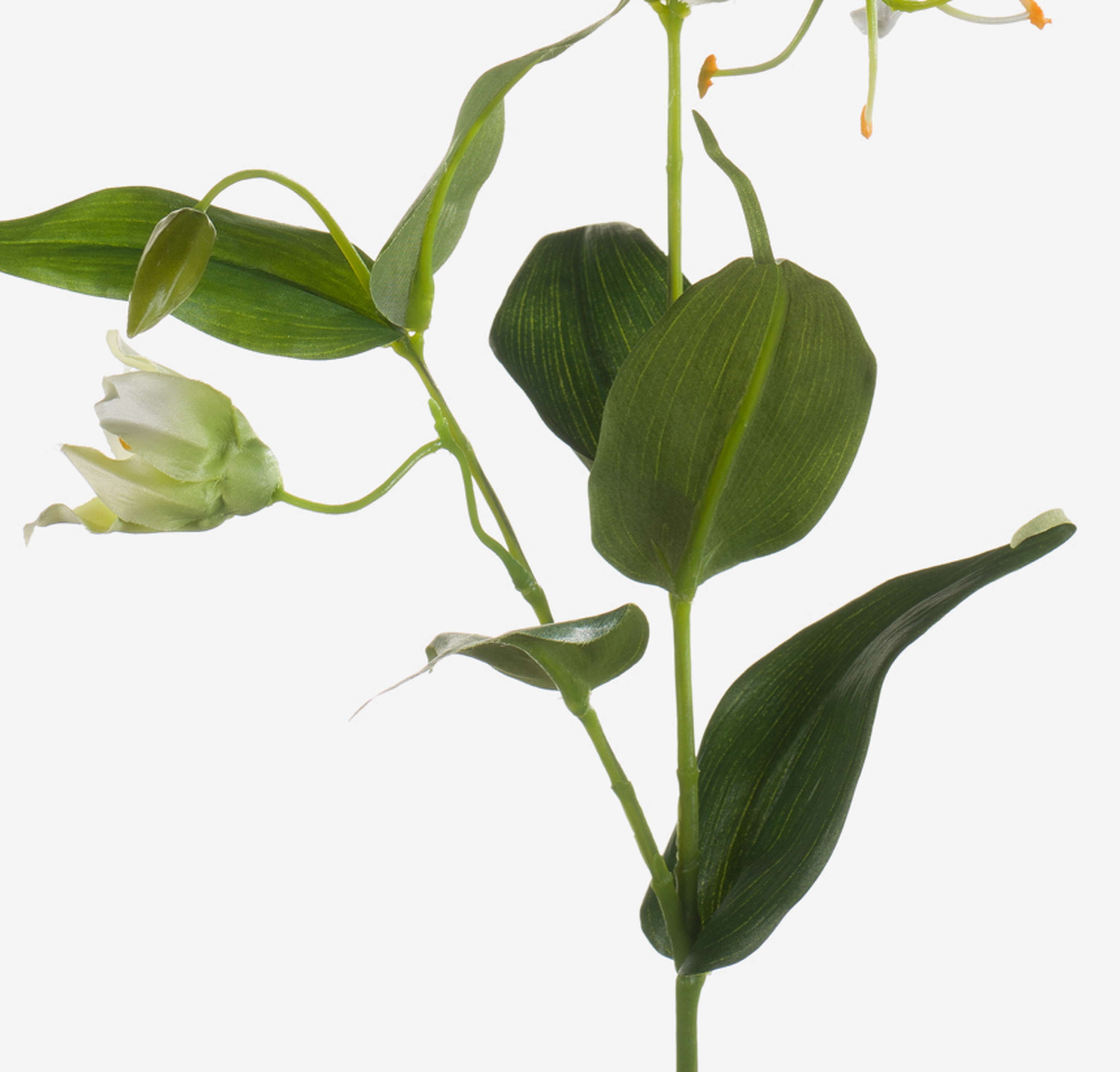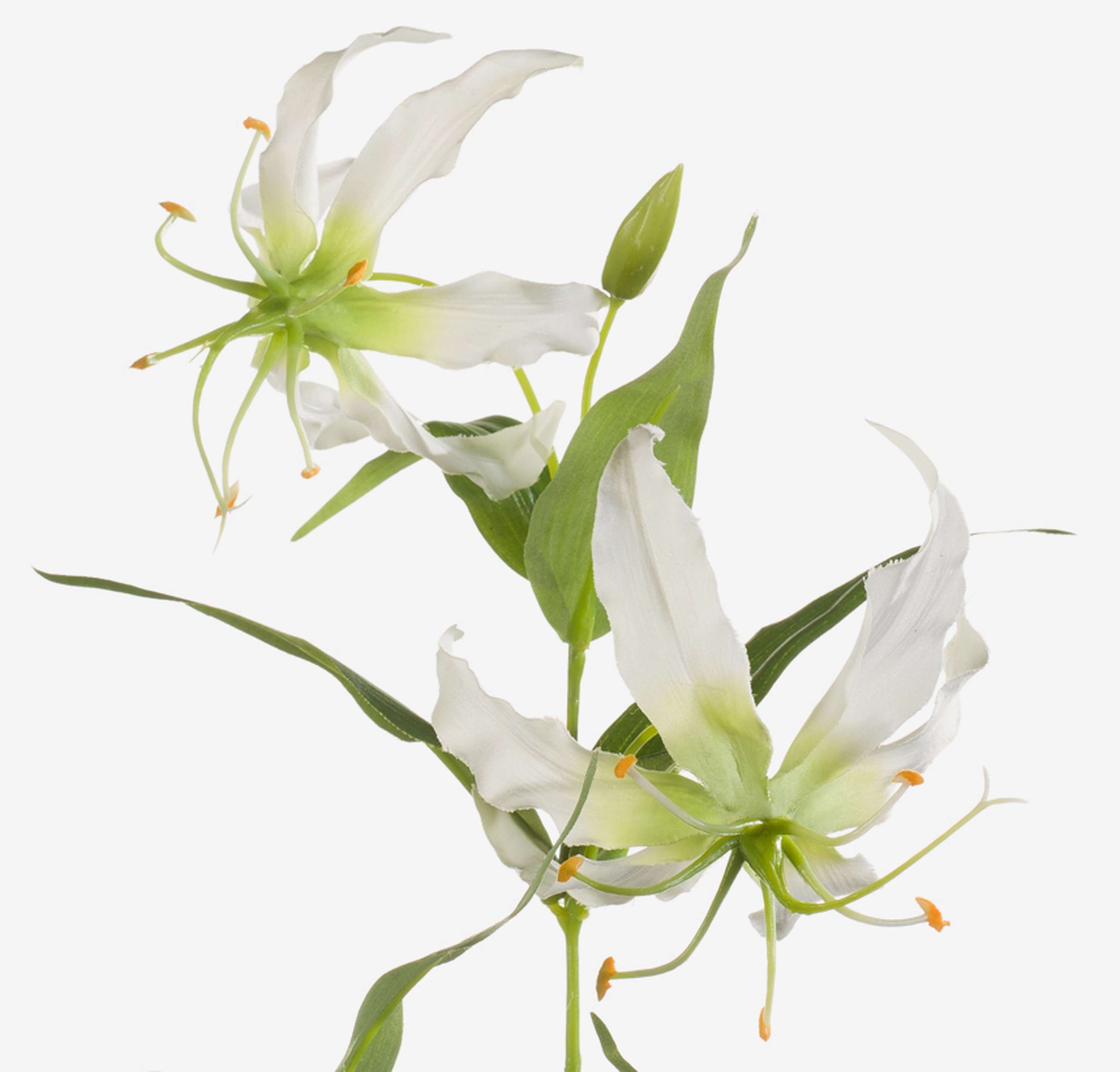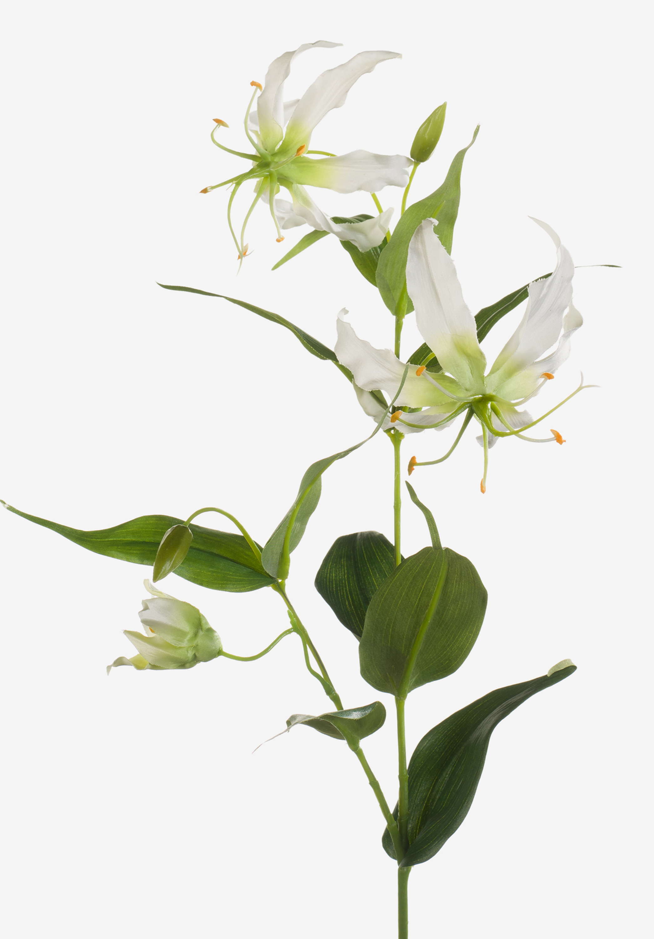 Artificial Gloriosa FUJITA with 2 large cream and green-coloured blooms along with green buds of textile fibre. The artificial flower with its dark green leaves measures approx. 31"/80 cm in length.