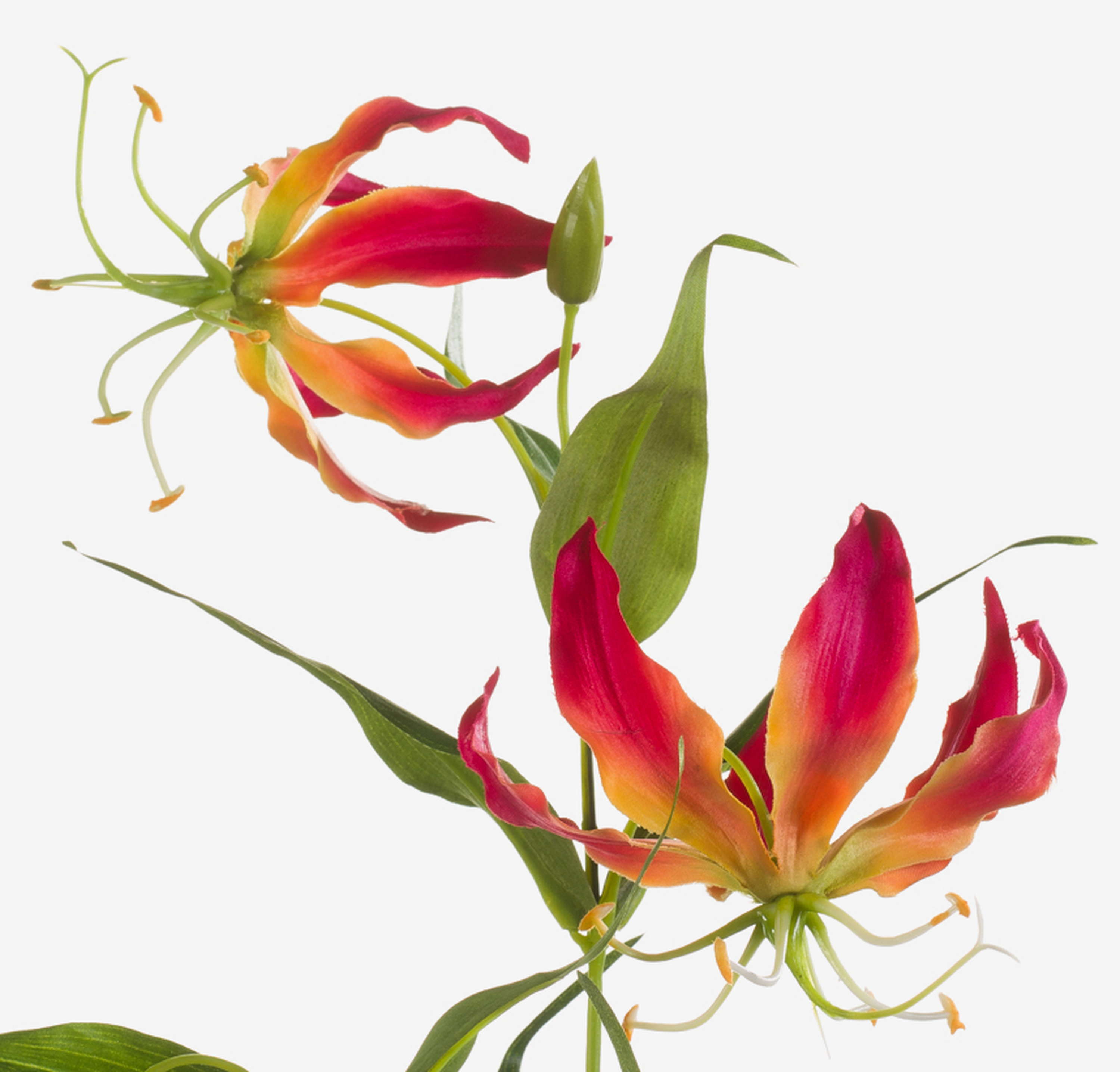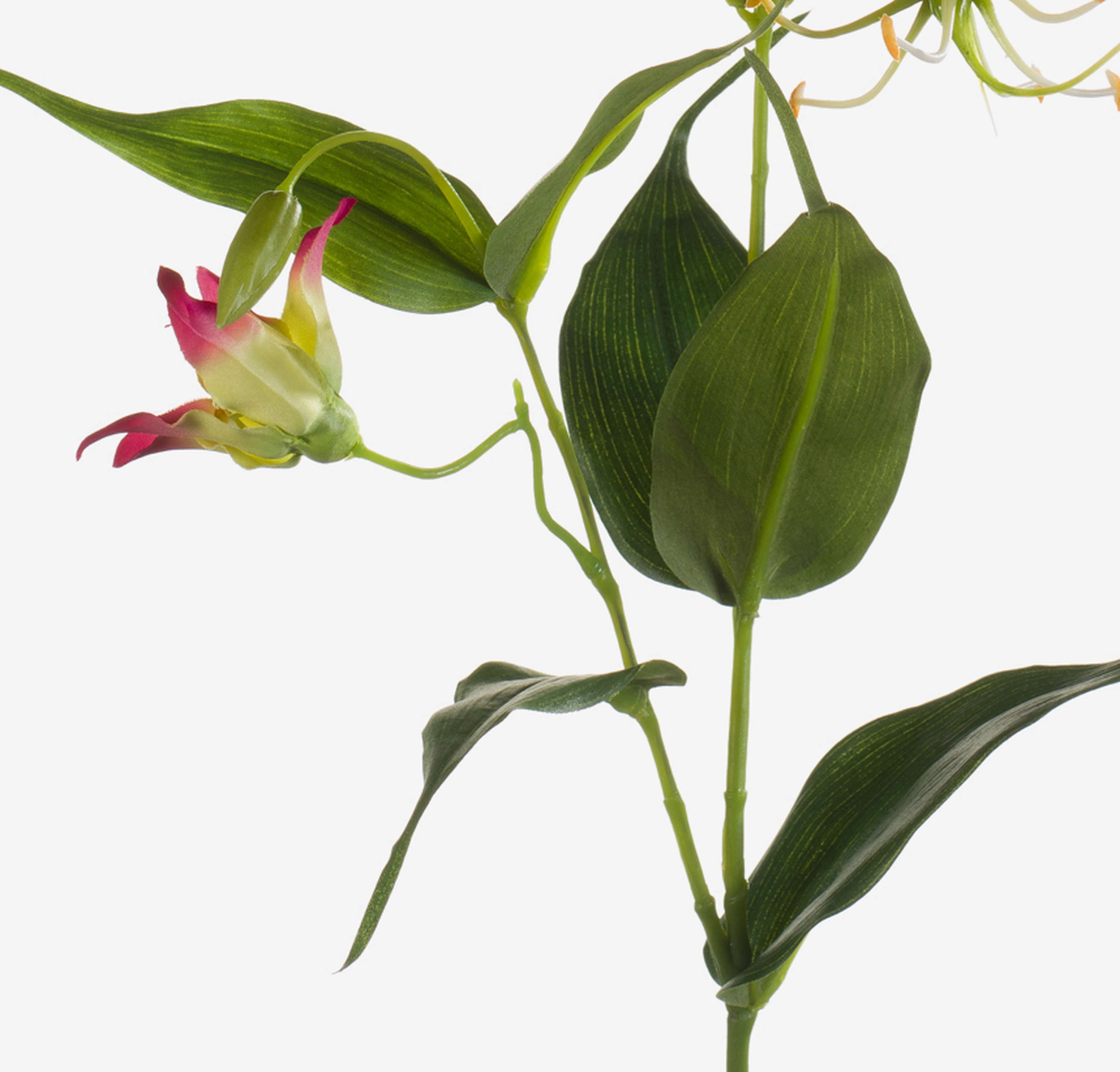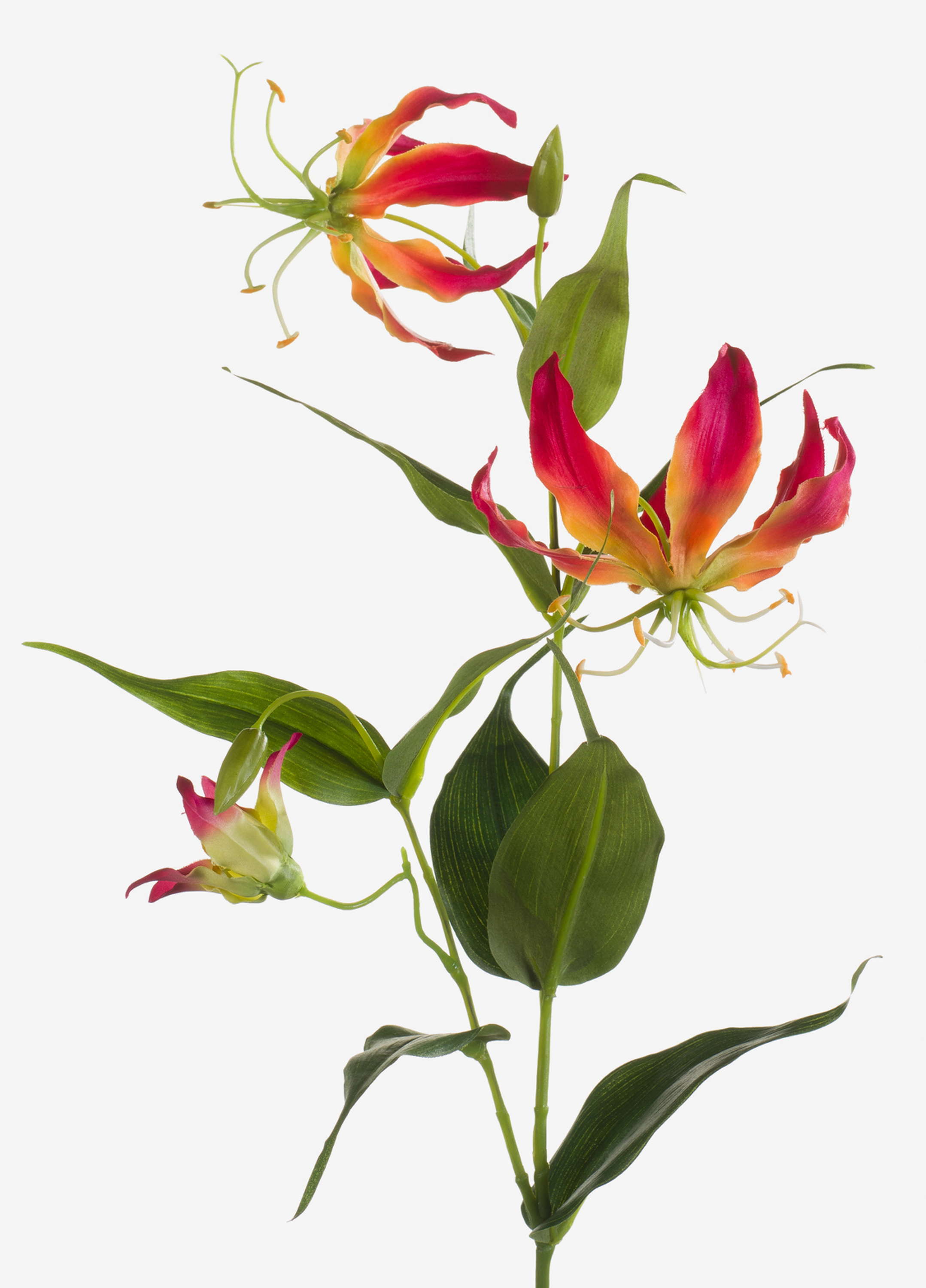 Artificial Gloriosa FUJITA with 2 large pink-yellow blooms and buds from textile fibre. The artificial flower with its dark green leaves measures approx. 31"/80 cm in length.
