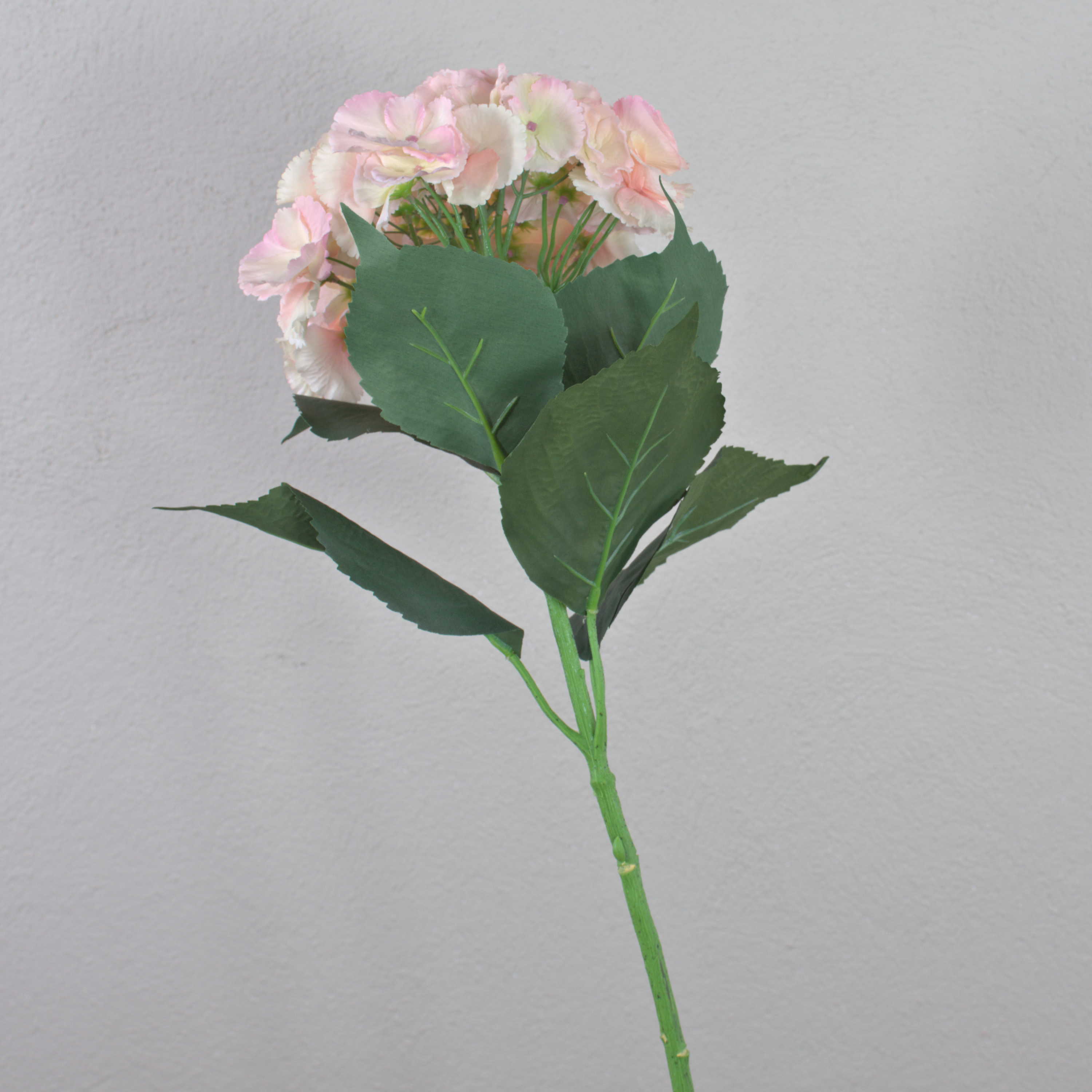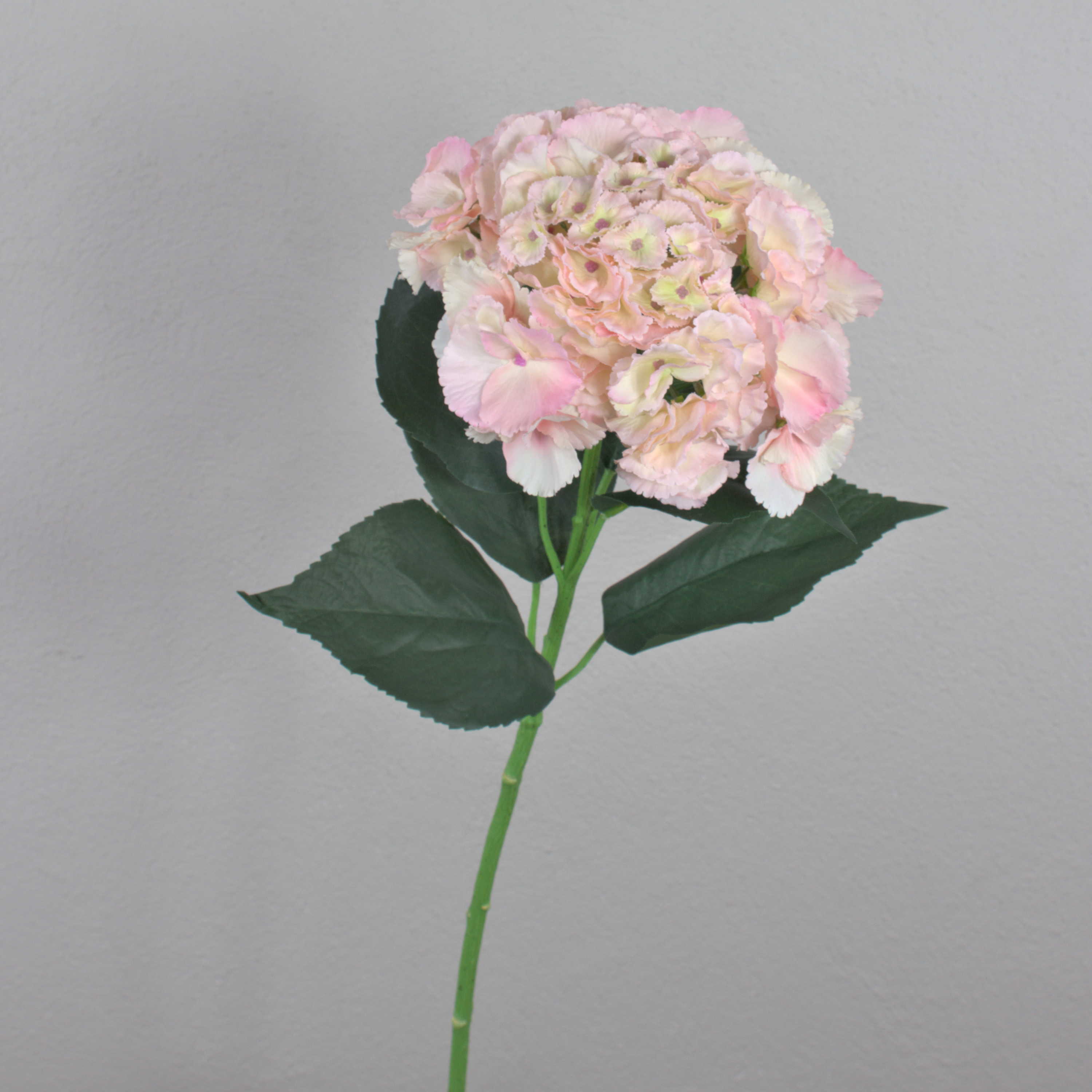 The pink-green coloured hydrangea artificial flower is 28"/ 70cm long. The silk flower is beautiful to look at individually or in a bouquet.