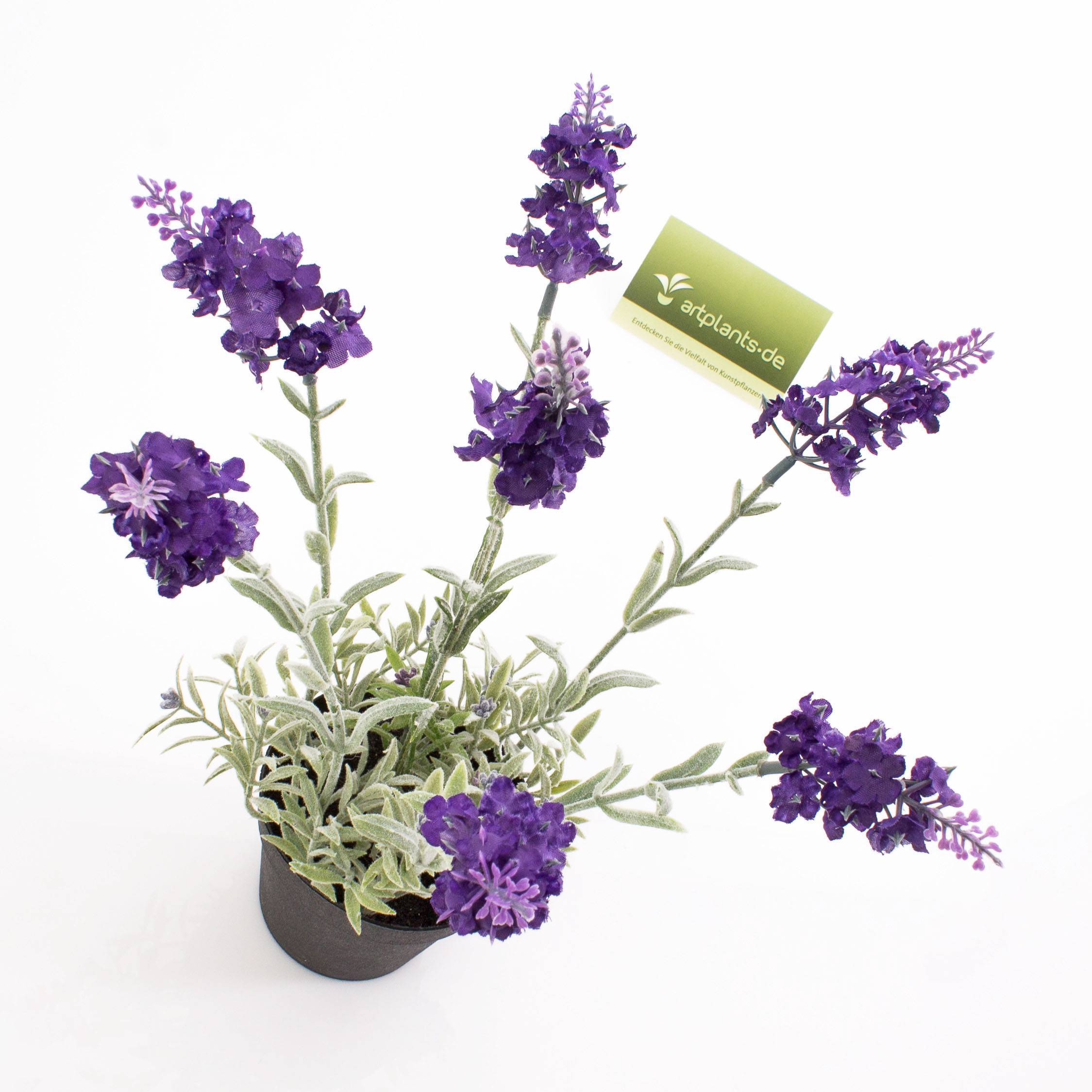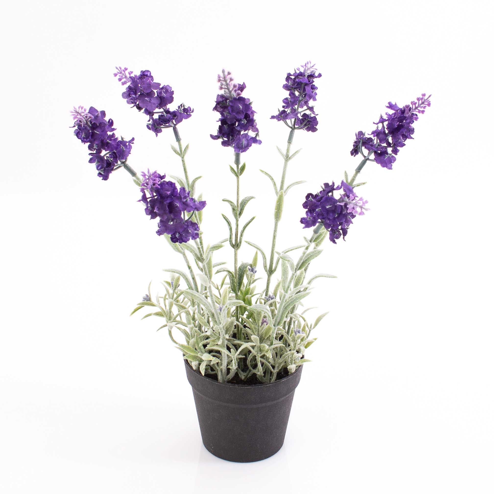 Artificial lavender plant LOUISA in a black pot of plastic with a top covering of black decorative soil. The potted plant stands approx. 11"/29 cm high.