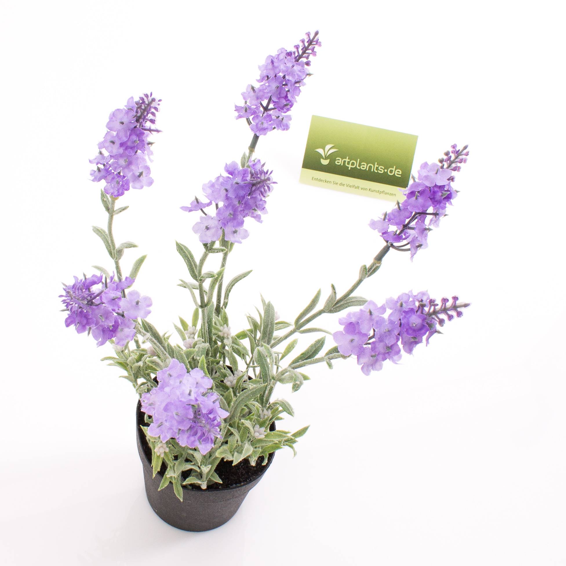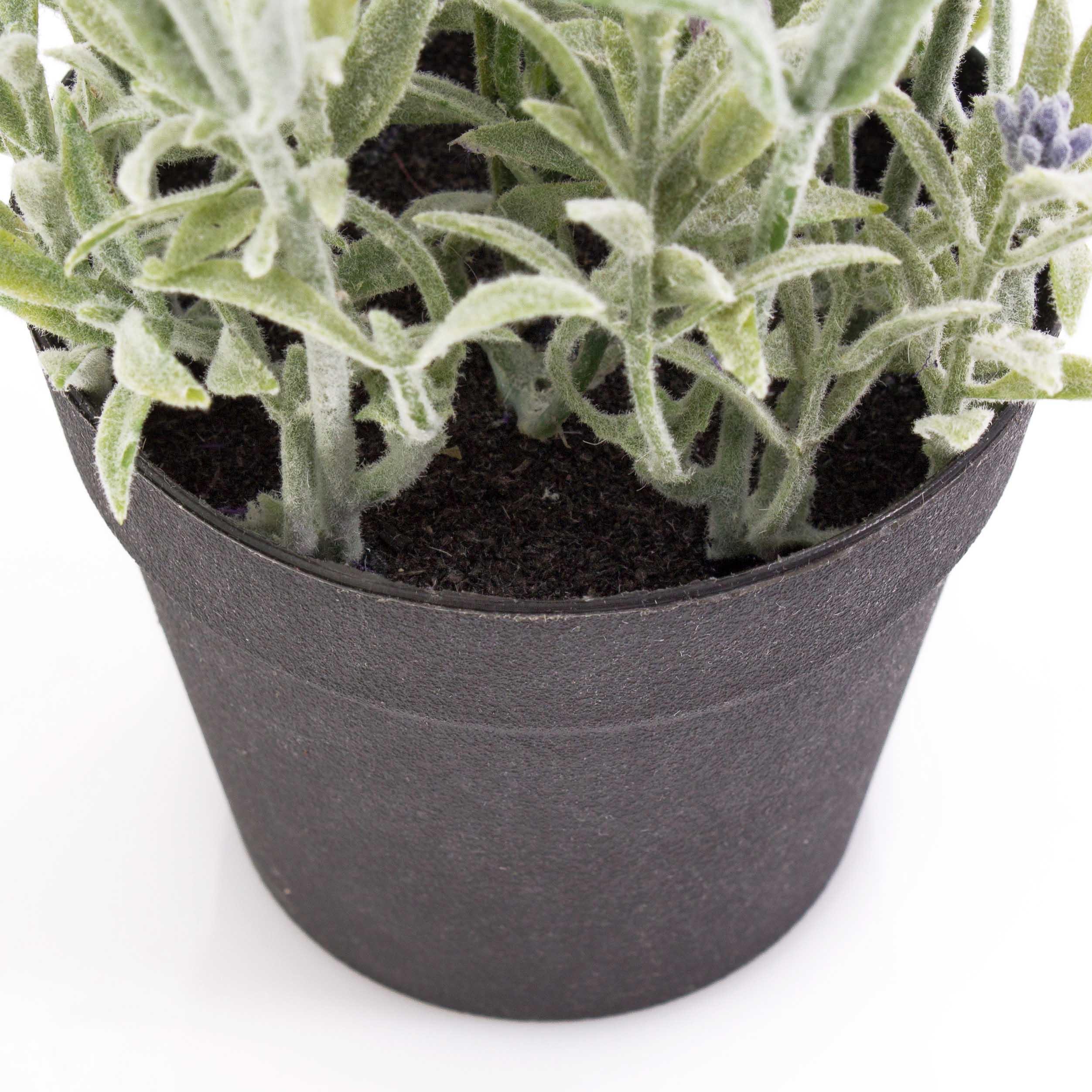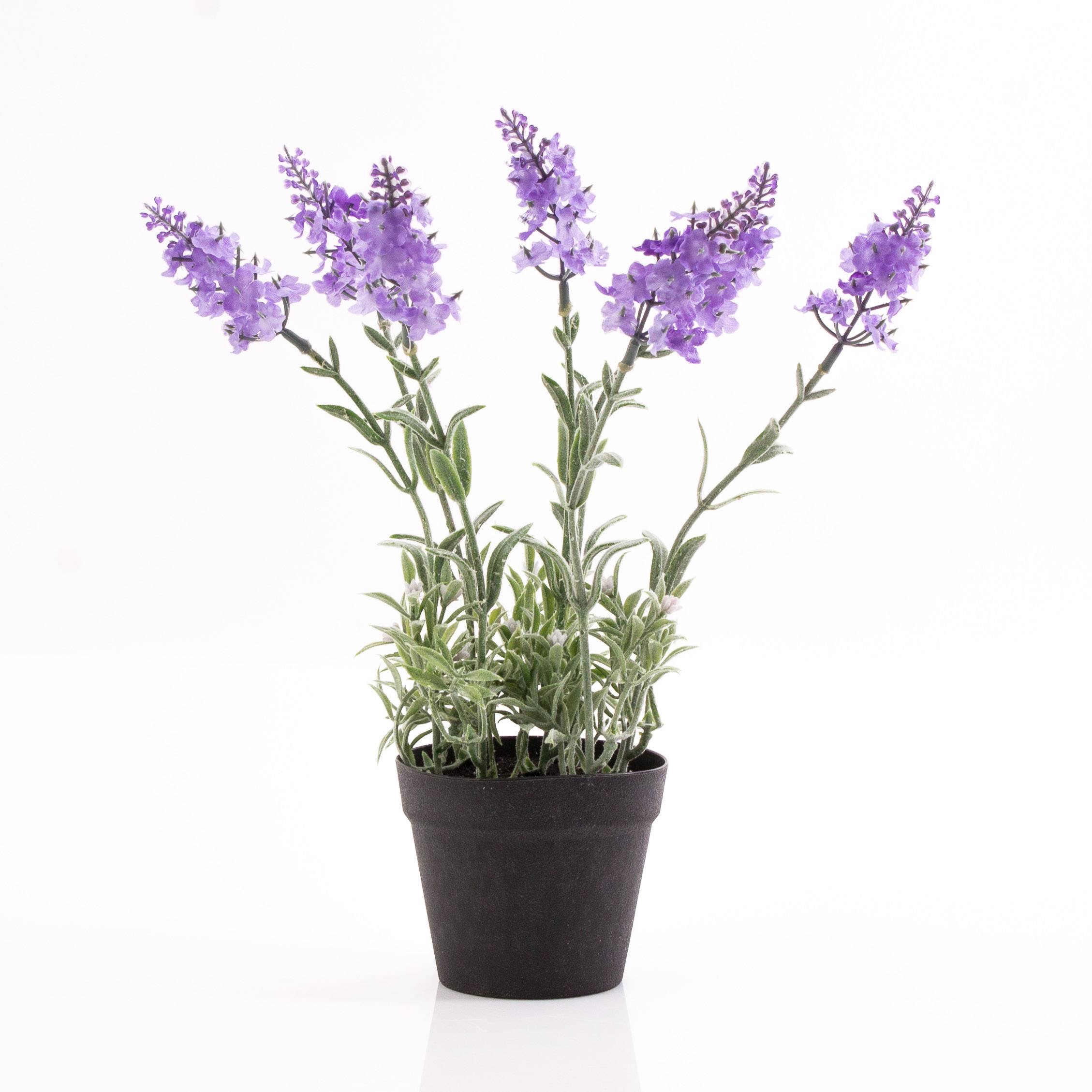 Artificial lavender plant LOUISE in a black pot of plastic with a top covering of black decorative soil. The potted plant stands approx. 11"/29 cm high.