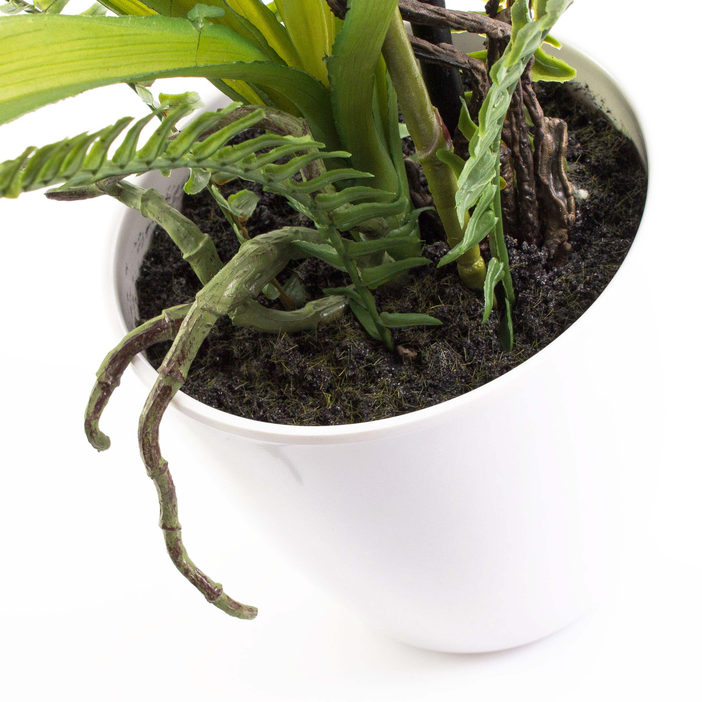 - High-quality crafted leaves along with aerial roots, several leaves of fern and a corkscrew spray