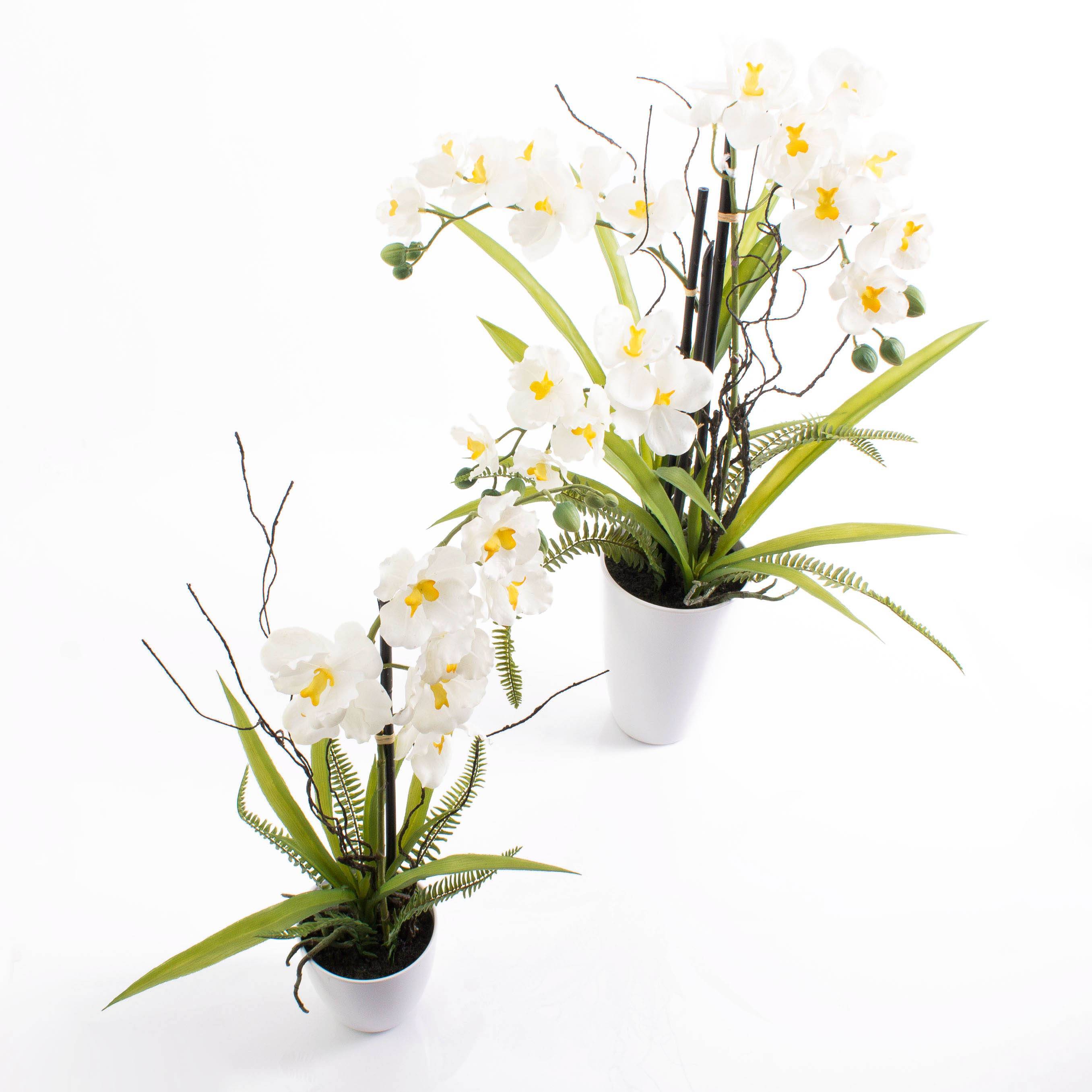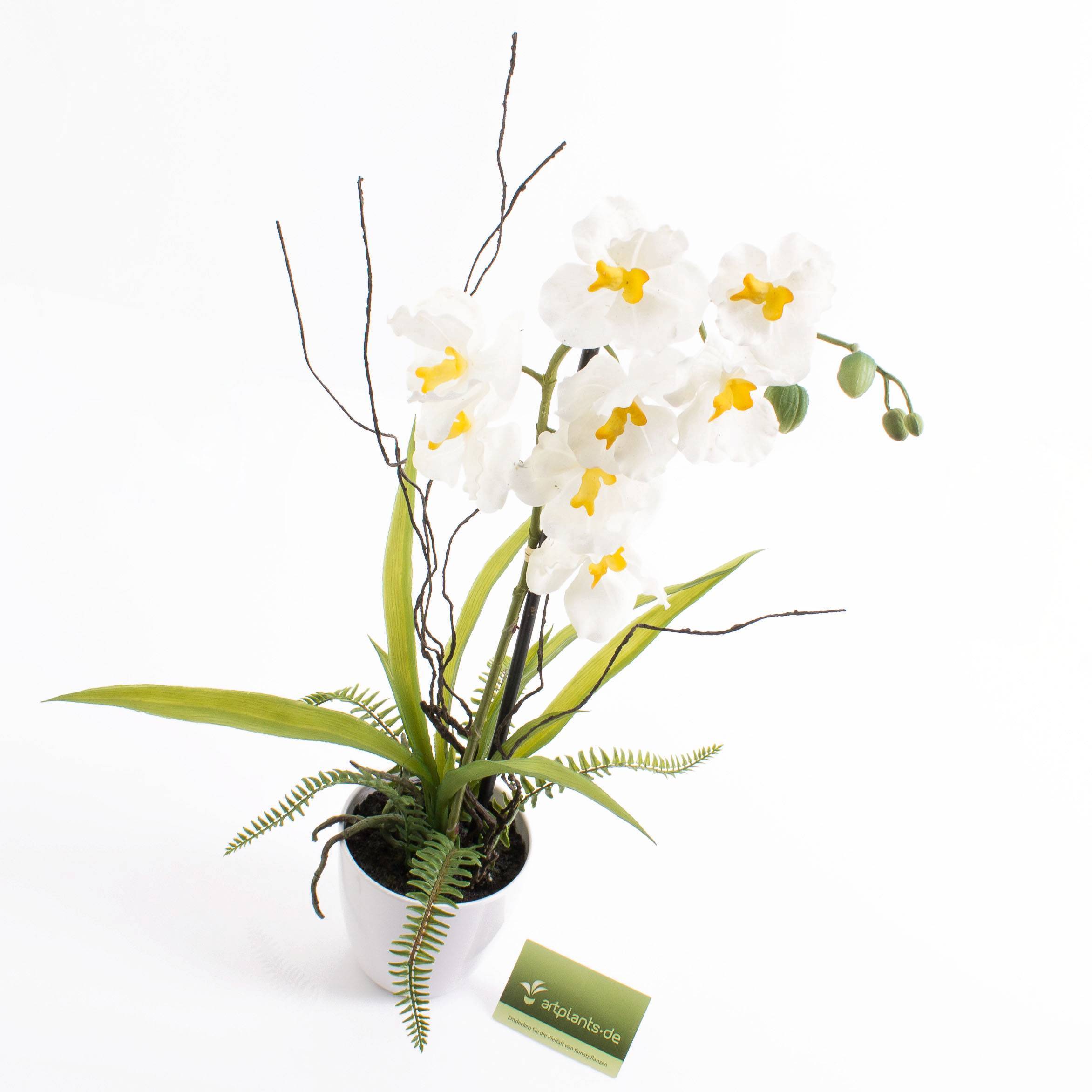 Artificial phalaenopsis orchid MELINA in flower colour white. This artificial orchid stands approx. 26"/65 cm high and is delivered in a beautiful white decorative pot.