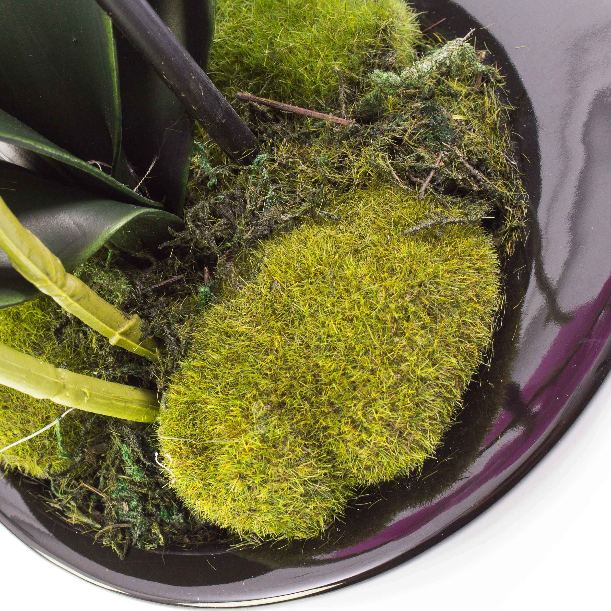 - round decorative pot in colour black high-gloss covered with artificial moss