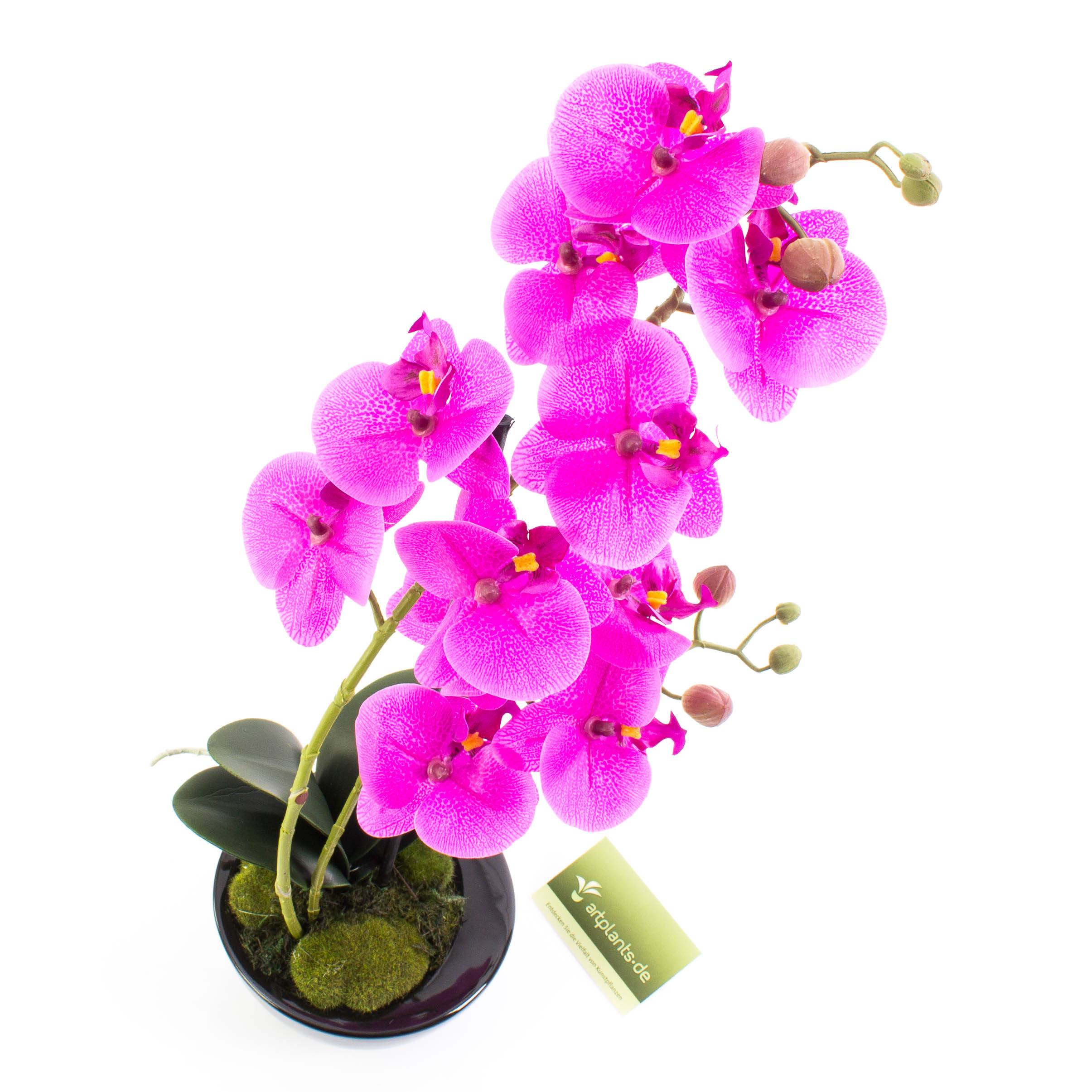 Artificial Phalaenopsis orchid MELINA in flower colour purple. The artificial orchid stands approx. 18"/45 cm high and is delivered in a beautiful black decorative pot.