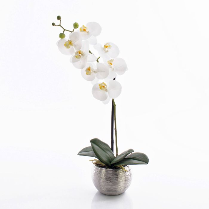 Fake orchid EMILIA in an elegant silver-coloured pot with a textured surface. With a height of approx. 45 cm, the artificial flower will make an ideal gift, or it can also be used for decorating the wall shelf and many other ideas.