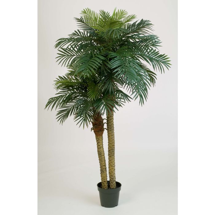 Duo of artificial Phoenix Palms CAMILA has fake trunks and a total of 55 palm fronds. The Palms have a total height of approx. 5ft/150 cm and 7ft/210 cm.