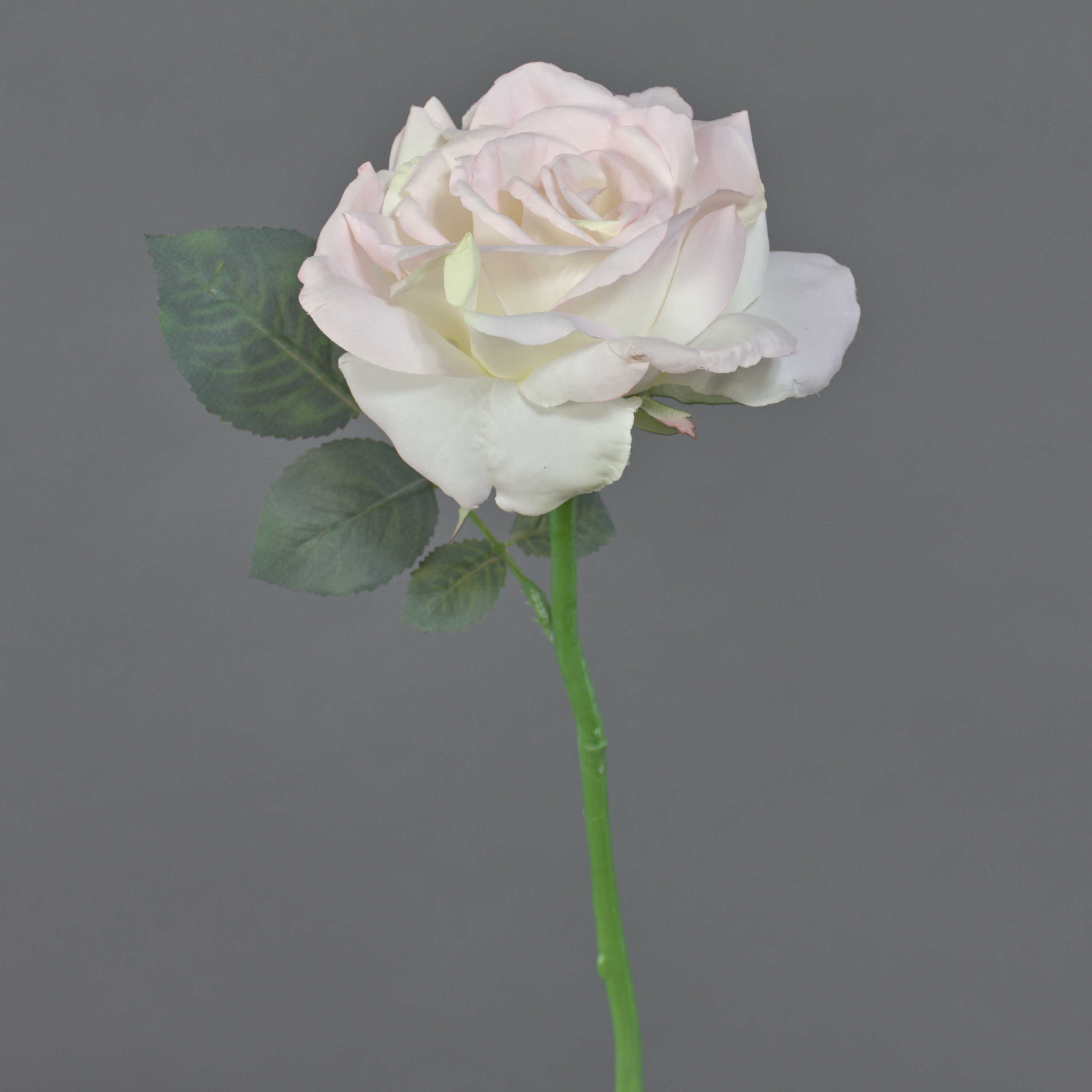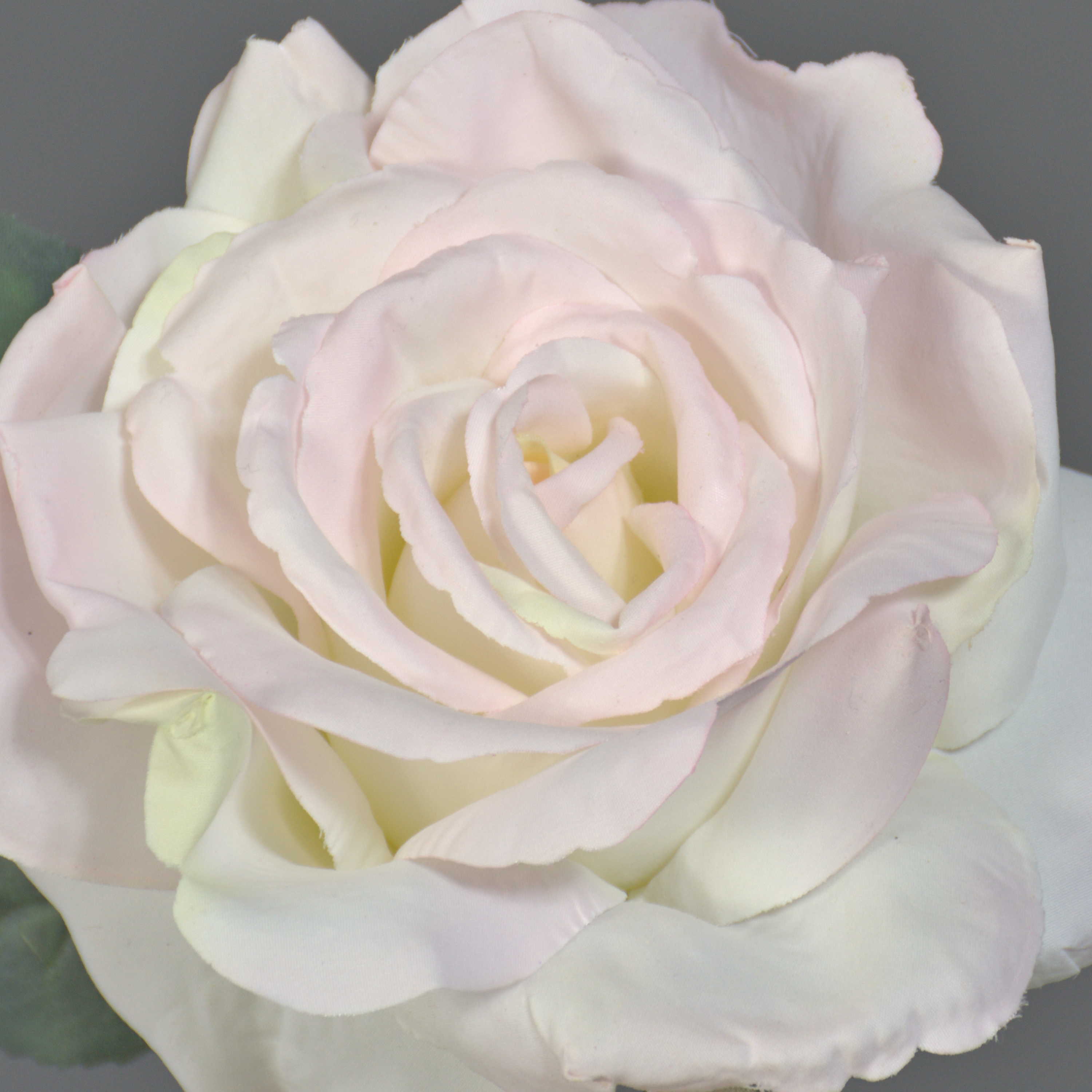 Artificial Rose spray QUINZY with a light pink-coloured bloom in XL and green leaves of textile material. The artificial mini Rose measures approx. 12"/30 cm in length and has a flower diameter of approx. 4.7"/12 cm.