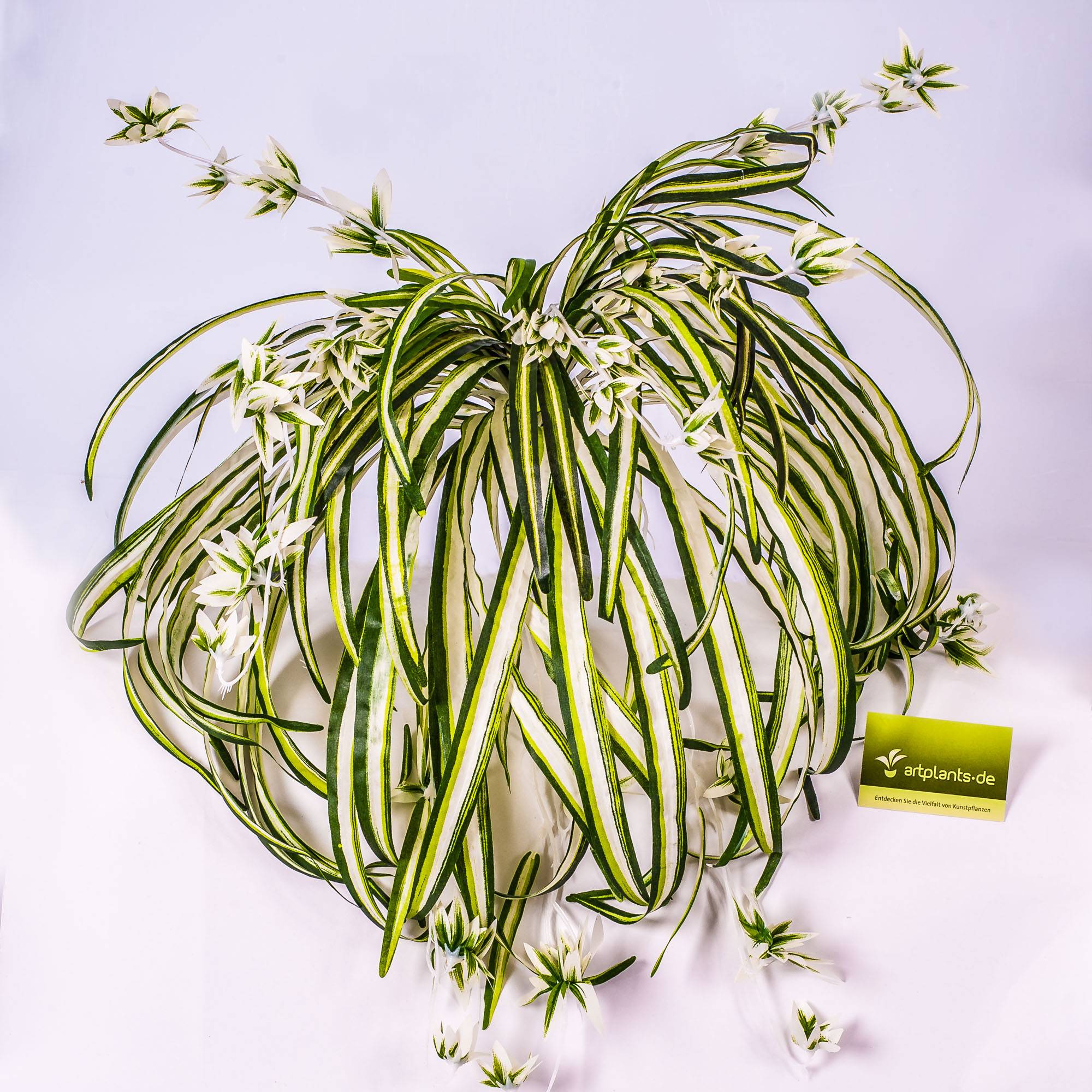 Artificial spider plant (Chlorophytum) with offshoots in leaf colour green-white. The decorative plant measures approx. 16"/40 cm tall and comes on a spike.
