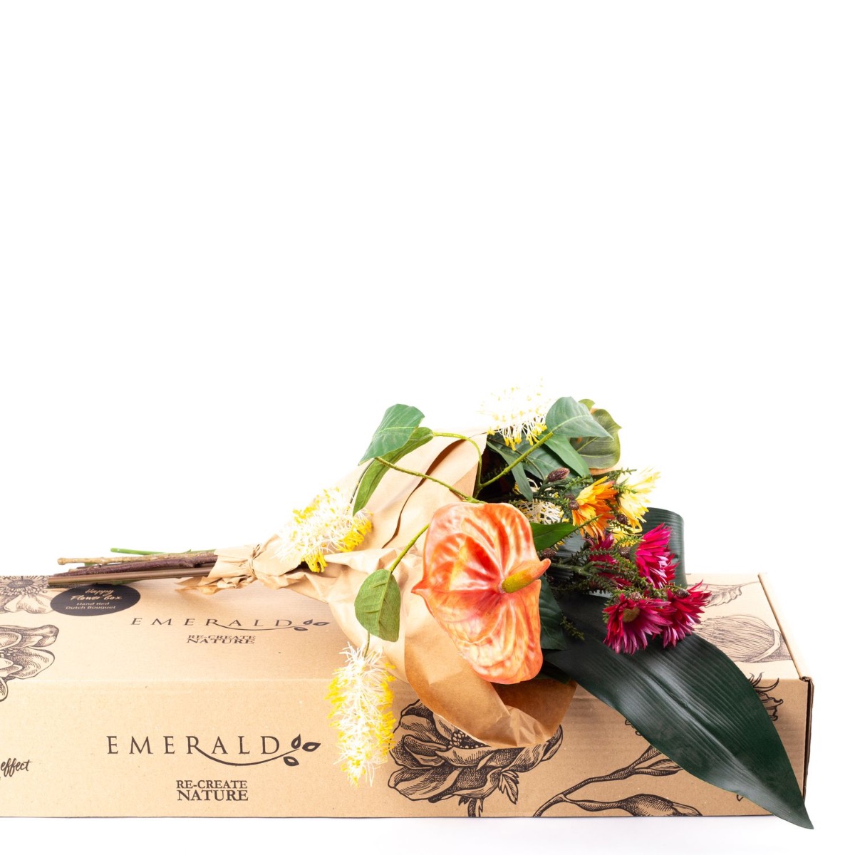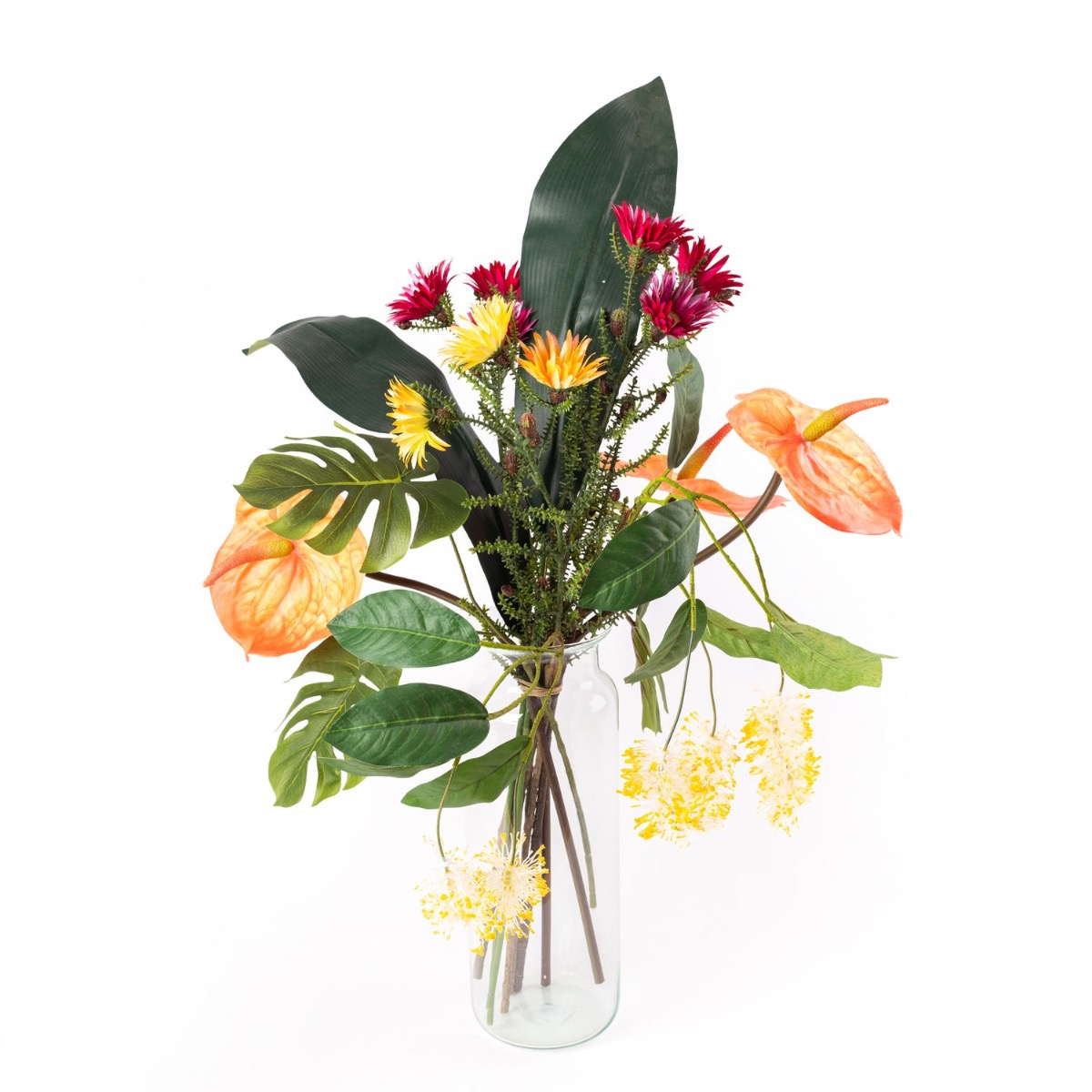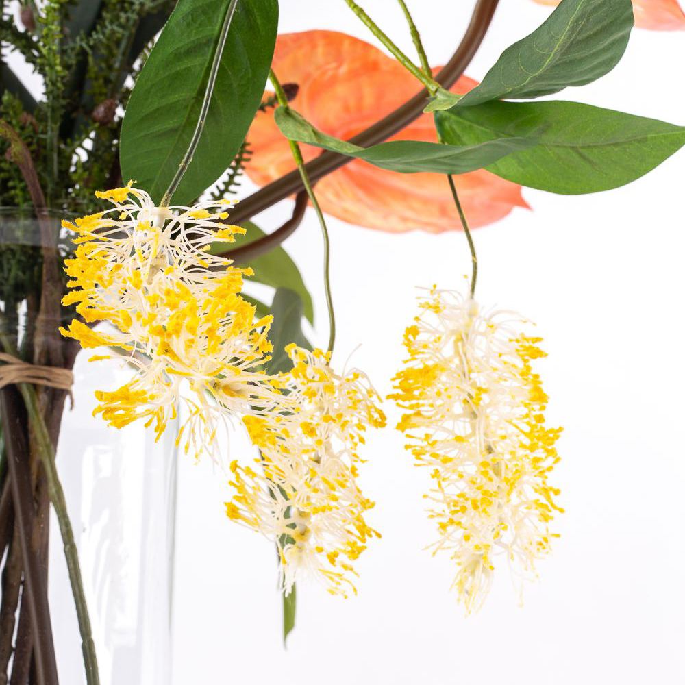 This AVALU bouquet embodies true joie de vivre. The colours yellow, orange and pink represent positivity, cheerfulness and creativity. The unusual flowers seem to have been picked straight from the Australian rainforest for this bouquet. Cape strawflowers, Australian silver leaves and flamingo flowers surround the tropical leaves and bring a glow to your home. This bouquet is a must-have!