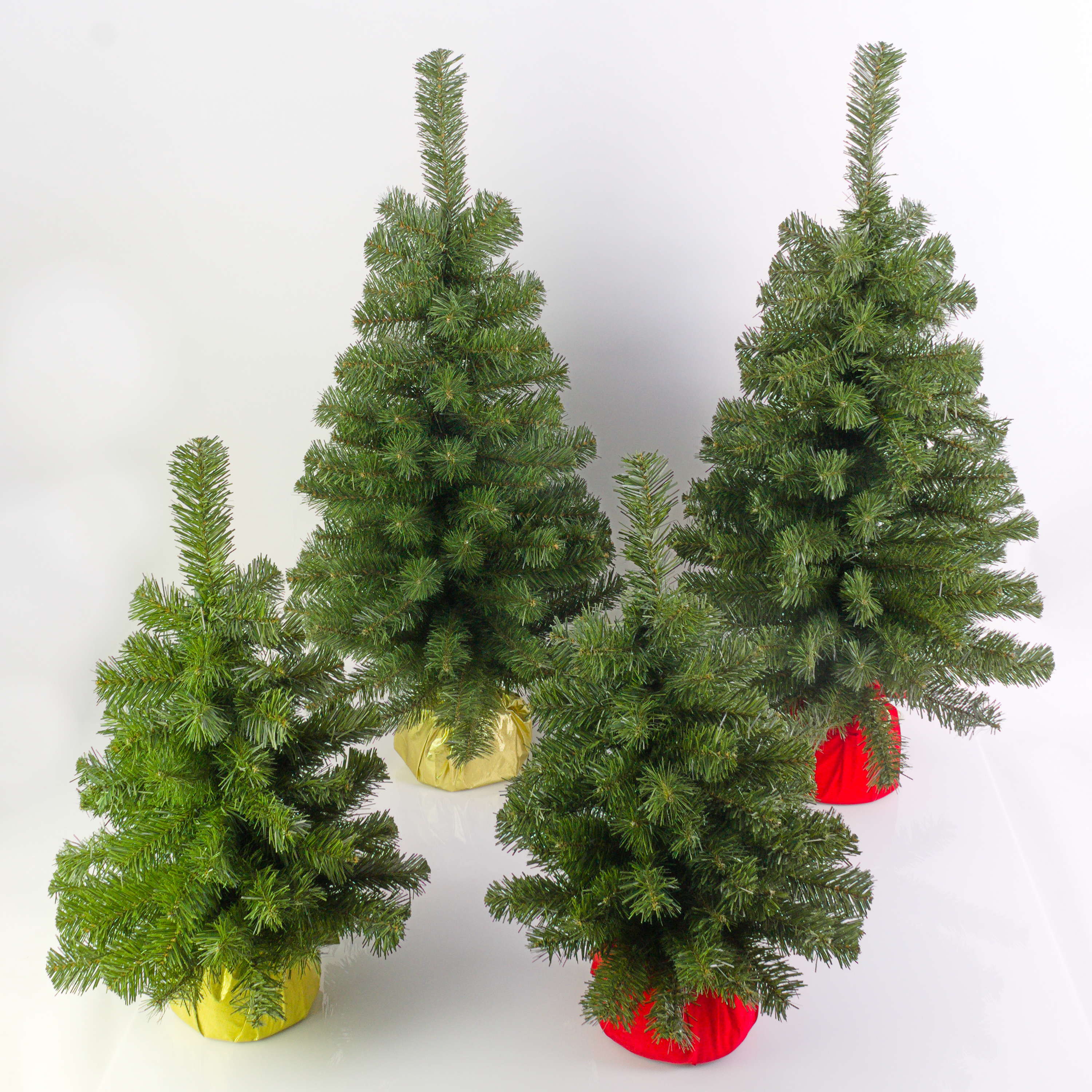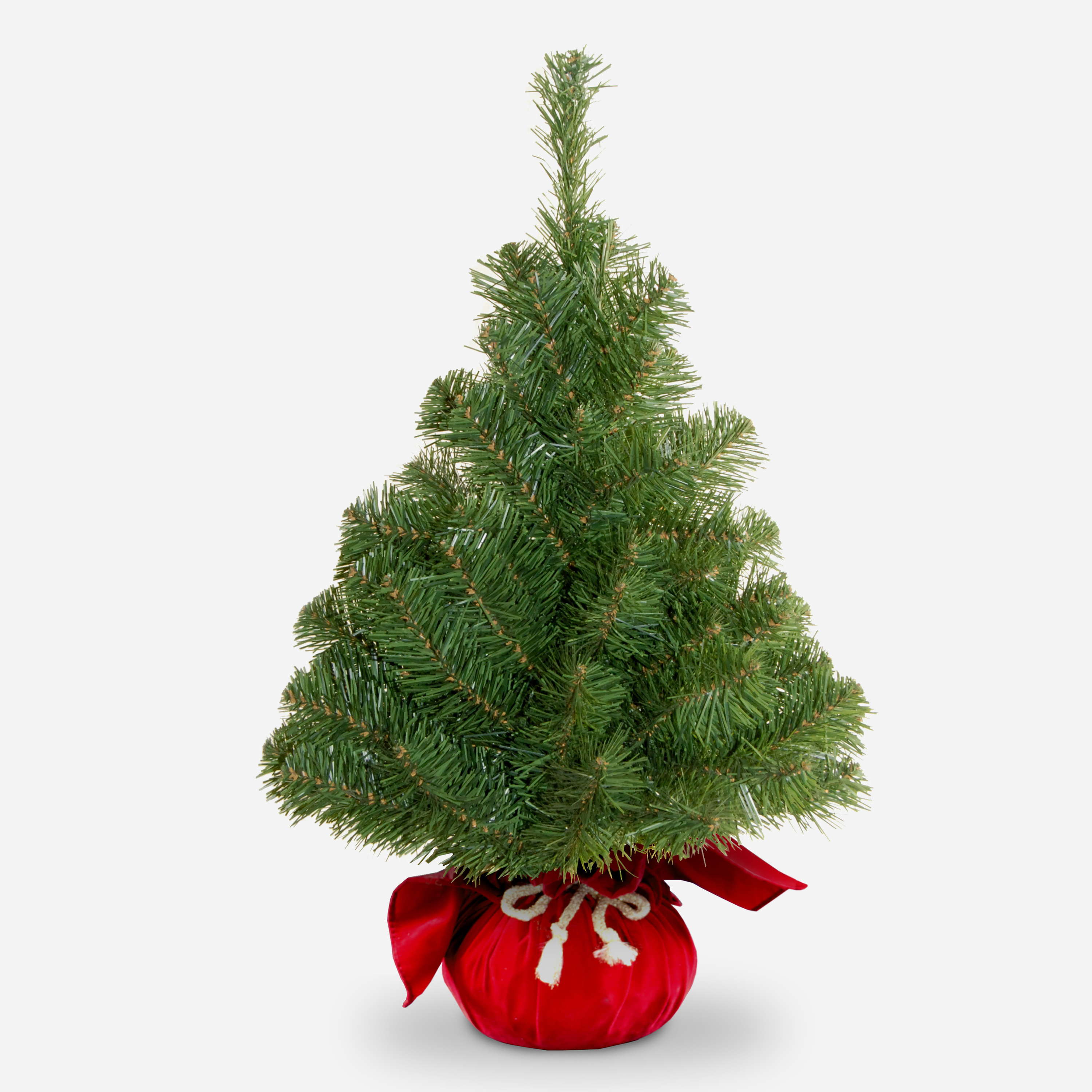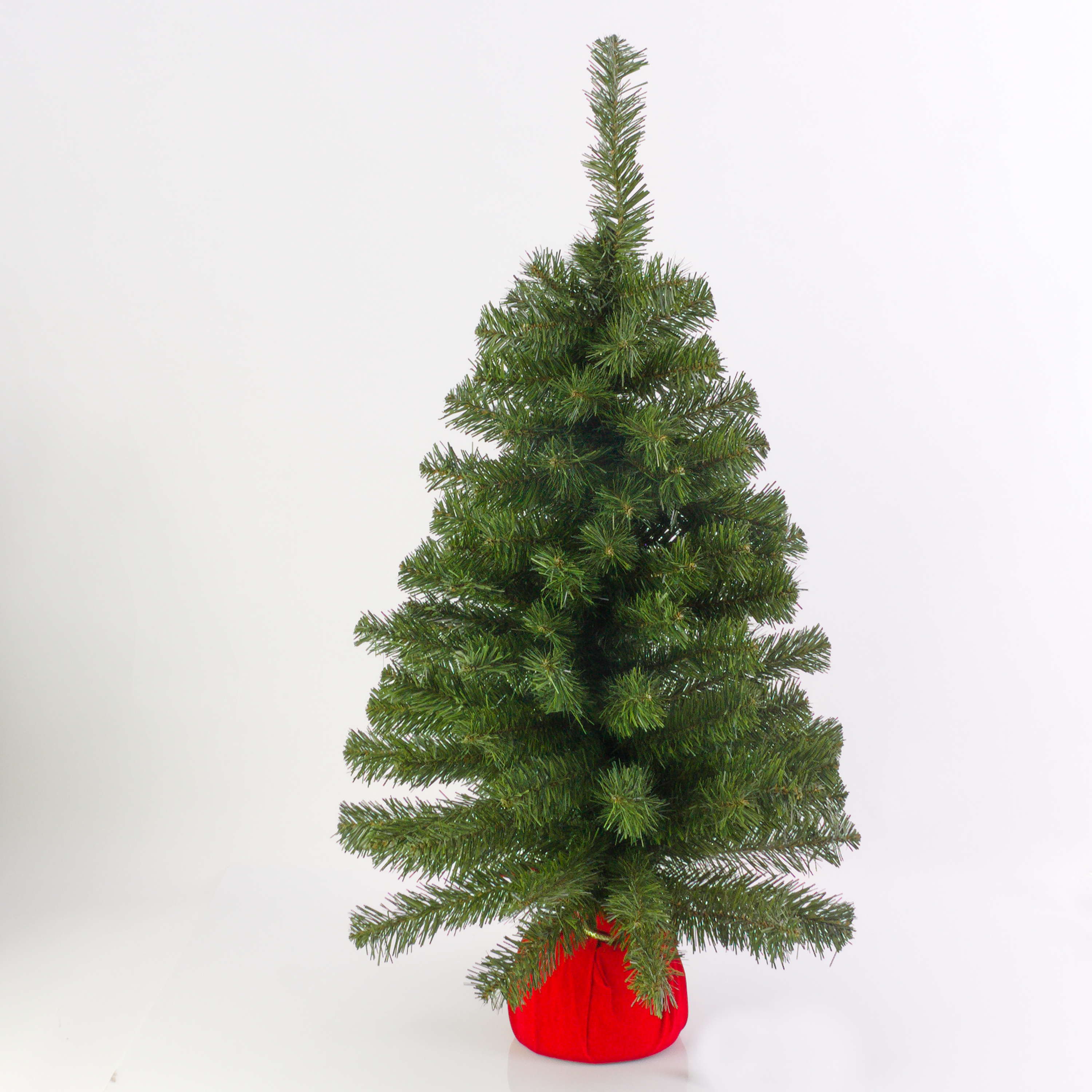 Mini fake fir tree WARSAW from the NEW artplants collection. The 3ft/90 cm high Christmas tree has a diameter of approx. 20"/50 cm and comes in a red-coloured decorative sack. The coniferous branches are firmly attached to the trunk and enable a quick and unproblematic erection of the tree.