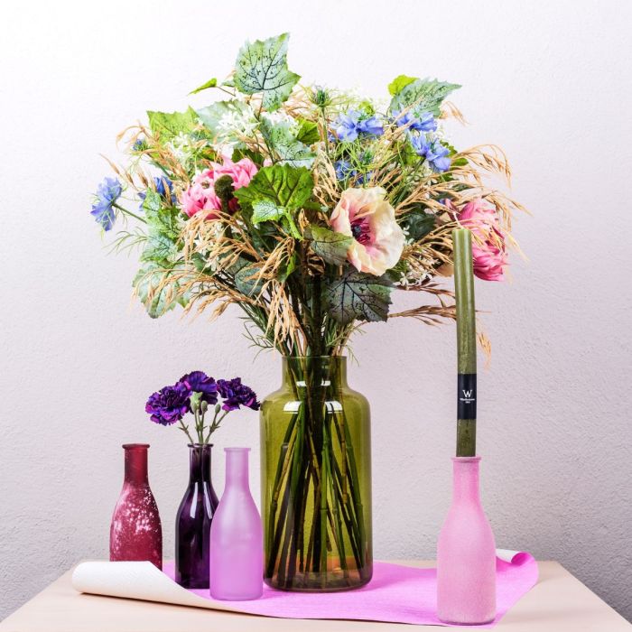 Colourful summer breeze! A wonderful bouquet of field flowers, put together with great attention to detail, evokes the warm summer air and the lightness you feel when you walk across a flower meadow. Pink poppies and sunflowers, as well as blue cornflowers have been combined with false oat-grass twigs and vine leaves. Just as if you had picked it yourself. This look embodies pure romance! You just have to fall in love with it! Shop the Look!