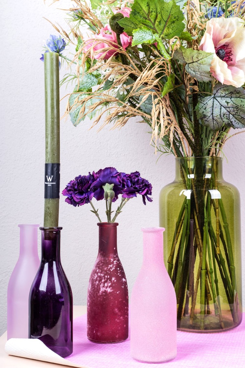 Design tip: Tie the different flowers into a bouquet. Here you proceed in a spiral from the inside to the outside. For all those who have little talent or experience in making bouquets. You can also put the individual components into the vase. It is best to proceed from the outside to the inside