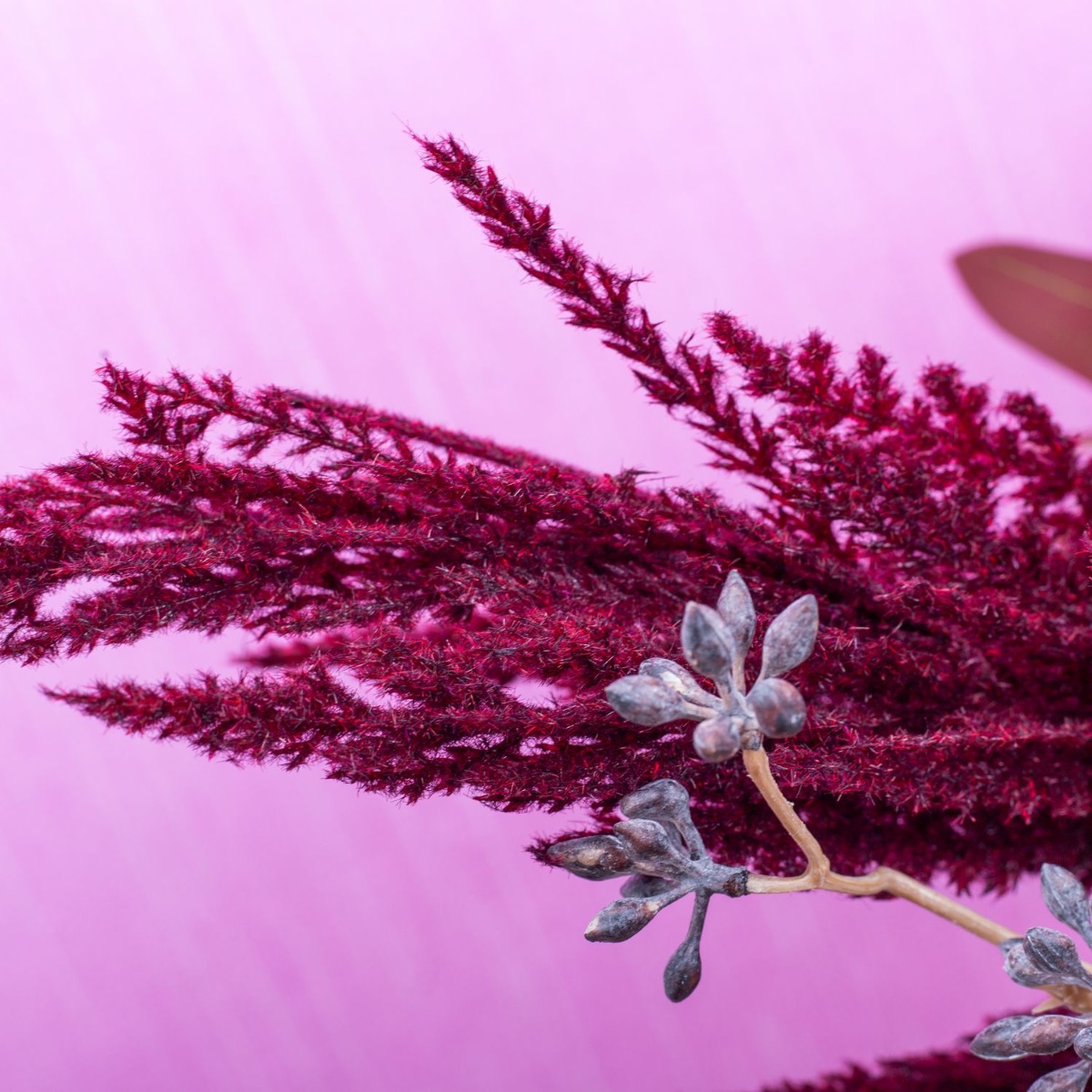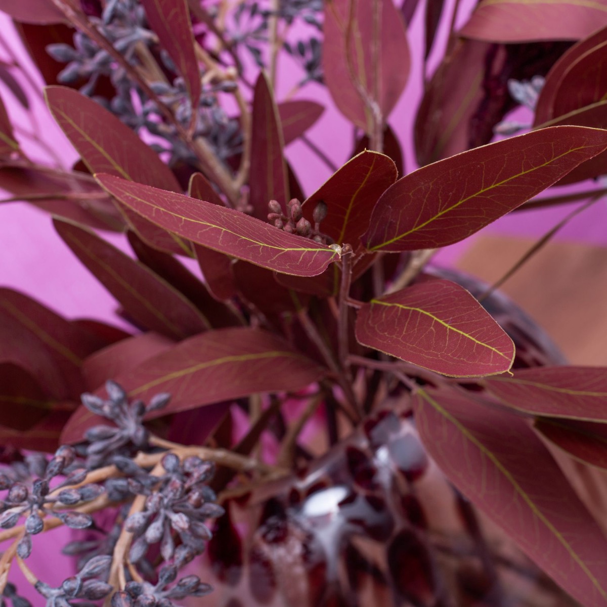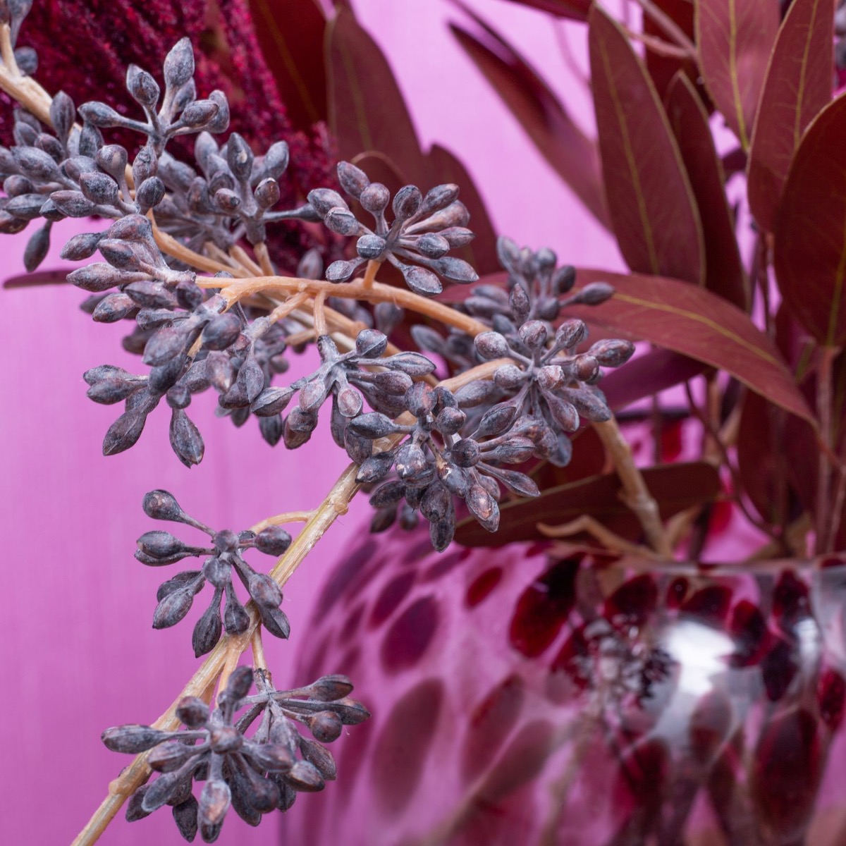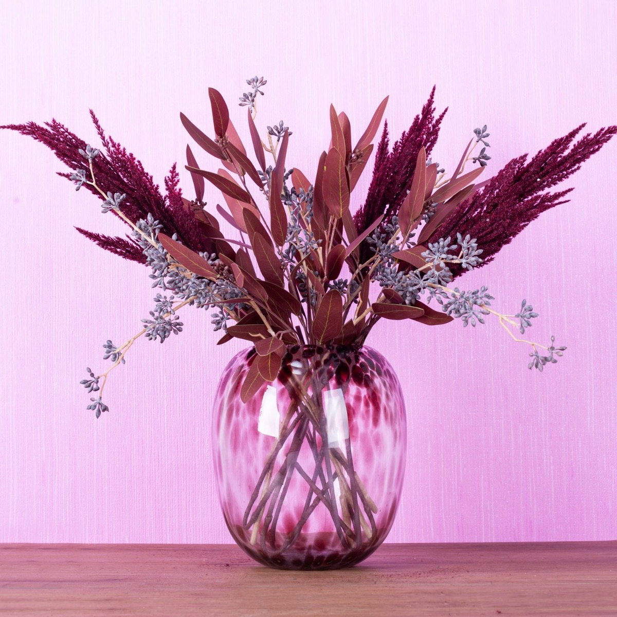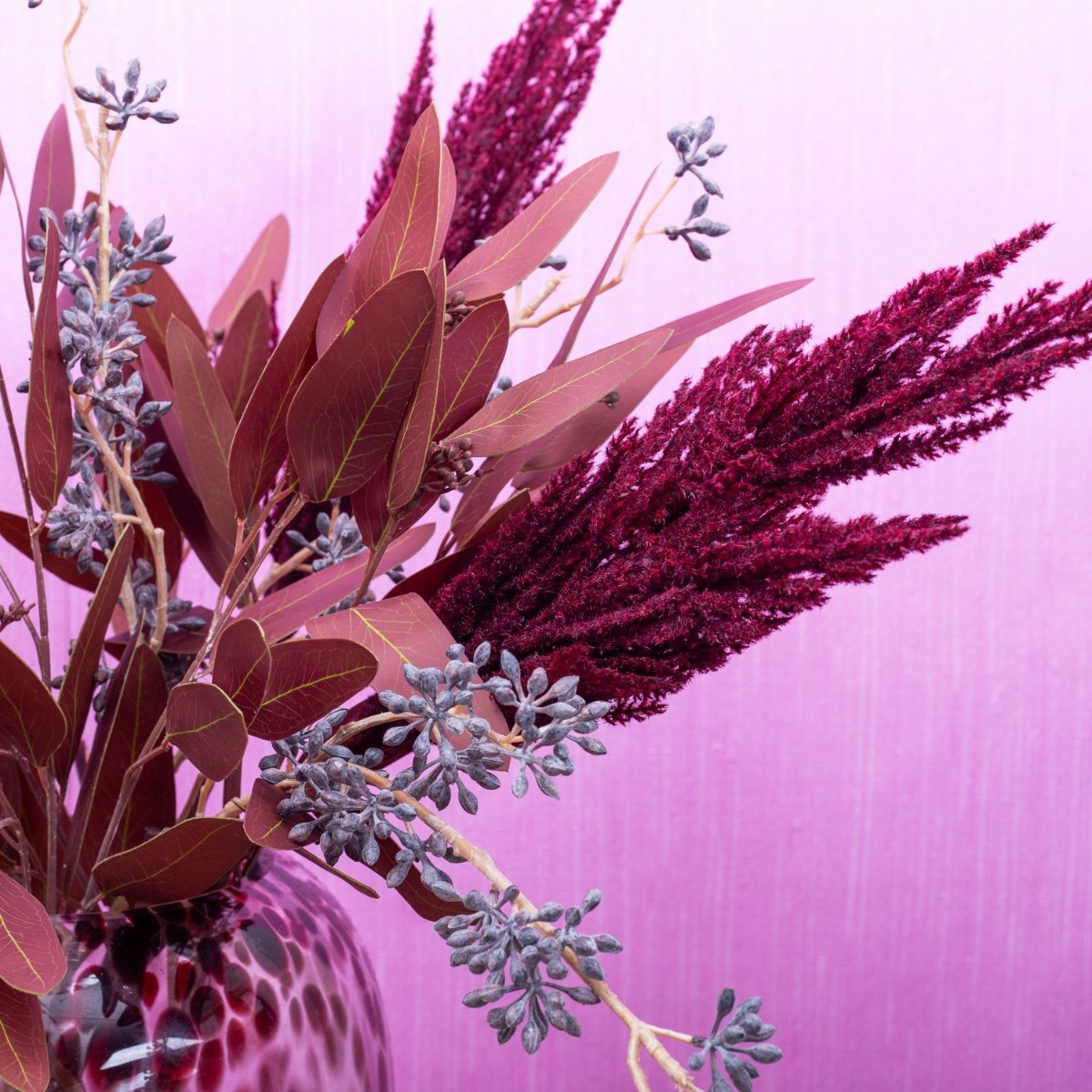 Tone on tone! Pampas grass and eucalyptus in bordeaux colours. This is actually atypical for this product group. But they do exist! All the more reason for us to create a look from them. The vase in leopard style from our RUSSELL series with its dark red spots is a perfect match for this bouquet. Brown-washed eucalyptus fruit twigs brighten up the whole ensemble and give the bouquet a lively appearance. A dream for any living room. Shop the look!