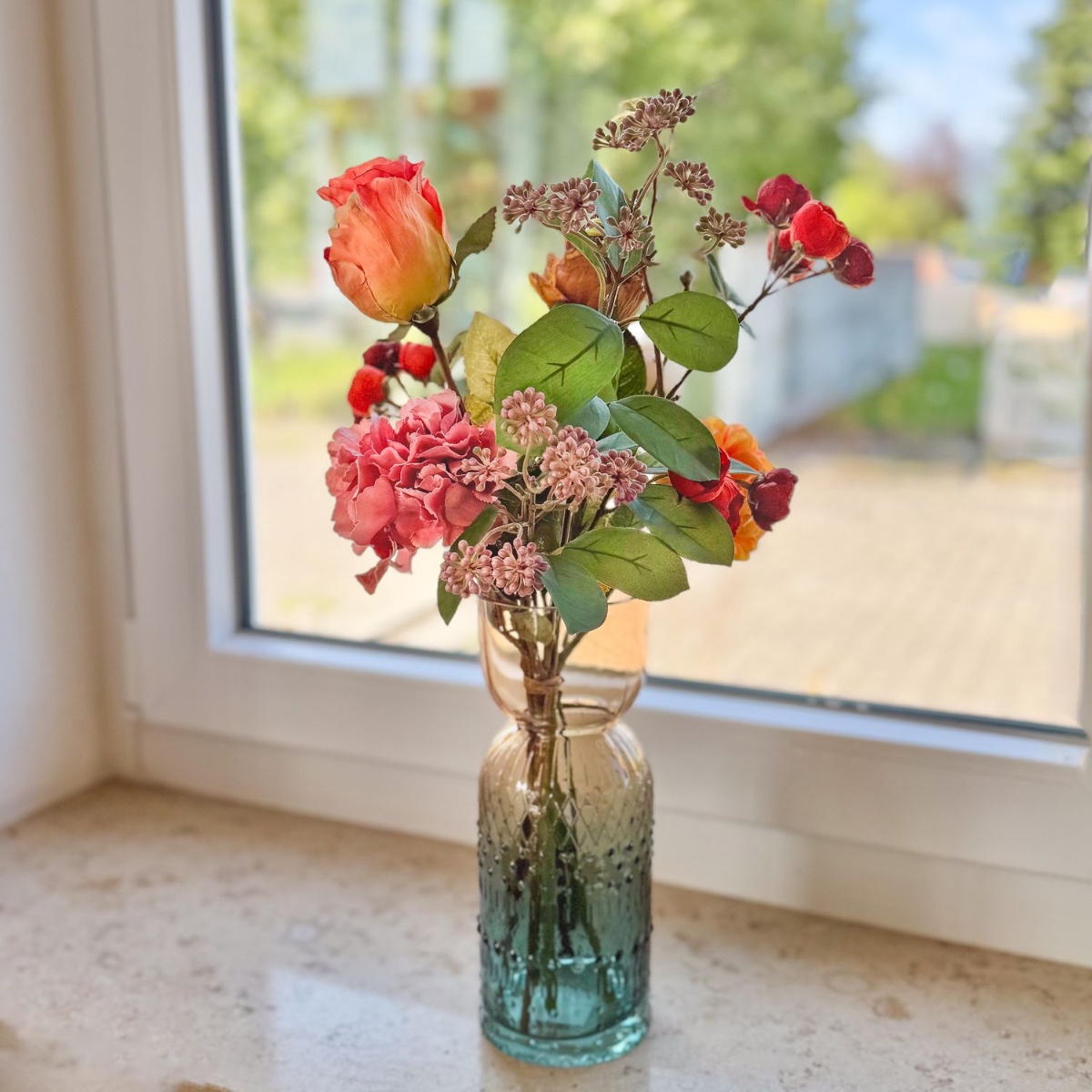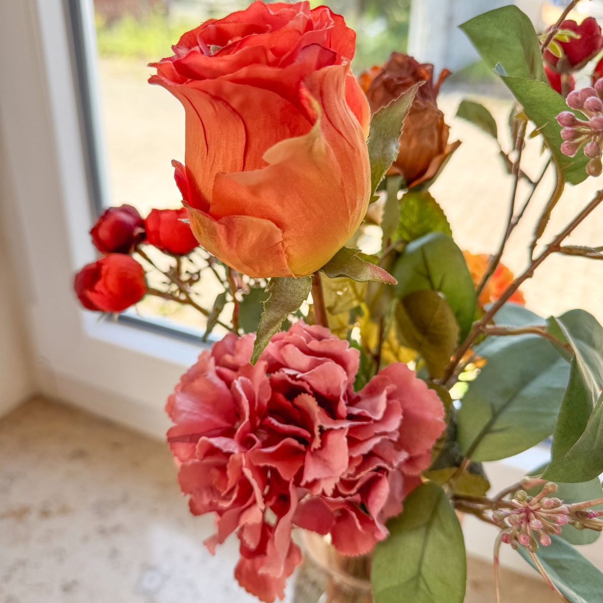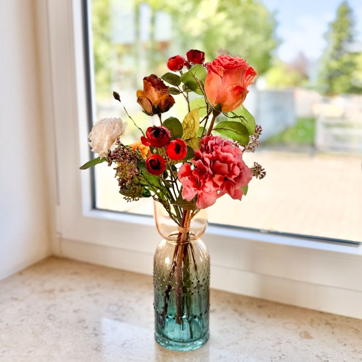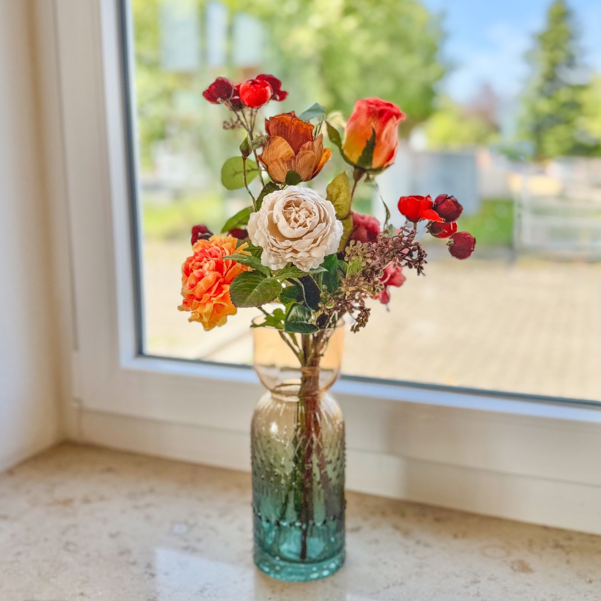 Timeless splendour in baroque splendour! This artistic bouquet was created with great attention to detail for a living room decorated in a baroque style. Realistic flowers – some in an elegant dried flower look – in warm red, orange and cream tones lend the interior a touch of romance and stylish freshness. The elegant glass vase with its delicate structure harmoniously rounds off the arrangement and makes it an extraordinary eye-catcher on window sills, chests of drawers or tables. Shop the look!