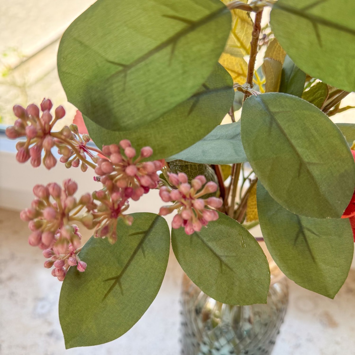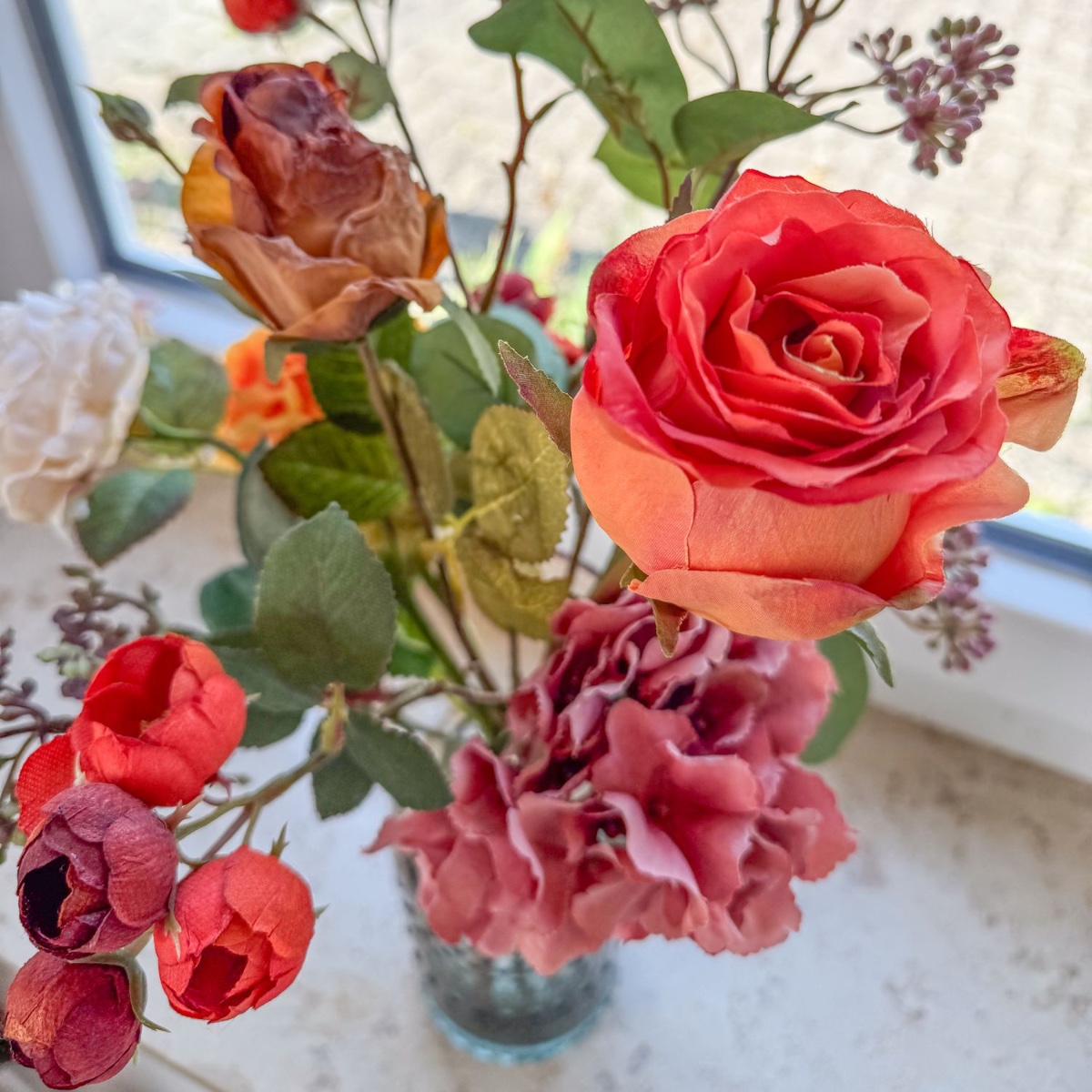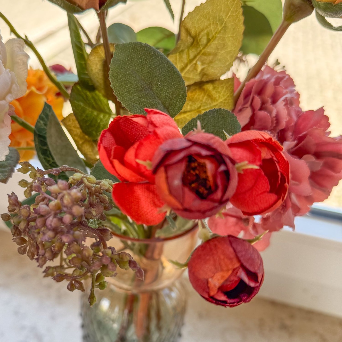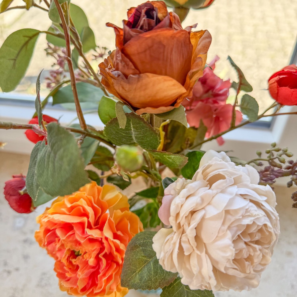 Timeless splendour in baroque splendour! This artistic bouquet was created with great attention to detail for a living room decorated in a baroque style. Realistic flowers – some in an elegant dried flower look – in warm red, orange and cream tones lend the interior a touch of romance and stylish freshness. The elegant glass vase with its delicate structure harmoniously rounds off the arrangement and makes it an extraordinary eye-catcher on window sills, chests of drawers or tables. Shop the look!