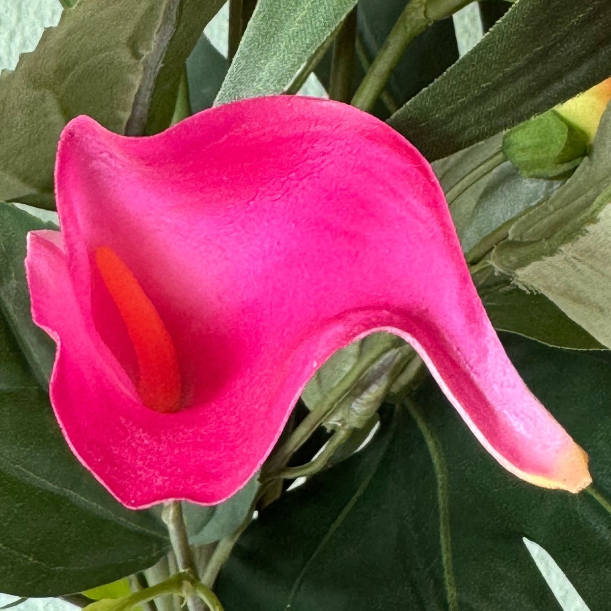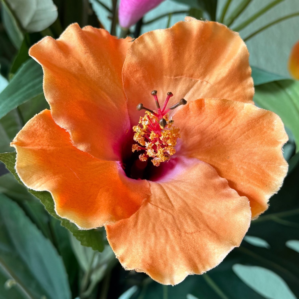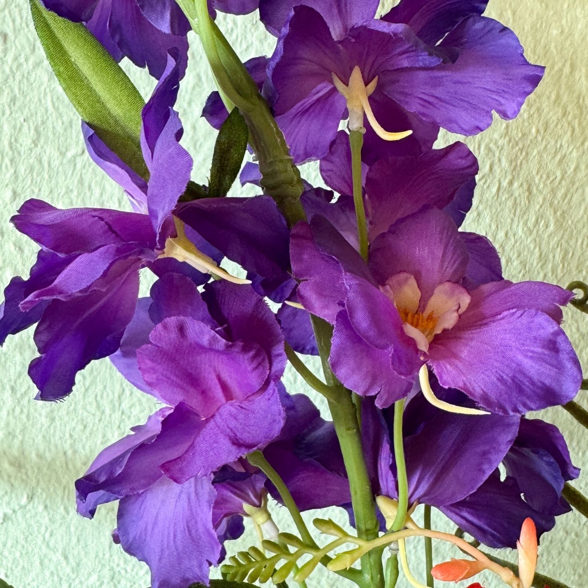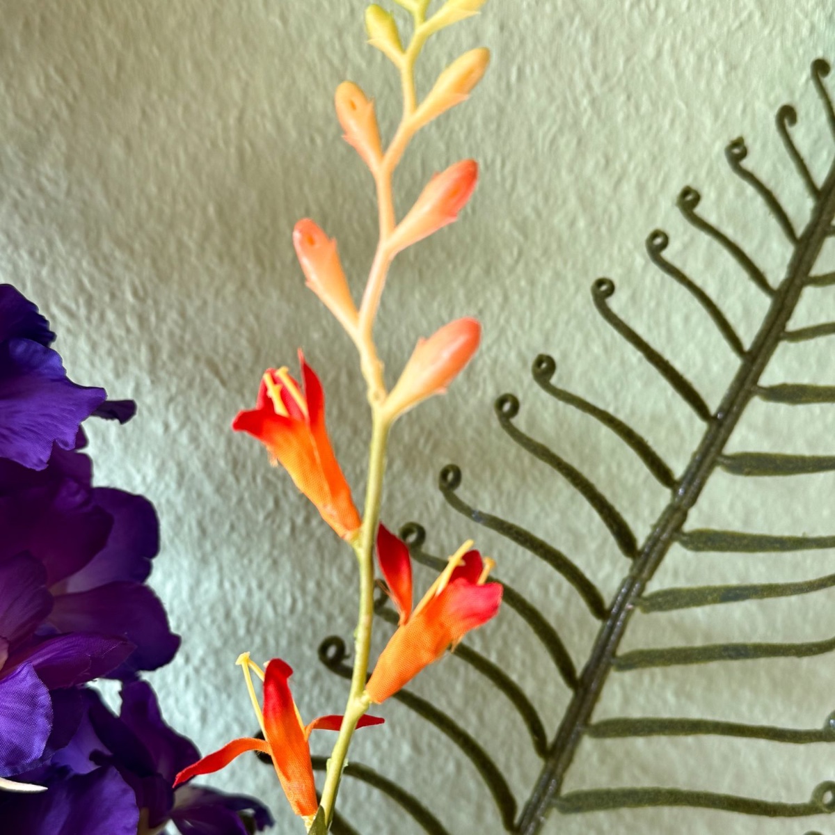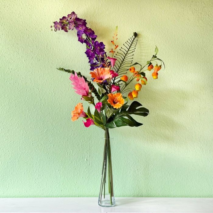 Sunset Paradise! Our customer Josef wanted a slim tropical bouquet for his hallway. This tropical ensemble instantly brings a holiday feeling into your home and reminds you of balmy evenings under palm trees, exotic cocktails and the gentle sound of the sea. Arranged in an elegant, clear glass vase, bright orange flowers, delicate pink tones and deep purple accents combine to create a harmonious overall picture that radiates pure joie de vivre. The delicate fern leaves and the rich green of tropical leaves round off the arrangement and make it the perfect eye-catcher – whether in the living room, on the balcony or in your home office. Bring a touch of the exotic into your home – without packing your suitcase! Shop the look!