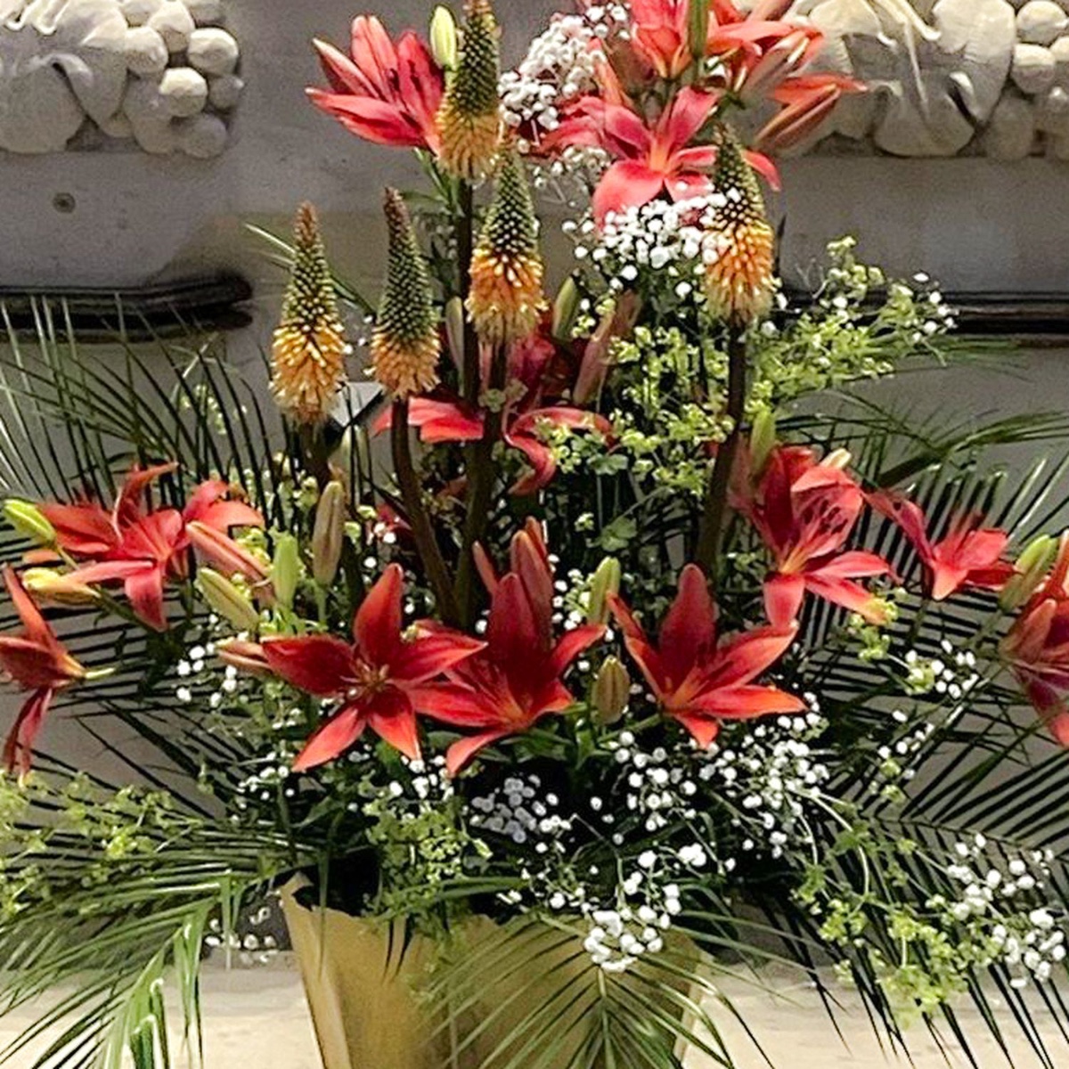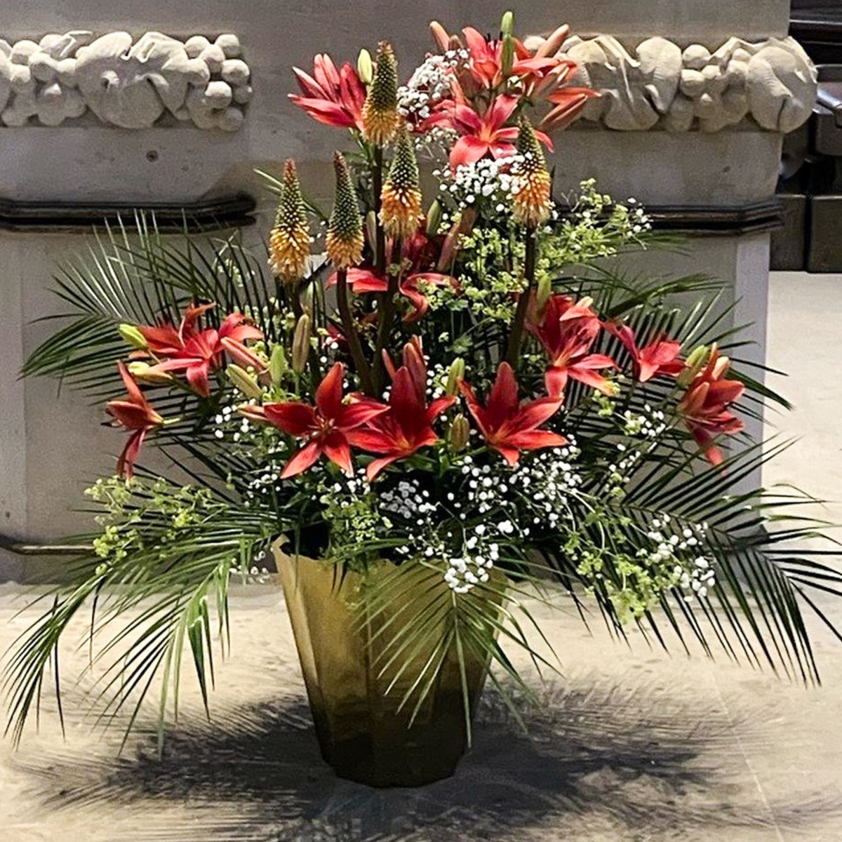 Flowers for the soul – Church Flowers! A lavish arrangement in front of the altar, artfully arranged with lilies as a symbol of rebirth and torch lilies, which stand for courage and strength. Palm fronds and delicate white gypsophila complement the arrangement, creating a harmonious overall picture. The altar flowers are a reminder of the beauty and abundance of God's creation – a floral symbol of hope, faith and togetherness. Shop the look!