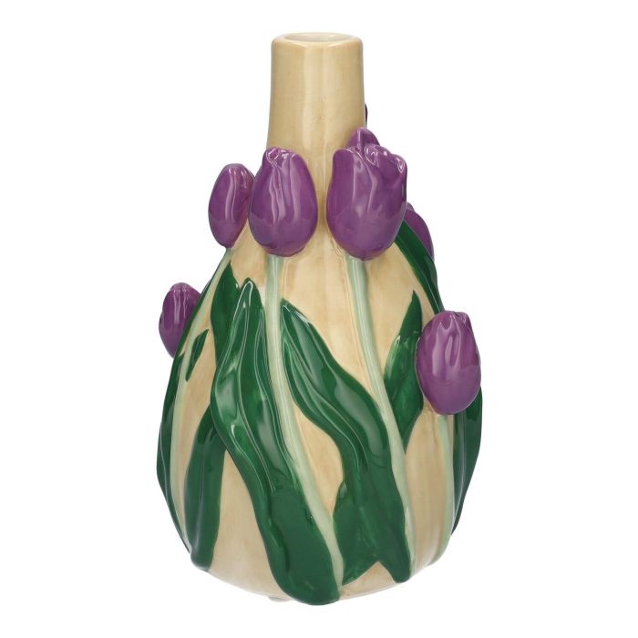 Flower vase LIMEA made of dolomite, 3D tulips, beige-purple-green, 8"/21,6cm, Ø5.2"/13,3cm