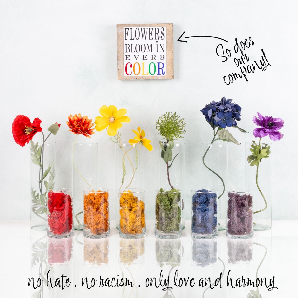 In the colours of the rainbow – as diverse as our team! Our world is colourful, and this is reflected not only in our colourful range, but also in the people behind artplants. Diversity is a natural part of who we are – regardless of origin, love or faith. The bright colours of the flowers harmonise perfectly with the moss-filled glass in the foreground and show that beauty arises where colours and people meet. Shop the look!