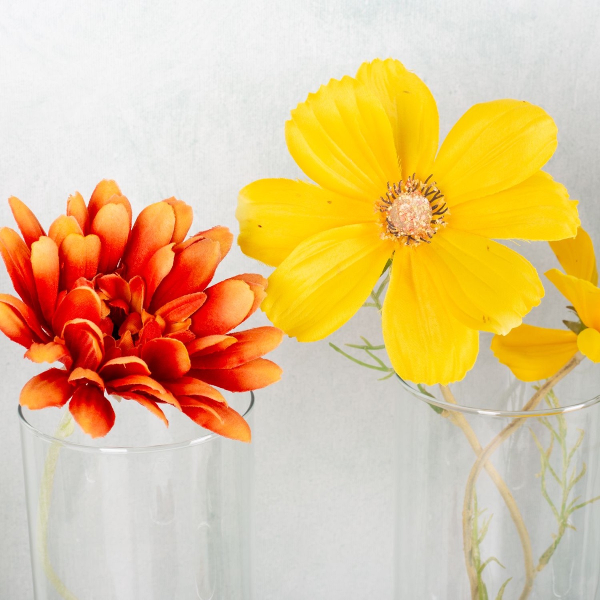 Design tip: Arrange the vases at equal distances and place the small glasses slightly offset in front of them. Don't cut the stems of the flowers; bend them into a spiral shape so that they fit nicely into the vases. Fill the small glass with moss in a colour that matches the flower behind it.