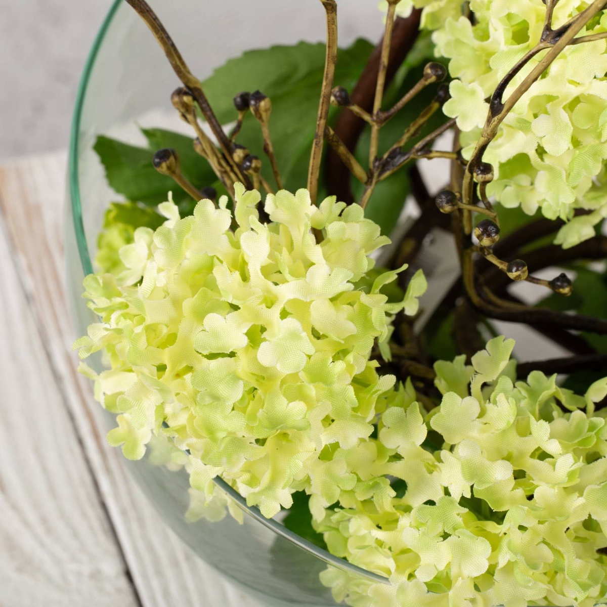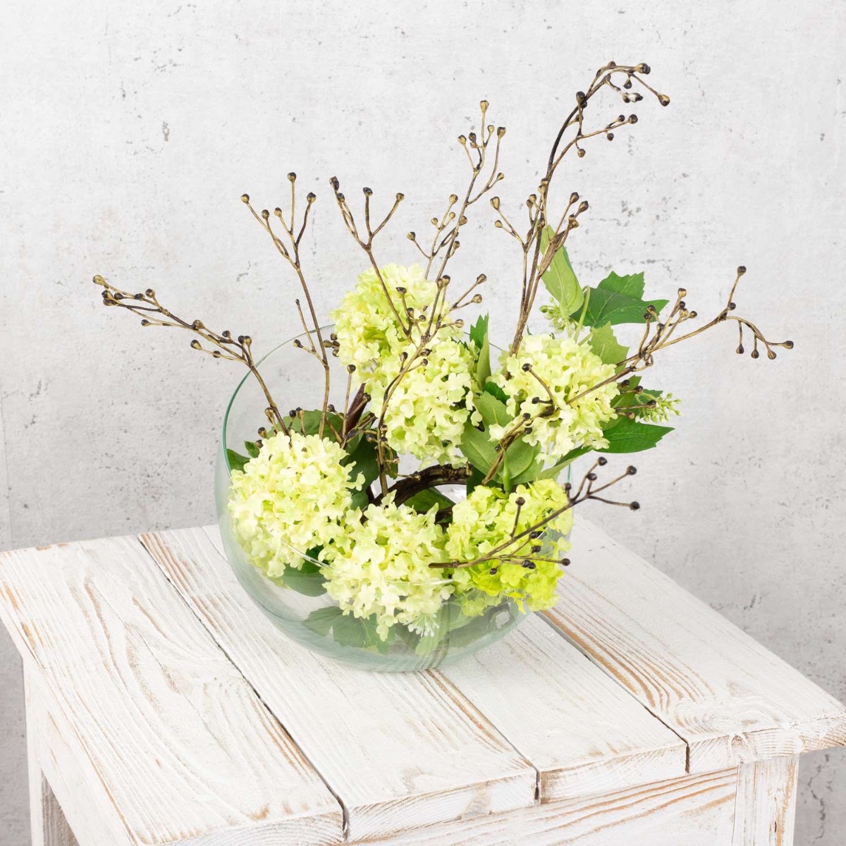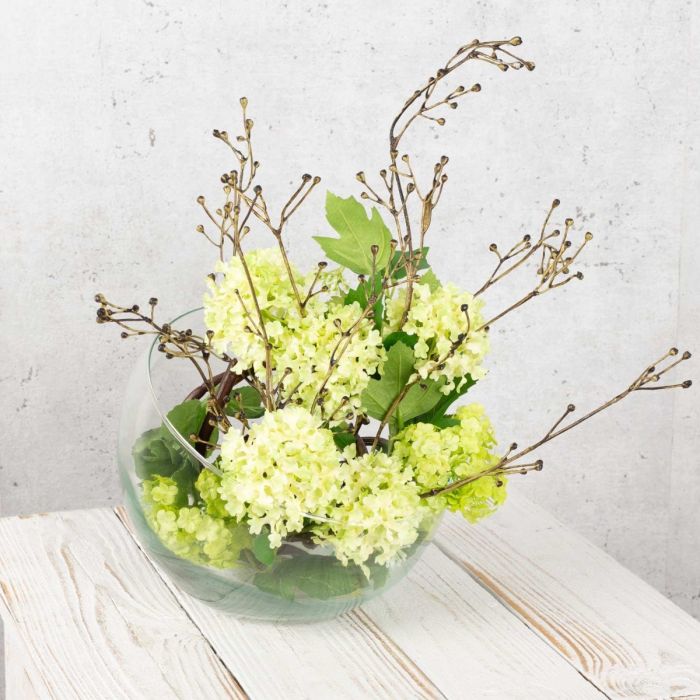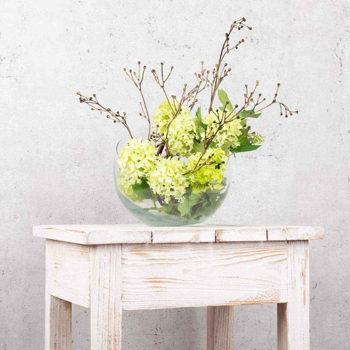 Pale green and golden brown! These slightly greenish guelder rose blossoms, interspersed with golden brown buds, create a wonderfully delicate effect. A glass bowl with a slanted opening really suits this arrangement well, because the large flowers emphasise the shape of the glass. A summer look for all occasions. Shop the look!