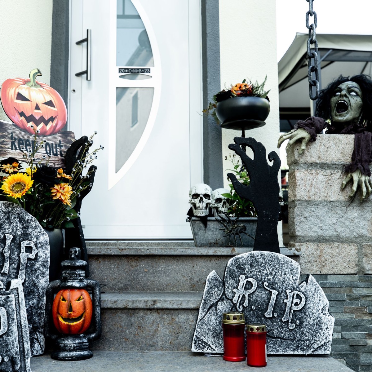 Trick or Treat! What could be better than screaming children demanding sweets on your doorstep? Well, let's give them a good scare. Our styrofoam tombstones and hands already have a really high creep factor, but the illuminated skulls that you can put in plant pots are also really scary. A bouquet of black roses and sunflowers should never be missing from artplants looks. After all, flowers embellish even the scariest places. Shop the Look!