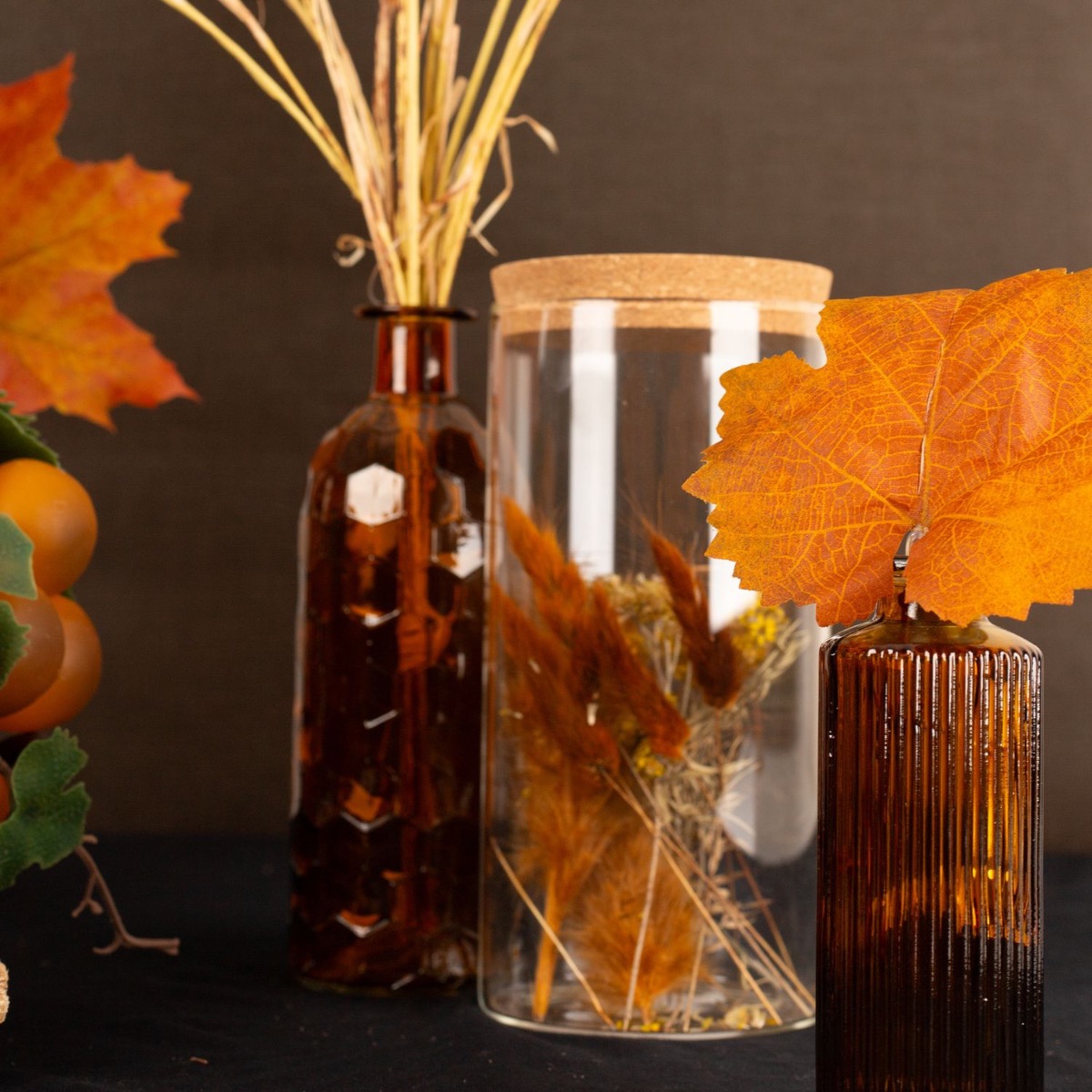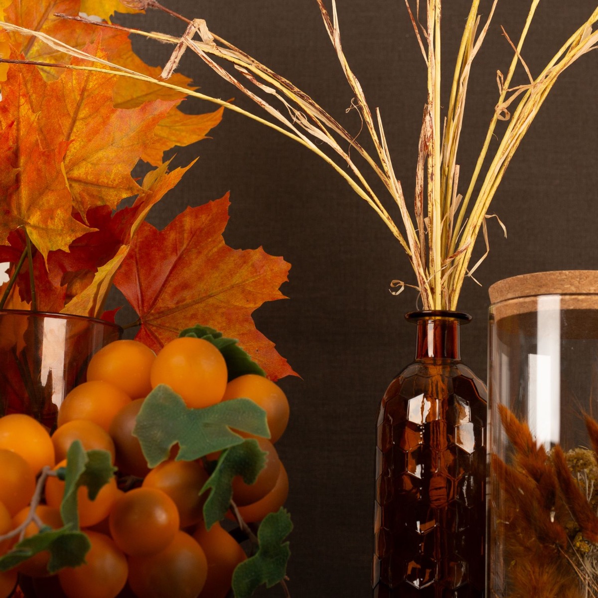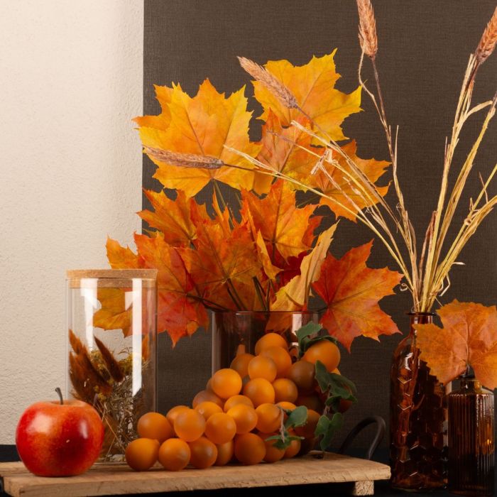 Brown and orange! These are classic autumn colours. The maple leaves in particular produce especially beautiful colours in autumn. The orange glows magically and brings autumn into your home. The storage jar filled with autumnal dried flowers is a perfect match for this autumn look. The ears of wheat, the red apple and the orange-coloured grapes are reminiscent of the upcoming harvest season. Our range of bottles and vases includes a number of products in brown and orange. Shop the look!