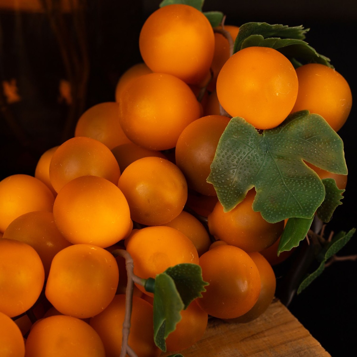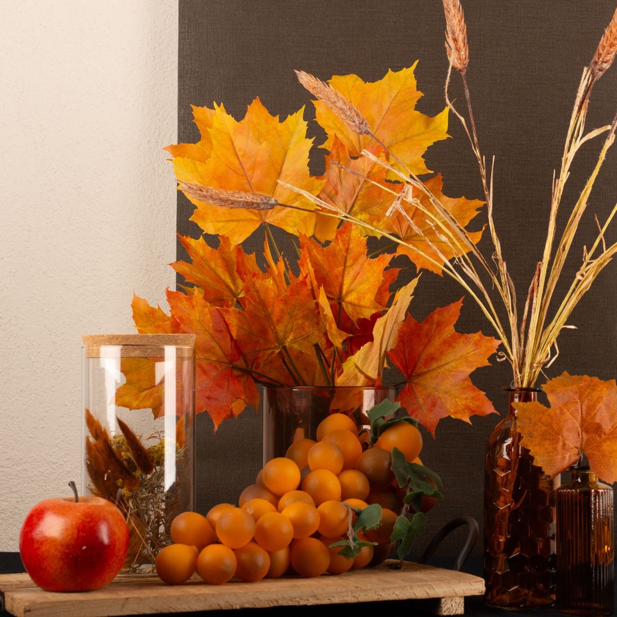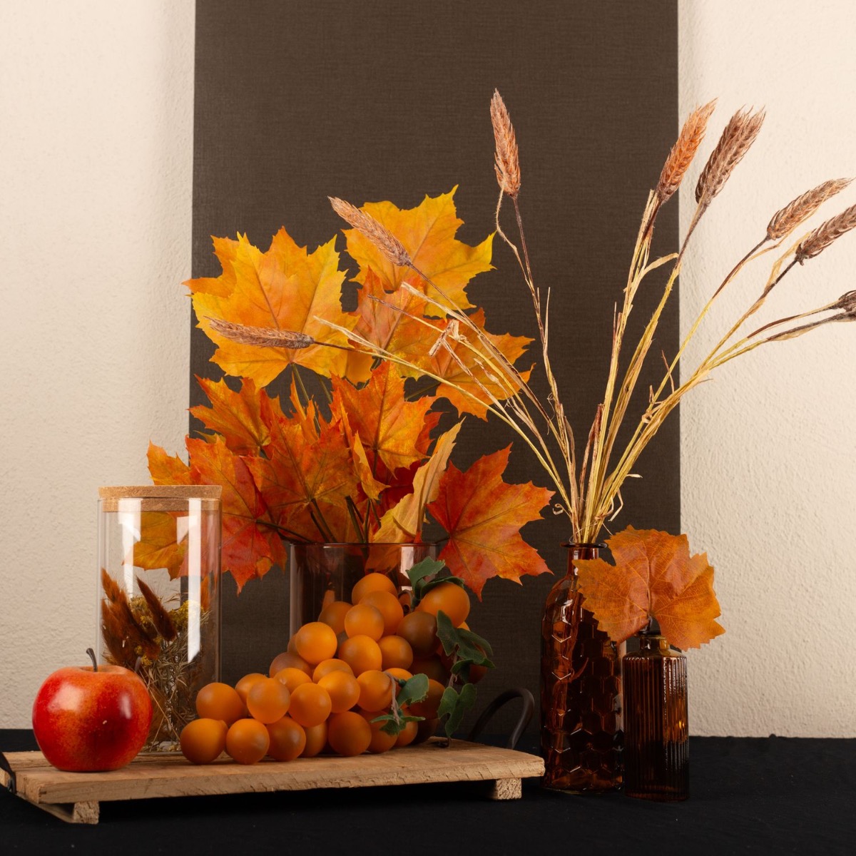 Design tip: Cut the maple branch and the wheat ear branch to vase size and fan them out nicely in the vase. In the small vase from the EMANUELA series, we simply cut a leaf off the maple branch and inserted it into the bottle. The grapes and apple were placed on the wooden tray. It makes you want to take a bite.