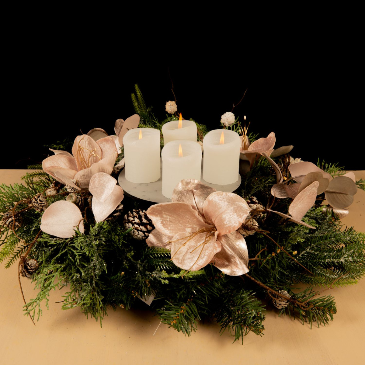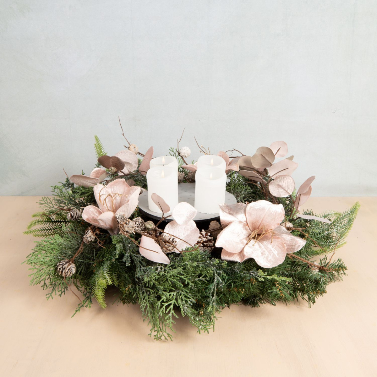Traditional and modern!This Advent wreath was put together with a lot of love and attention to detail. The fir branches, pine cones and cypresses of the wreath blend perfectly with the velvety elegance of the amaryllis and the rose-coloured eucalyptus. The modern arrangement of the candles in the centre of the wreath gives the look a whole new appeal. Makes you look forward to Christmas. Shop the Look!