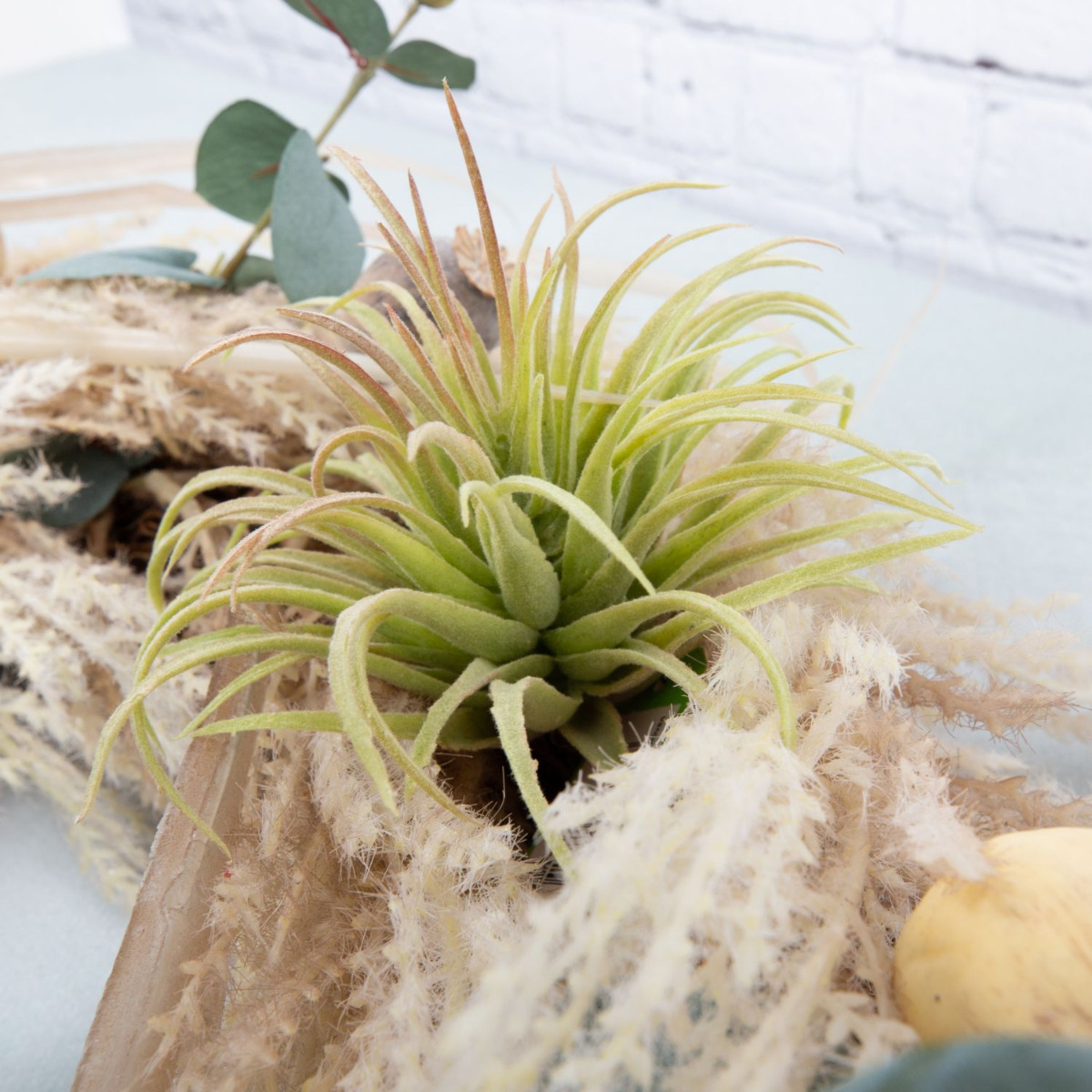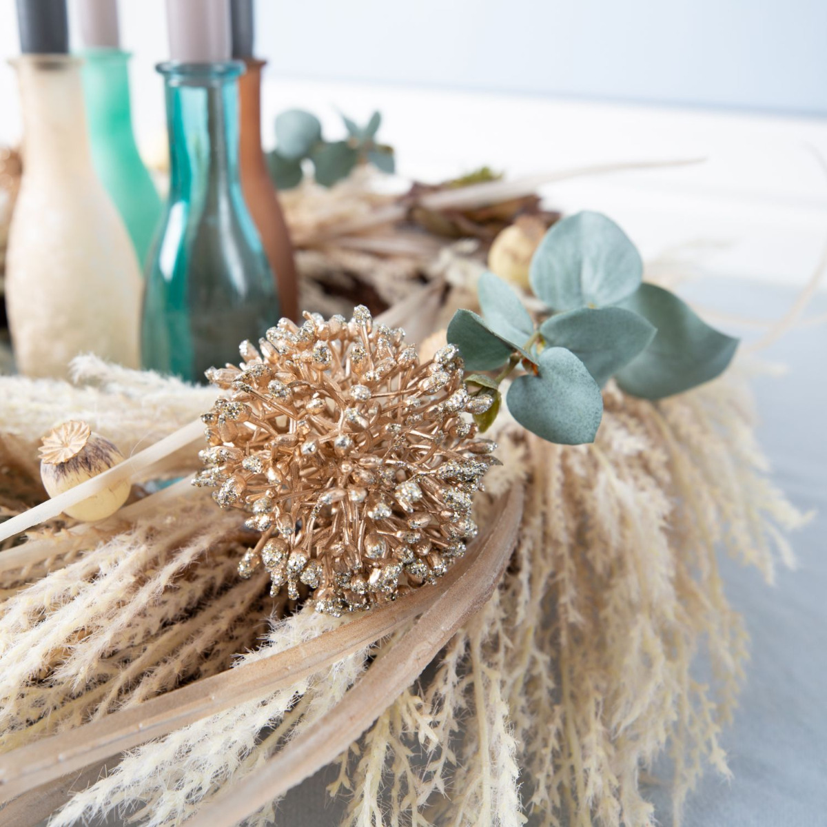 Turquoise and beige with Christmas flair! This Advent wreath looks quite unconventional, because in most parts of the world Christmas is celebrated with fir branches and Christmas roses or poinsettias. With this look, we just wanted to get away from the classic design of Christmas and have developed a wreath that consists of reed grass, poppy pods and eucalyptus branches. What many people know, Christmas is celebrated (almost) everywhere in the world - not only in Europe. The golden cornflowers as well as the golden-silvery glittering allium give this tropical design a Christmas touch that marks a time of contemplation even in the warmest regions. Bring the tropical Christmas look home too! Shop the Look!