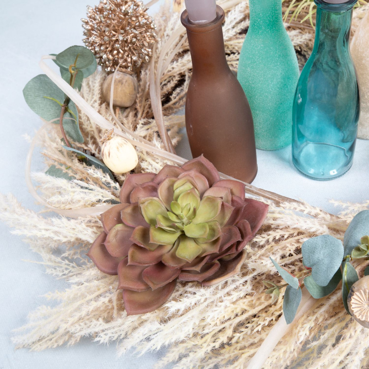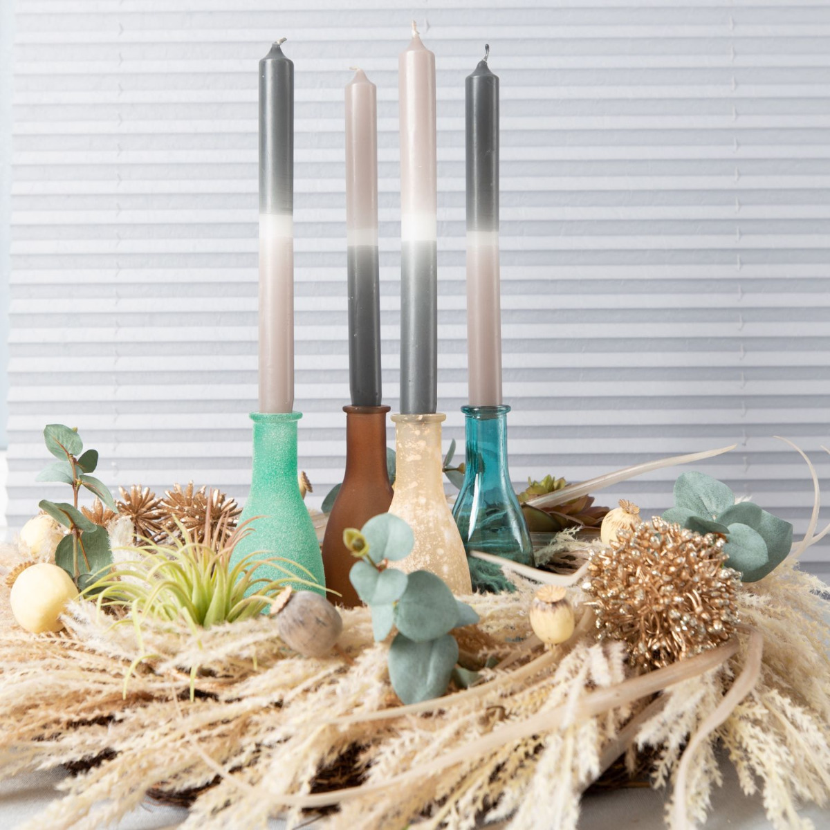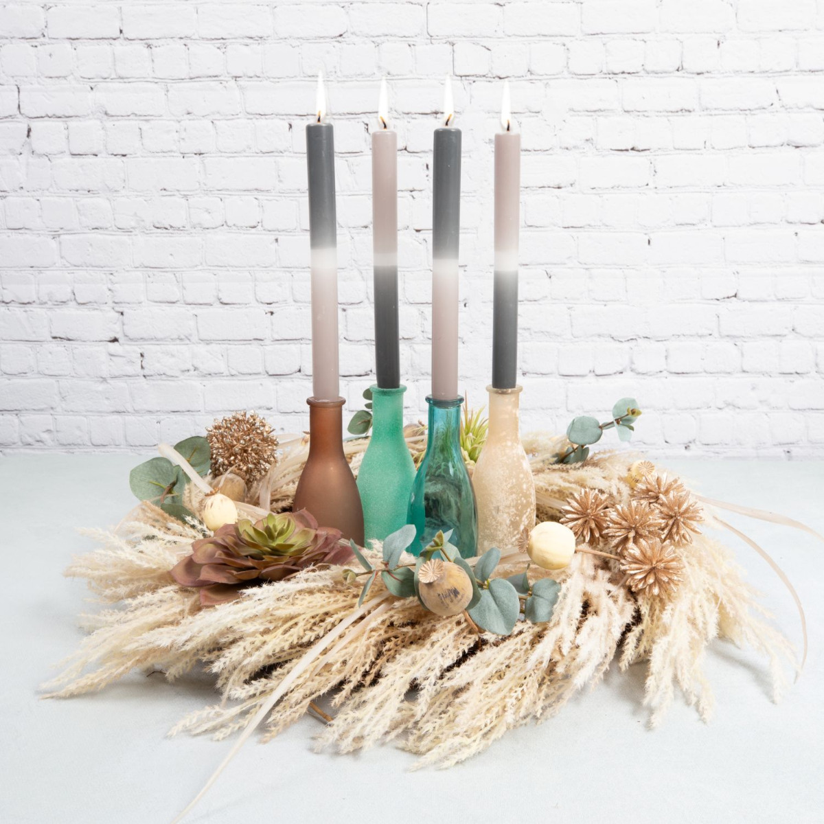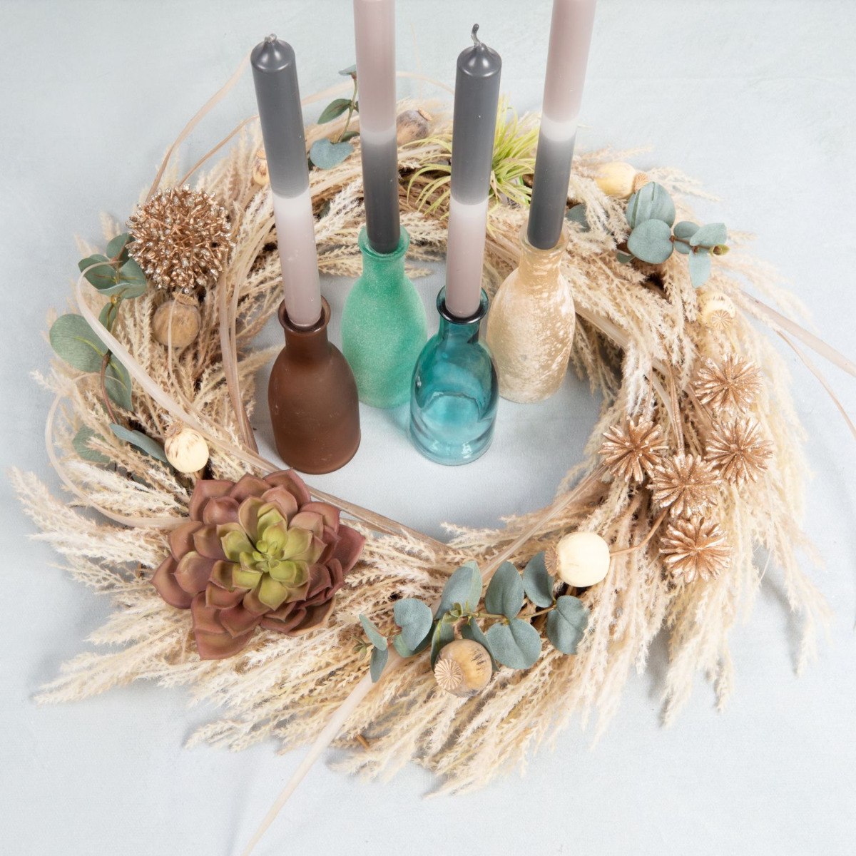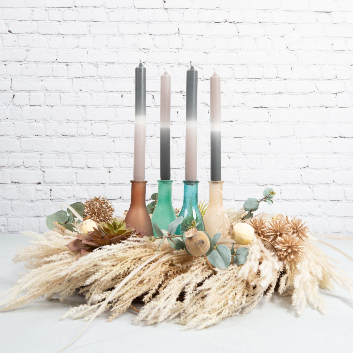 Design tip: Trim the pampas grass from the wreath nicely. Shorten the decorative branches and put them into the wreath. Make sure they are evenly distributed. Arrange the bottles with the candles so that the dip-dye candles are alternated in colour.