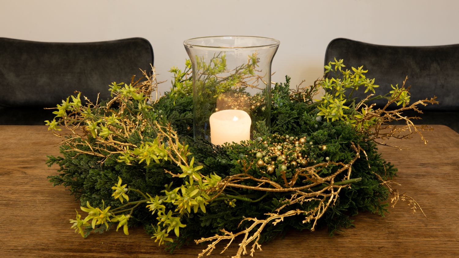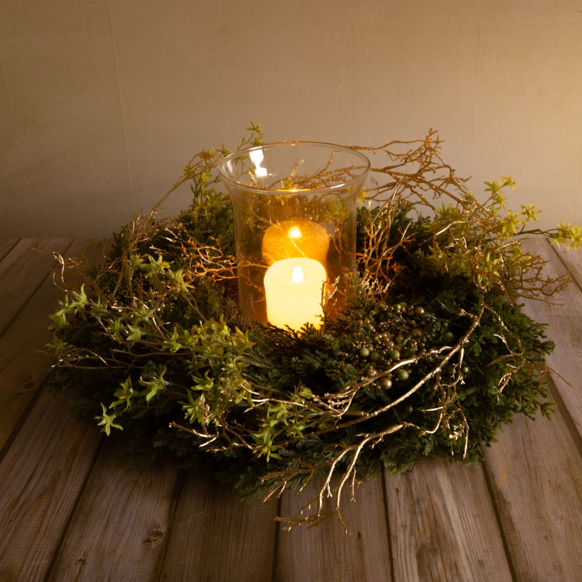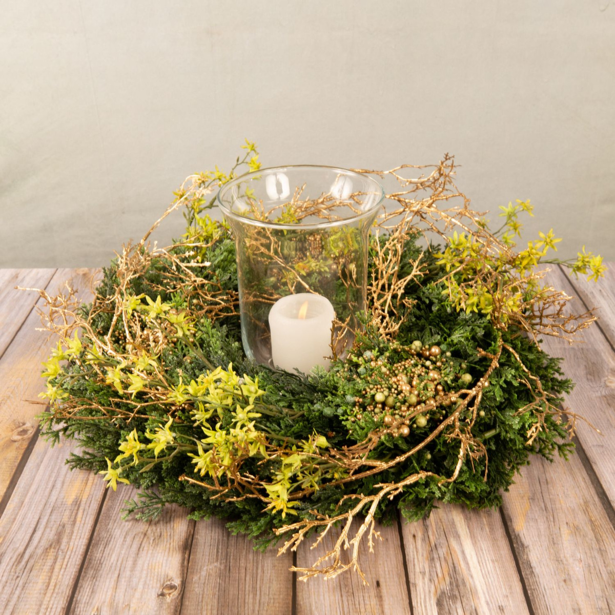 Atmospheric elegance! The cypress wreath decorated with gold beads makes the Advent season appear in a glittering light. Small, artificial deutzia branches as well as golden birch twigs make the wreath look lively and fresh. A candle jar in the middle stands for the Advent season and the upcoming Christmas. This look is not only suitable for interiors. The candle jar protects the burning candle from wind and beautifies not only the living space, but also your covered outdoor area. Shop the Look!