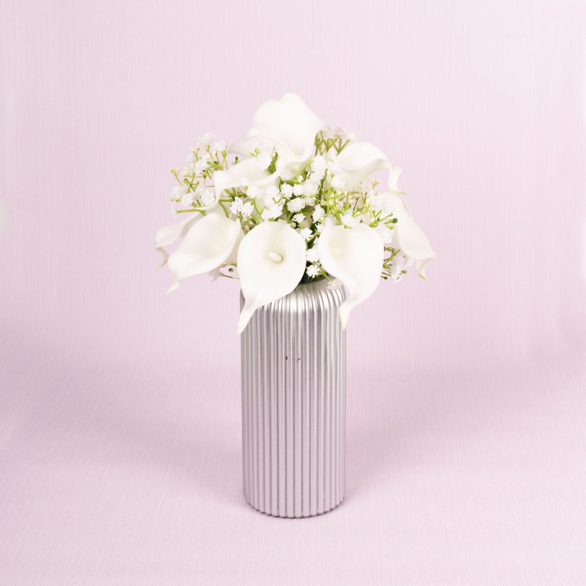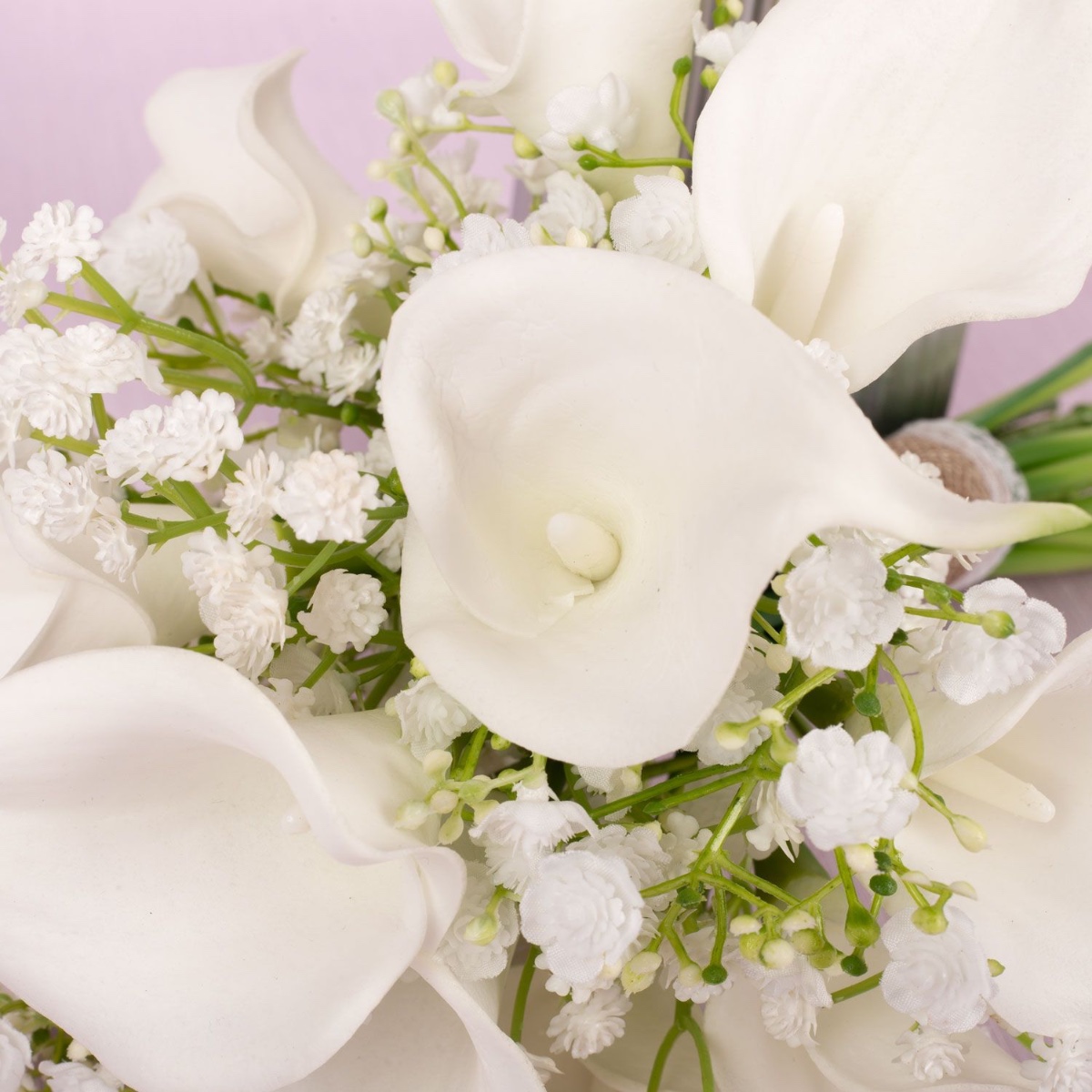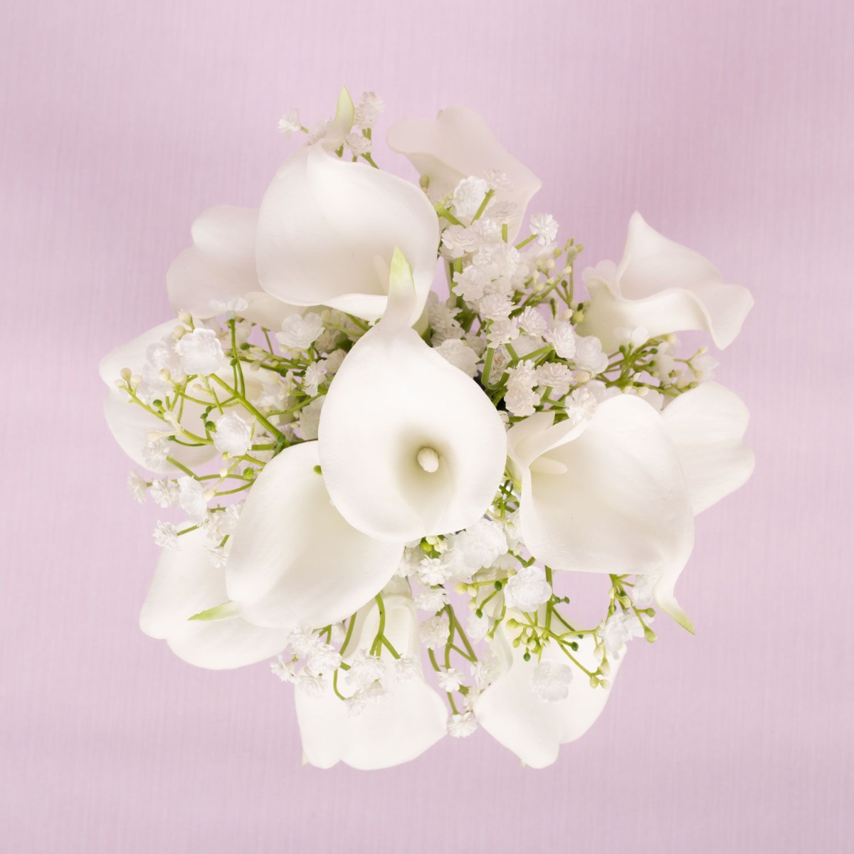 Elegant and modern! A stylish bridal bouquet. White calla lilies surrounded by delicate white baby's breath create a bridal bouquet that radiates pure extravagance. This bouquet calls for an equally extraordinary dress. That's why it was good that the bouquet was created first. This way, you can take your time to choose the perfect dress. We hope that the big day is just as special as the choice of flowers. Shop the Look!