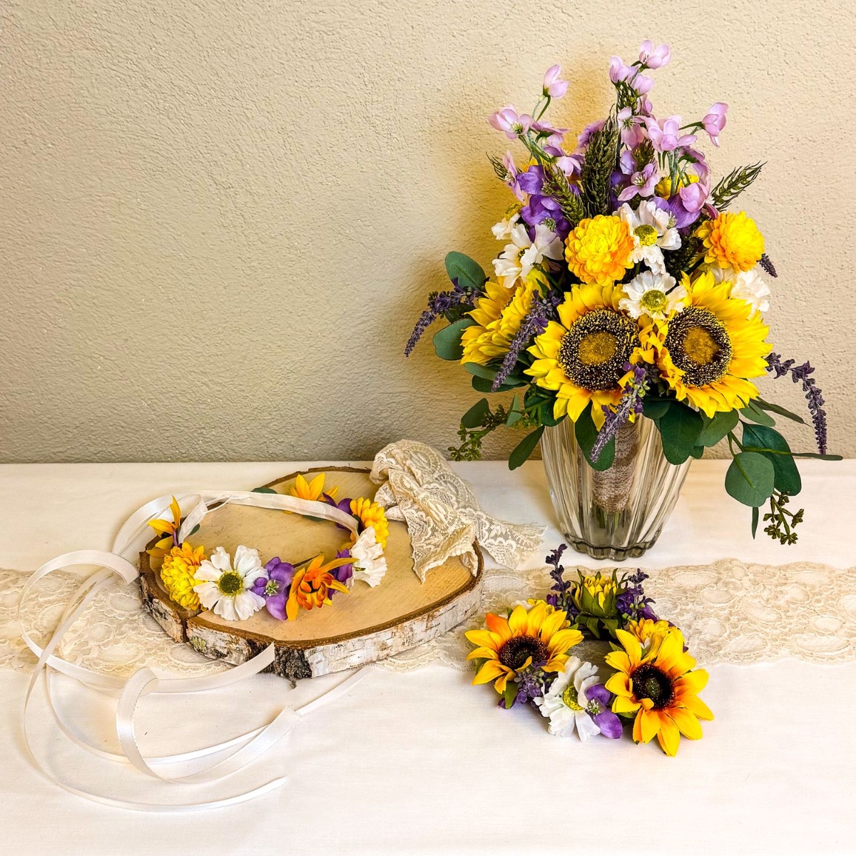 Light in your heart – sunflowers in your hand! We were honoured to provide the floral decorations for Sheridan's wedding. Sunflowers and lavender were to take centre stage. A perfect combination of complementary colours for maximum contrast and eye-catching appeal. Sunflowers are also a great choice for a summer wedding, as they symbolise happiness, loyalty and a bright future, among other things. What better way to start a happy marriage? The bridal bouquet was accompanied by four candle wreaths and a matching hairband. Shop the look!