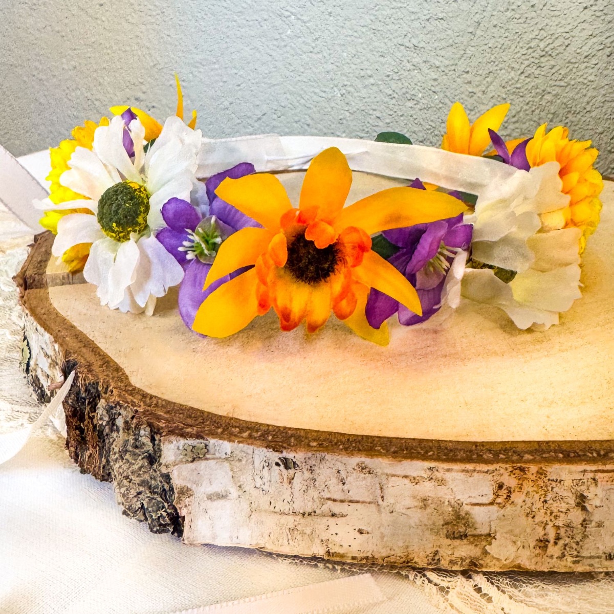 Hairband: First, you will need two white decorative ribbons (different widths) about 1.5 m long. Find the centre point and attach the narrower decorative ribbon to the wide decorative ribbon with a hot glue gun, about 25 cm in each direction. Reinforce the underside of the ribbon with white paper wire, which is also attached with the hot glue gun. For a nice finish and a comfortable fit, cover the paper wire with wide decorative ribbon. About 10 cm of paper wire should still be visible on each side. Now use the flowers and leaves that are not needed from the bouquet and wreaths. You will also need a new chrysanthemum branch and a decorative basket branch. Cut the eucalyptus leaves into smaller pieces, removing the plastic stem from the underside of the leaves. Cut the decorative basket with its large round petals into a sunflower shape by simply cutting the petals into a pointed shape and colouring the pistil with a black pen. The chrysanthemum and daisy flowers consist of several overlapping rings of petals. Remove the largest rings at the bottom to make the flower smaller. You can glue the flower back together with the hot glue gun. Now everything is ready. The ribbon can now be glued to the eucalyptus leaves. Next, decide on the order in which you want the flowers to appear. Start with the middle flower and then alternate between adding another flower to the right and then to the left. Allow everything to dry thoroughly.