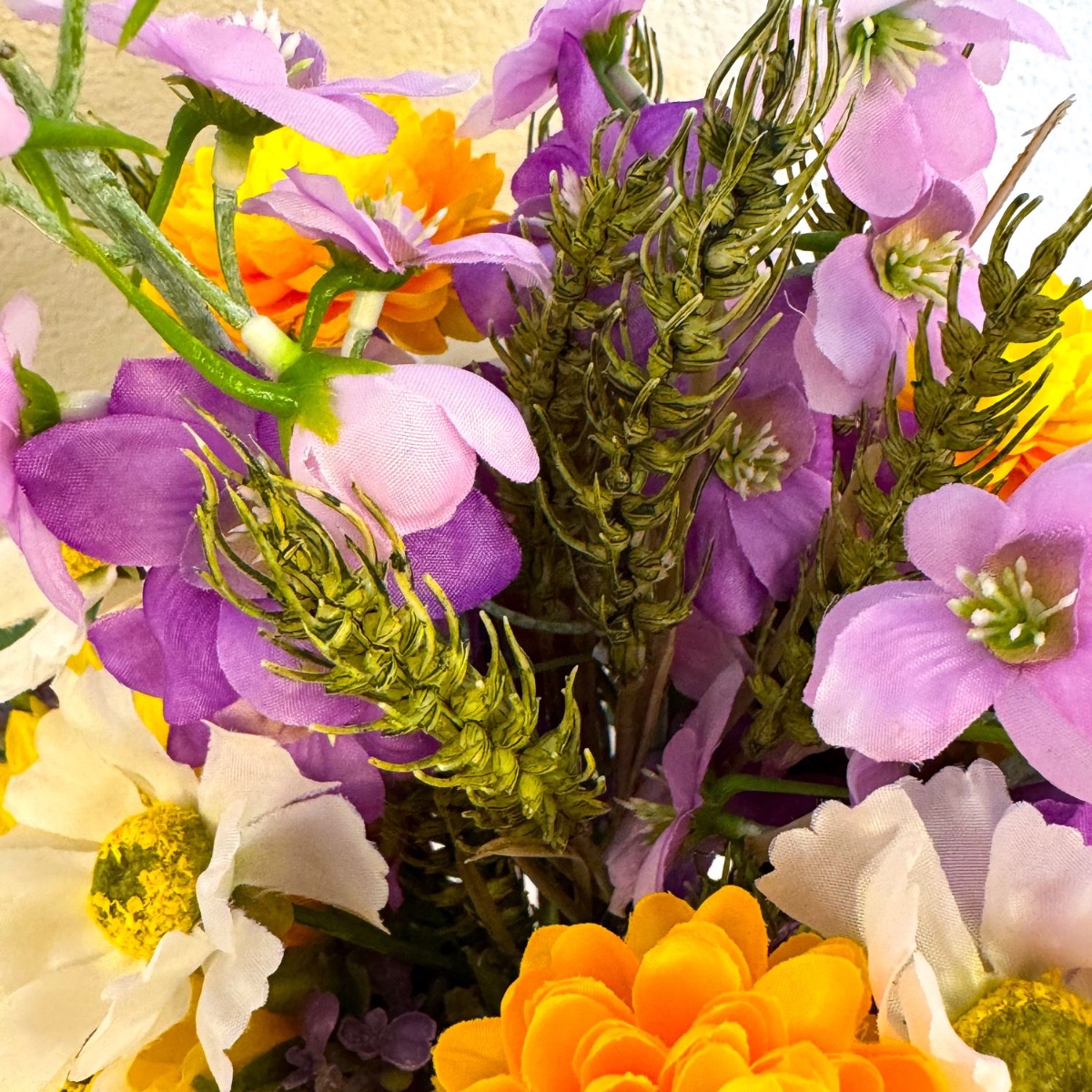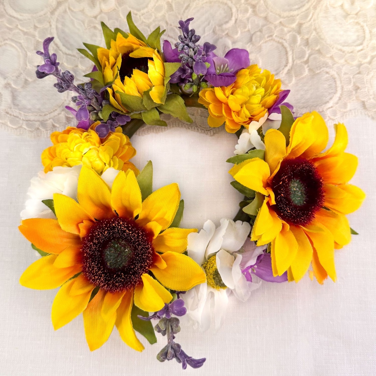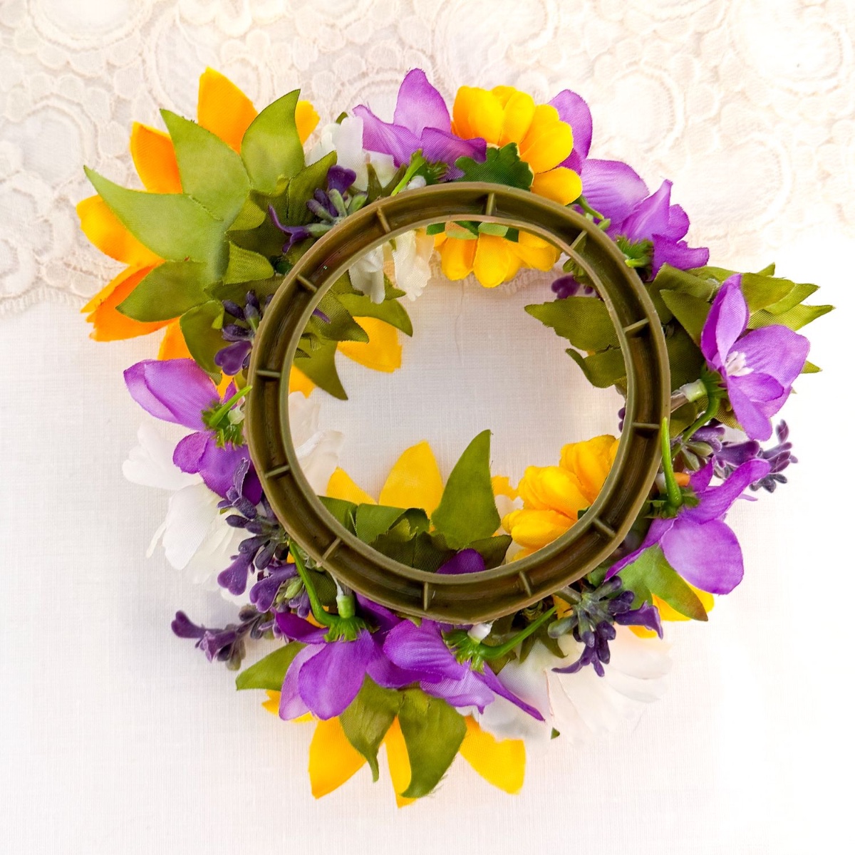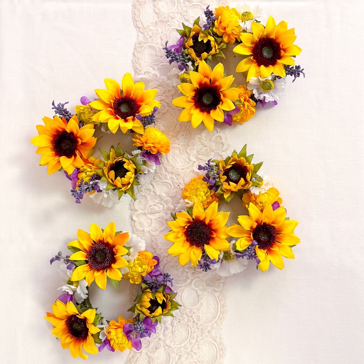 Four candle wreaths: Ready-made rosaries were used for this. We removed the roses and trimmed the stems a little narrower in preparation for re-decorating, so that the new flowers can be attached more easily. We already have some delphinium flowers left over from the bouquet, followed by sunflowers, lavender, chrysanthemums and daisy flowers. We remove all of them from the stems and start sticking them in with the sunflowers, then fill in the gaps with the other flowers, alternating colours. Most of the flowers stay in place on their own, but the rest were fixed with hot glue.