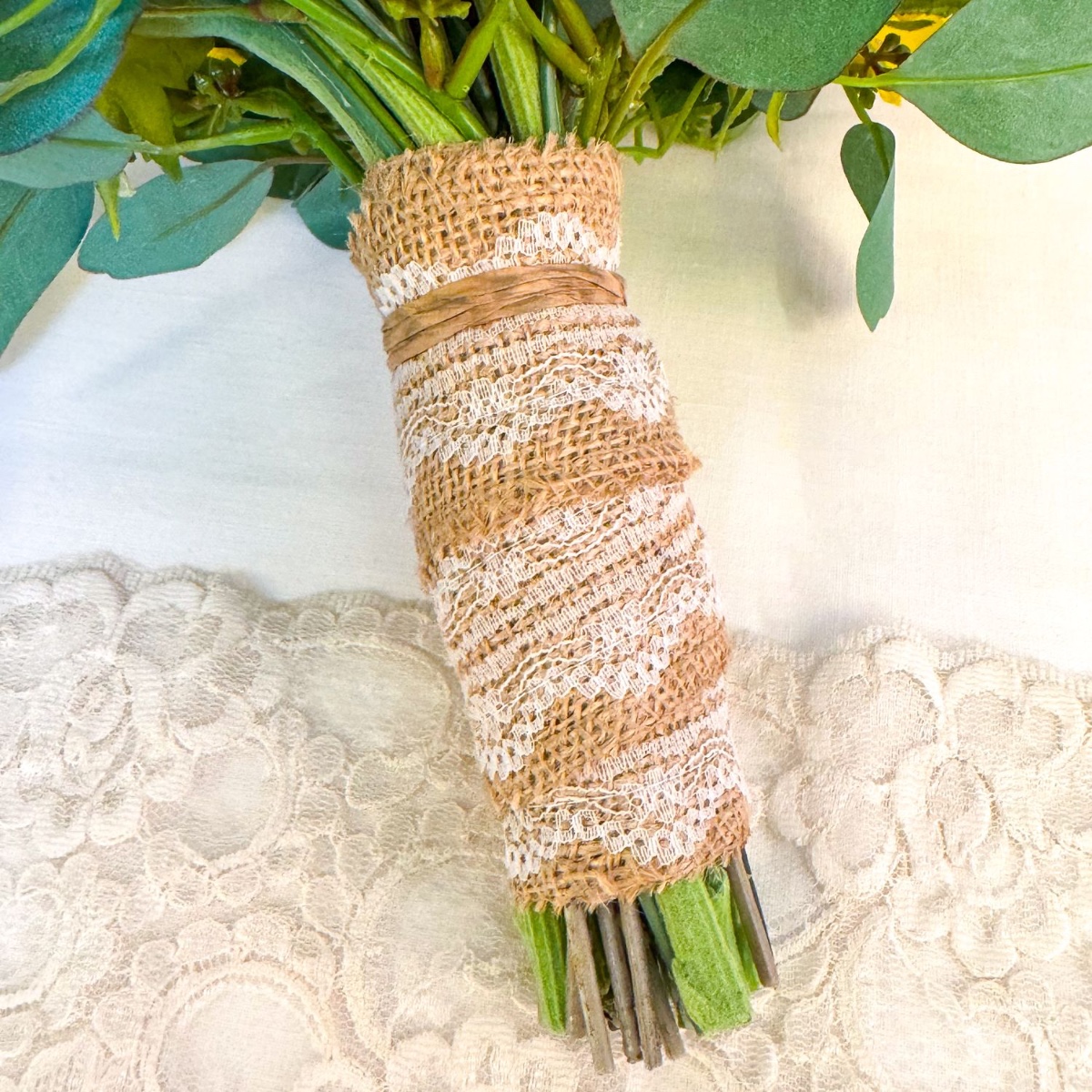 Bridal bouquet: Start by cutting the individual branches into smaller pieces by dividing them at the forks. Some leaves will now be too low on the stem and need to be removed. The stems are then shortened to about one and a half hand widths and wrapped with ribbon, with the flowers and leaves starting above the ribbon. With the delphinium, individual rows of flowers are removed from the lower section to reduce the length and create a small, compact bouquet. The delphinium and wheat form the centre of the bouquet, followed by a chrysanthemum branch and two daisy branches, which are arranged evenly. Now it's time for the star of the bouquet, the sunflowers, with a lavender flower between each one. Finally, the eucalyptus is added. We wrapped the stems with a jute ribbon with lace and then trimmed the stems to the same length about 2 cm below the ribbon.