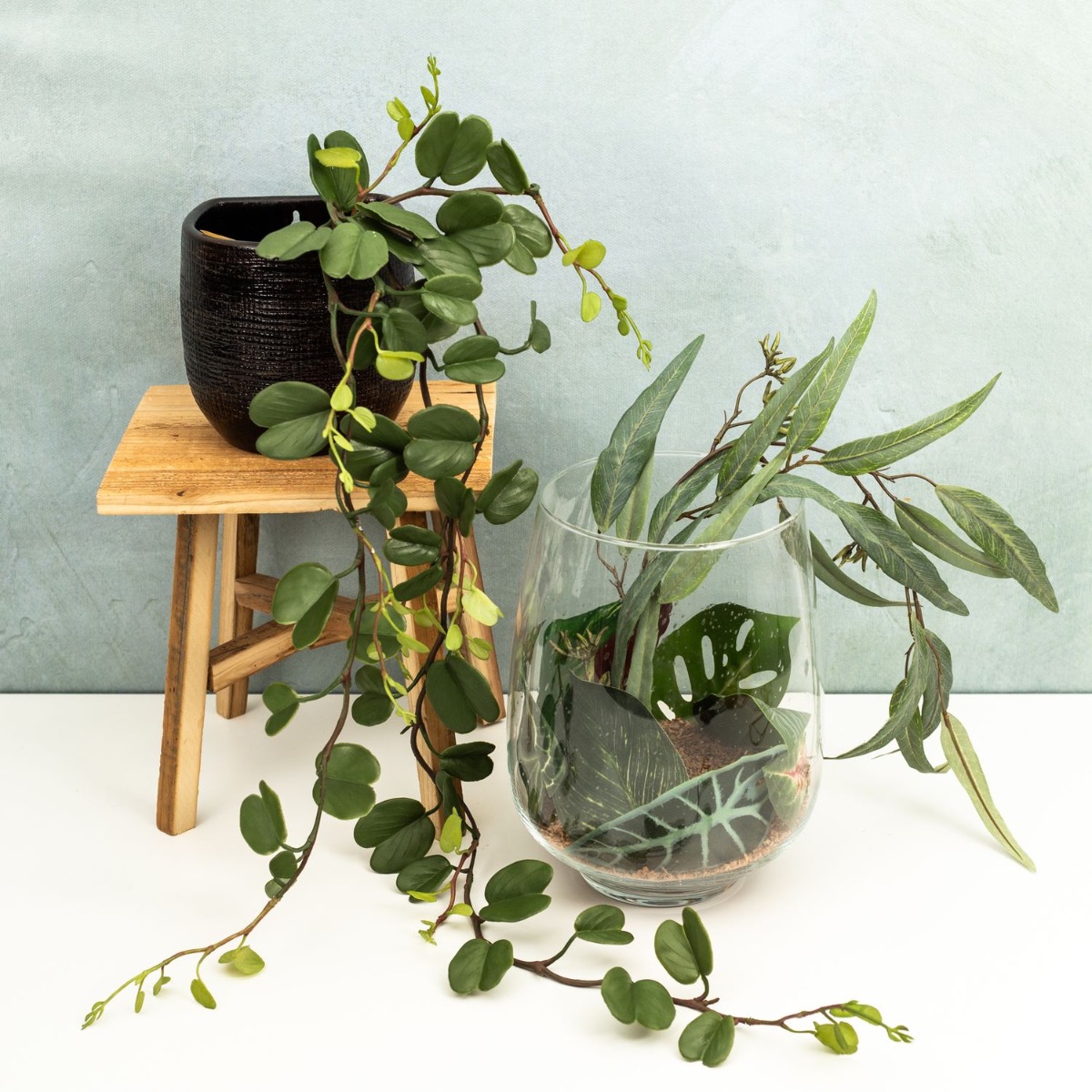 Green - calming and beautiful! Whether in the office or at home, green always has a calming effect. If you look at a green plant, it has a calming effect on your eyes and therefore also on your mood. That's why we think you should have a green plant in every room, in every corner, upstairs and downstairs, back and front. This look is suitable for windowsills or small areas such as shelves or chests of drawers. This look is also great on the floor. Sometimes simple things are the most beautiful. A vase filled with leaves and cork granules is easy to recreate even for the uncreative among us. We have combined a hanging plant with this look, which stands on a pretty-looking plant stool. Shop the Look!