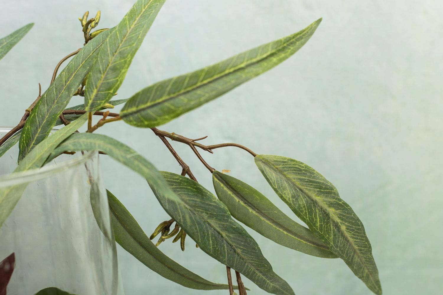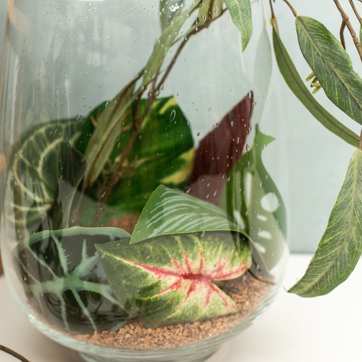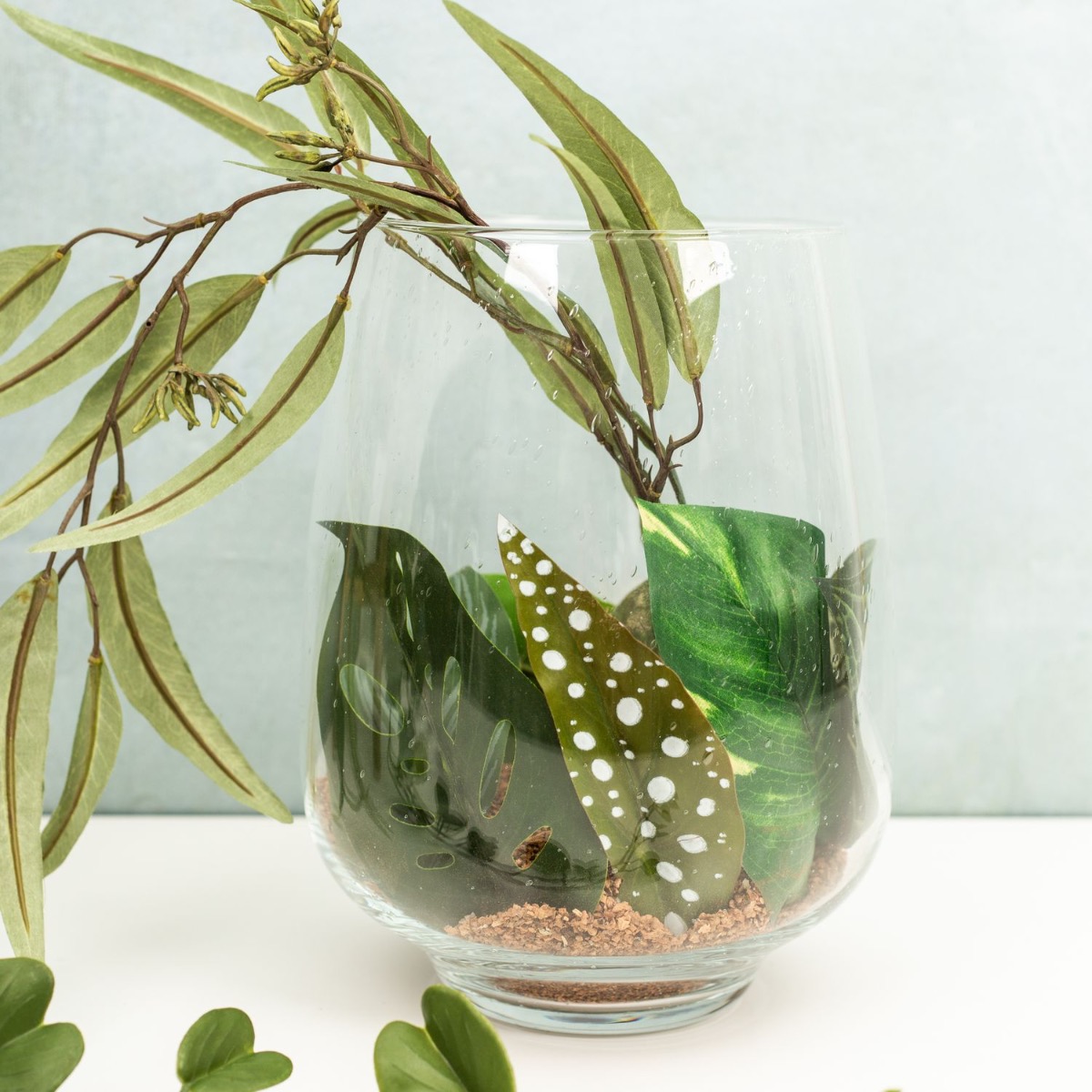 Design tip: First fill the cork granules into the large jar and then place various leaves inside. The leaves can easily be pulled off the stems or cut with a side cutter. Place the leaves so that the top is visible. A branch of eucalyptus is inserted in the middle and sticks out of the jar. Finished is the jungle look!