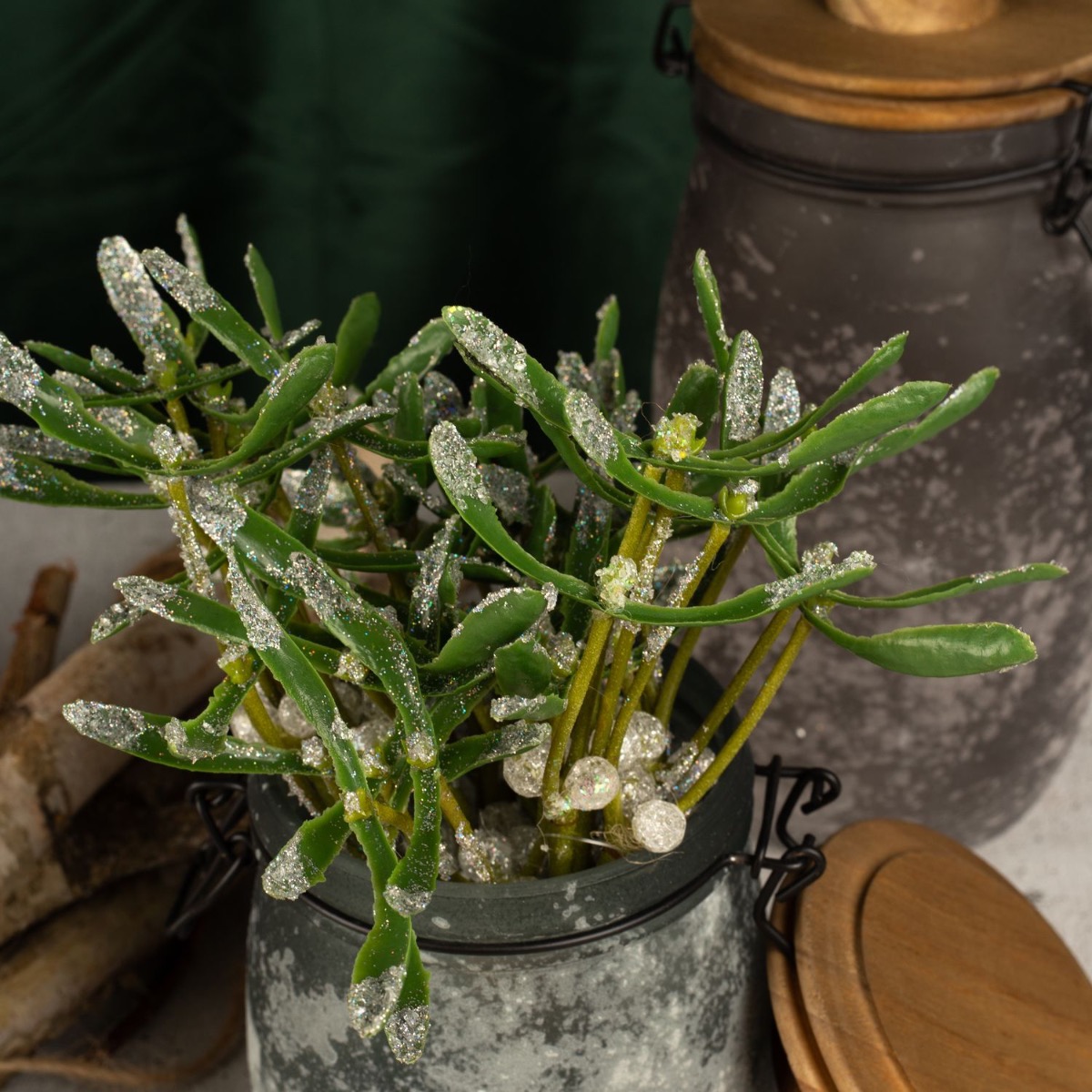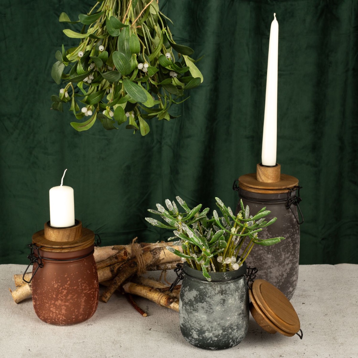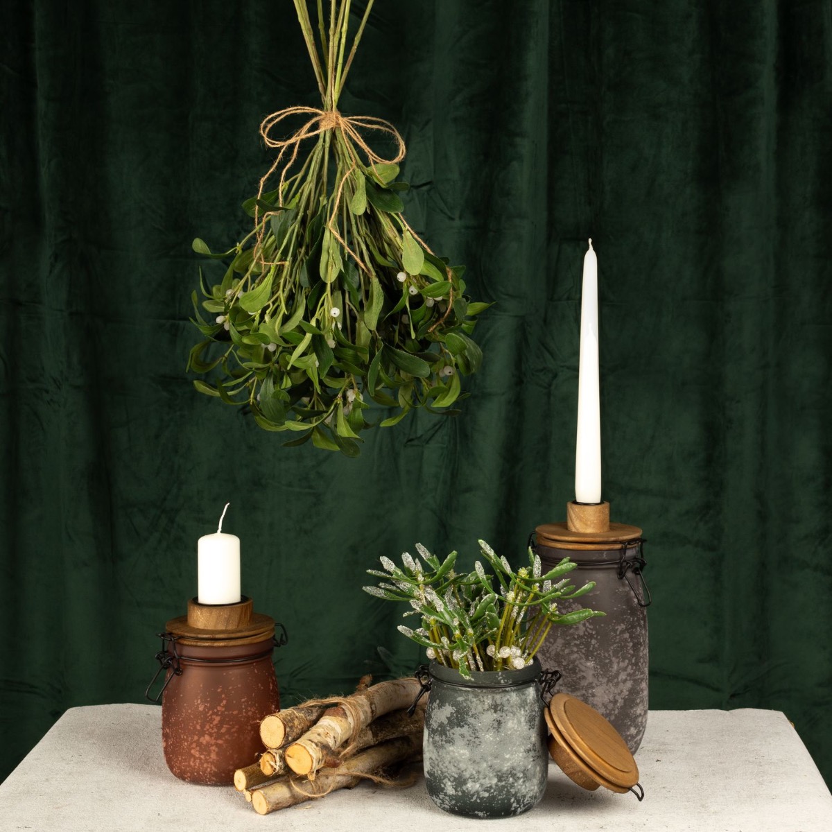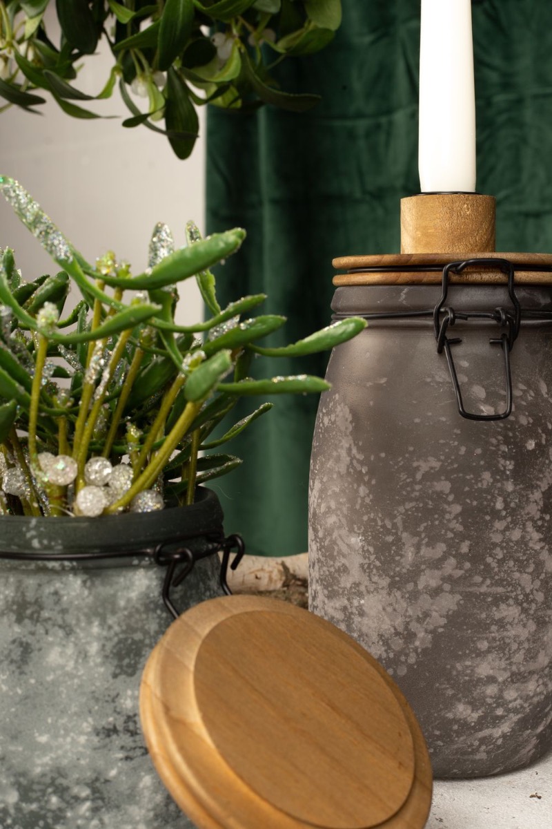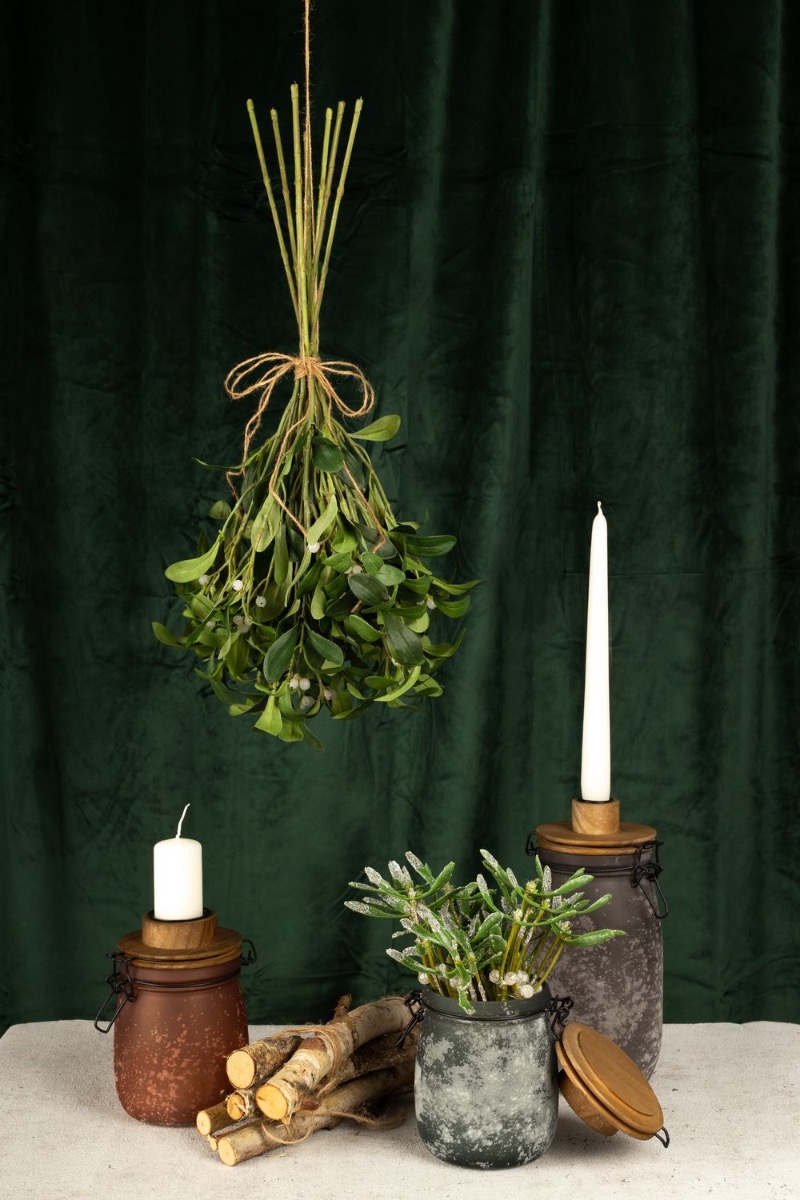 Tradition and shabby chic! Our candle holders in a wintery shabby chic design are perfect for a festive winter decoration. The dual function of these storage jars is particularly practical. Once used as a candle holder and once as a vase for our snowy mistletoe bundles. With this look, we've done some research into the tradition of mistletoe. Mistletoe is one of the few plants that also bloom in winter and has a truly romantic tradition. If a couple kiss under mistletoe, it brings good luck. If a single woman stands under mistletoe, she must not refuse a kiss. So all you single women out there! Shop the look!
