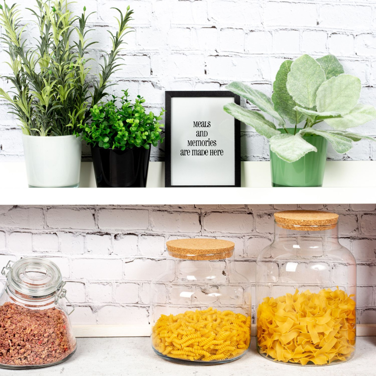 Decorative kitchen jars! The colourful herb pots perfectly harmonise with the artificial rosemary, eucalyptus and sage and also brighten up your kitchen shelf. You can also create order with the sealable storage jars. The storage jars are not only beautiful to look at, but untidy drawers, cupboards and shelves with numerous open bags and packages can be stowed in the glasses. Do you also would like to give your kitchen a new shine? Shop the Look!