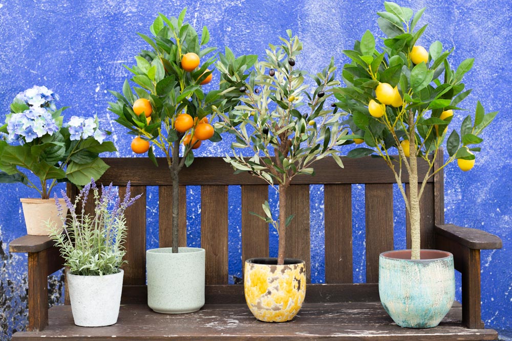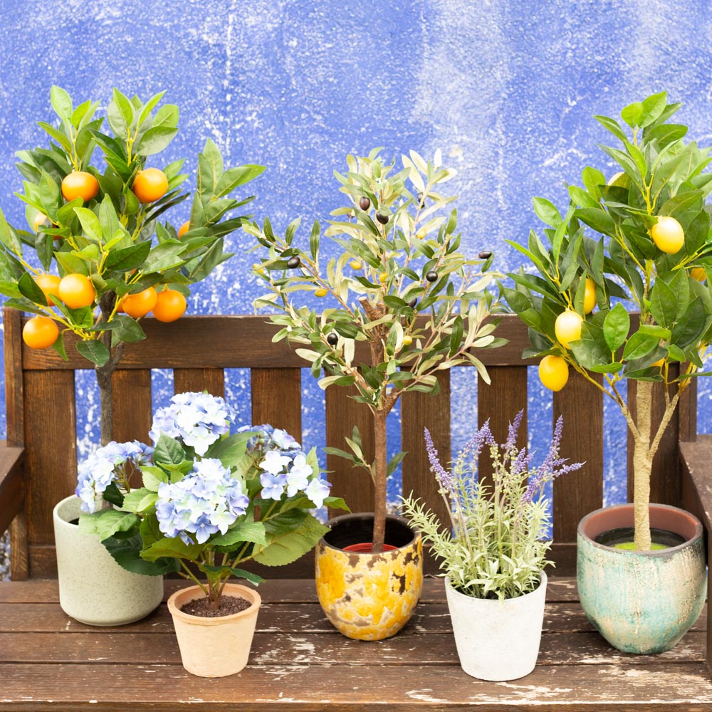 Southern fruit and lavender! An image often seen in southern regions. Bring the charm of the Mediterranean into your home! You'll get a bit of that holiday feeling right away. The little lemon and orange trees look so real, they really make you want to eat fresh fruit. Whether you want to decorate the dining area or the living room, our Mediterranean artificial flowers bring the perfect flair to any room. Shop the Look!