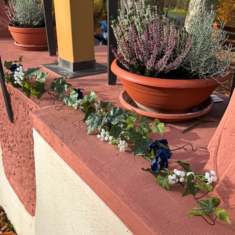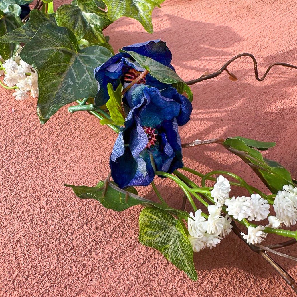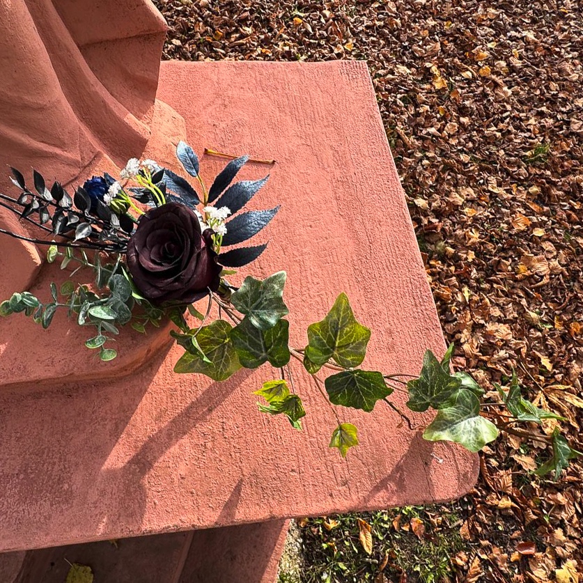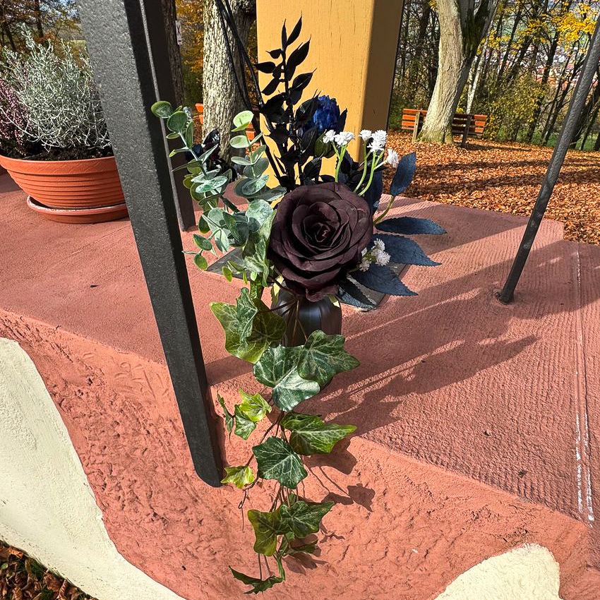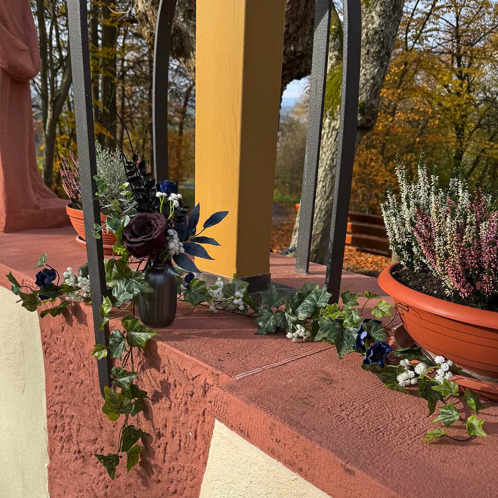 When floral art meets timeless elegance! We had the privilege of designing all the floral arrangements for a dream wedding in the south of France on an idyllic peninsula. The celebration took place in mid-November – a time when elegance and depth in colour design are particularly effective. The client wanted a modern, sophisticated concept in black and dark blue, complemented by subtle white accents for a classic wedding look. All dark blue elements were given a velvety finish, which creates an elegant, warm effect, especially in the cooler months. Small bouquets and delicate garlands decorated the pews, lovingly framing the centre aisle and creating a festive, romantic atmosphere. Would you also like to celebrate your wedding with artificial flowers? Shop the look!